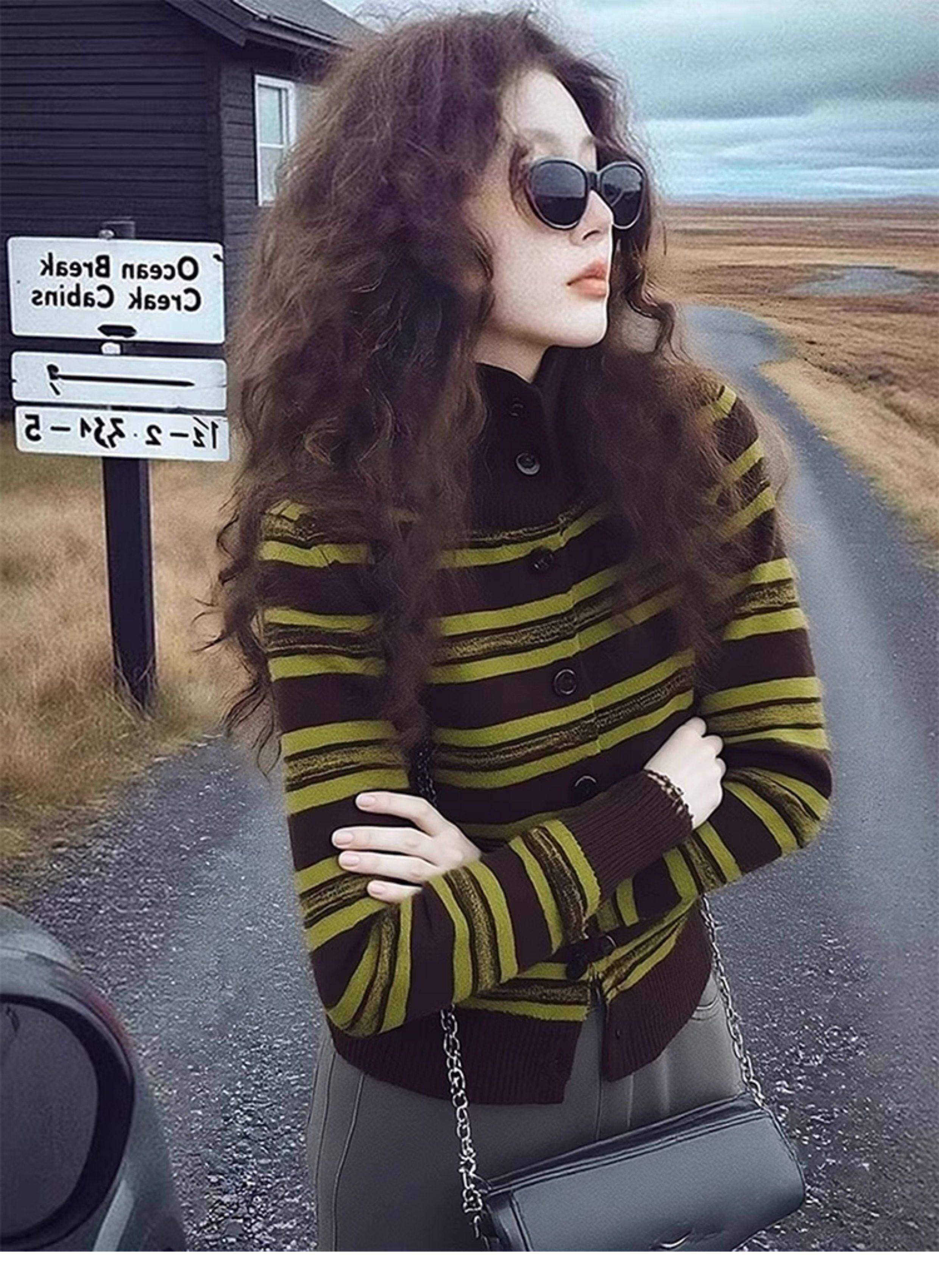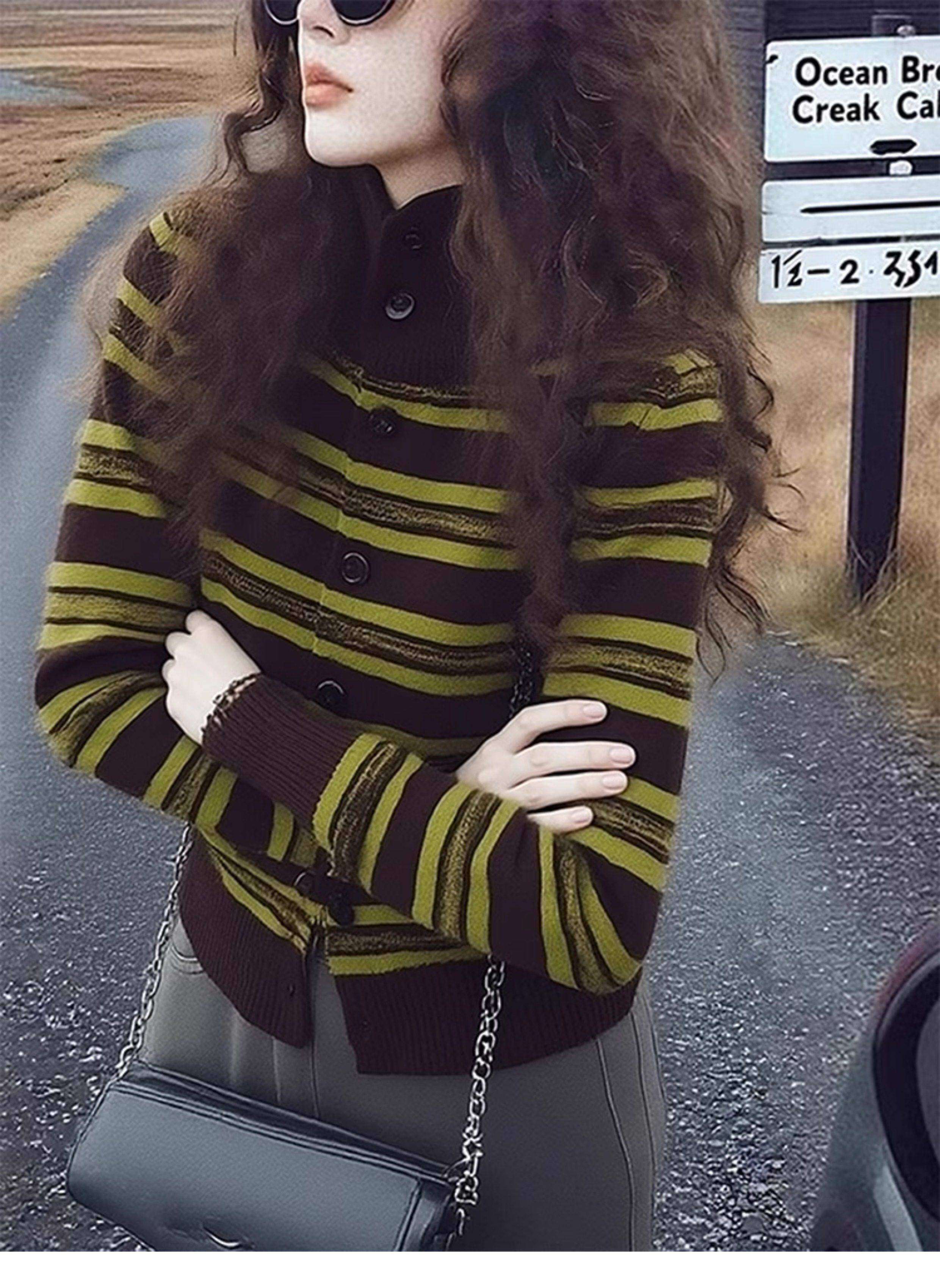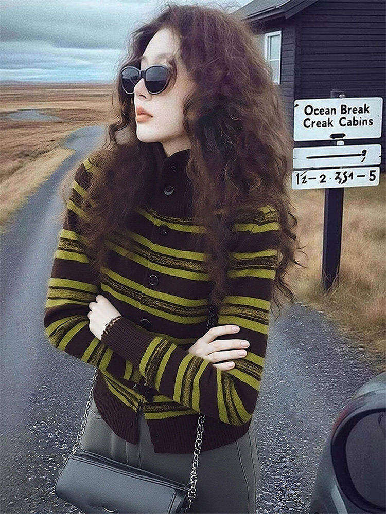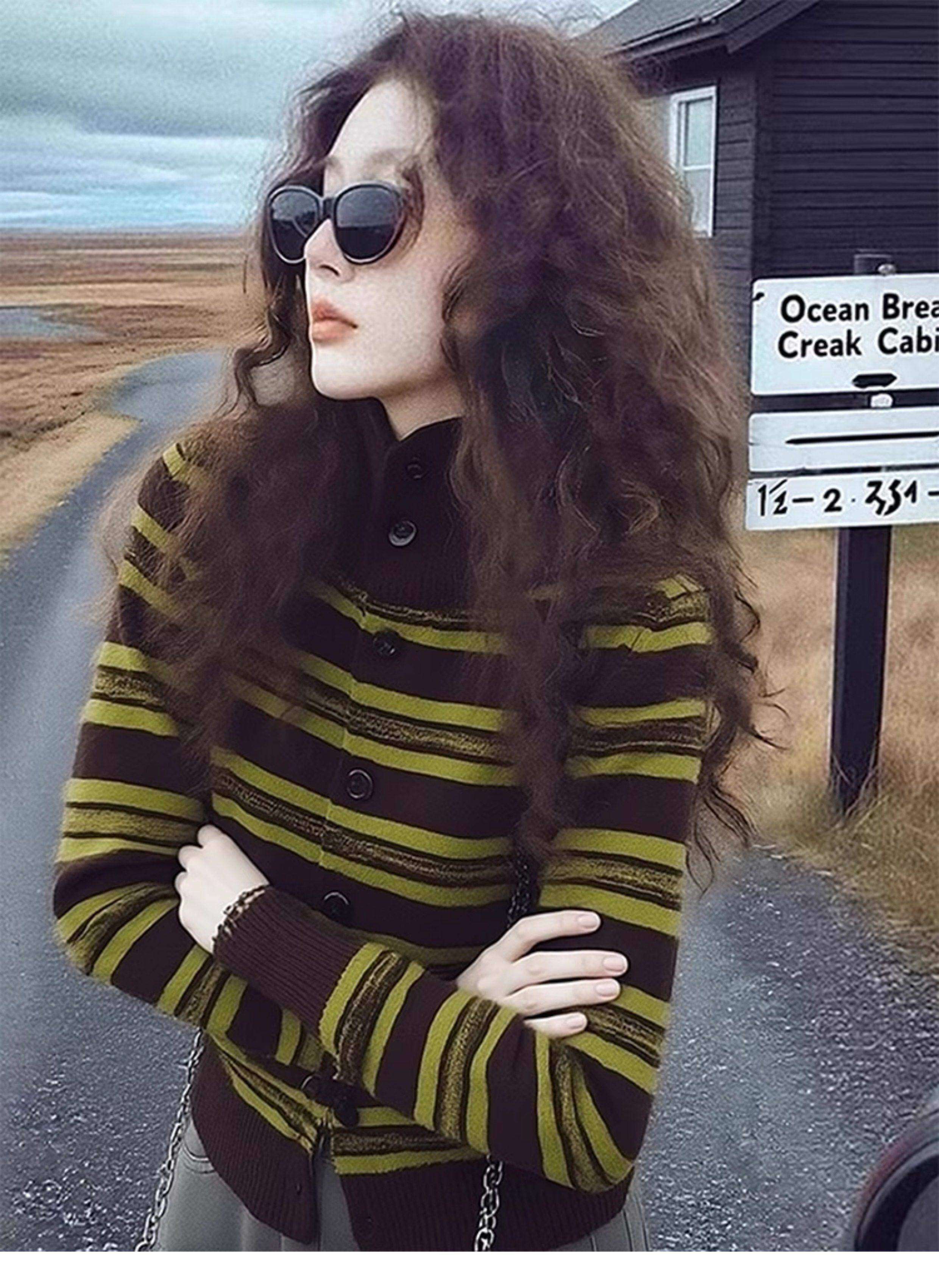 Korean-Style Design, Brown Striped High-Neck Knitted Cardigan for Women, Autumn and Winter High-End Inner Layer Knitted Sweater Top