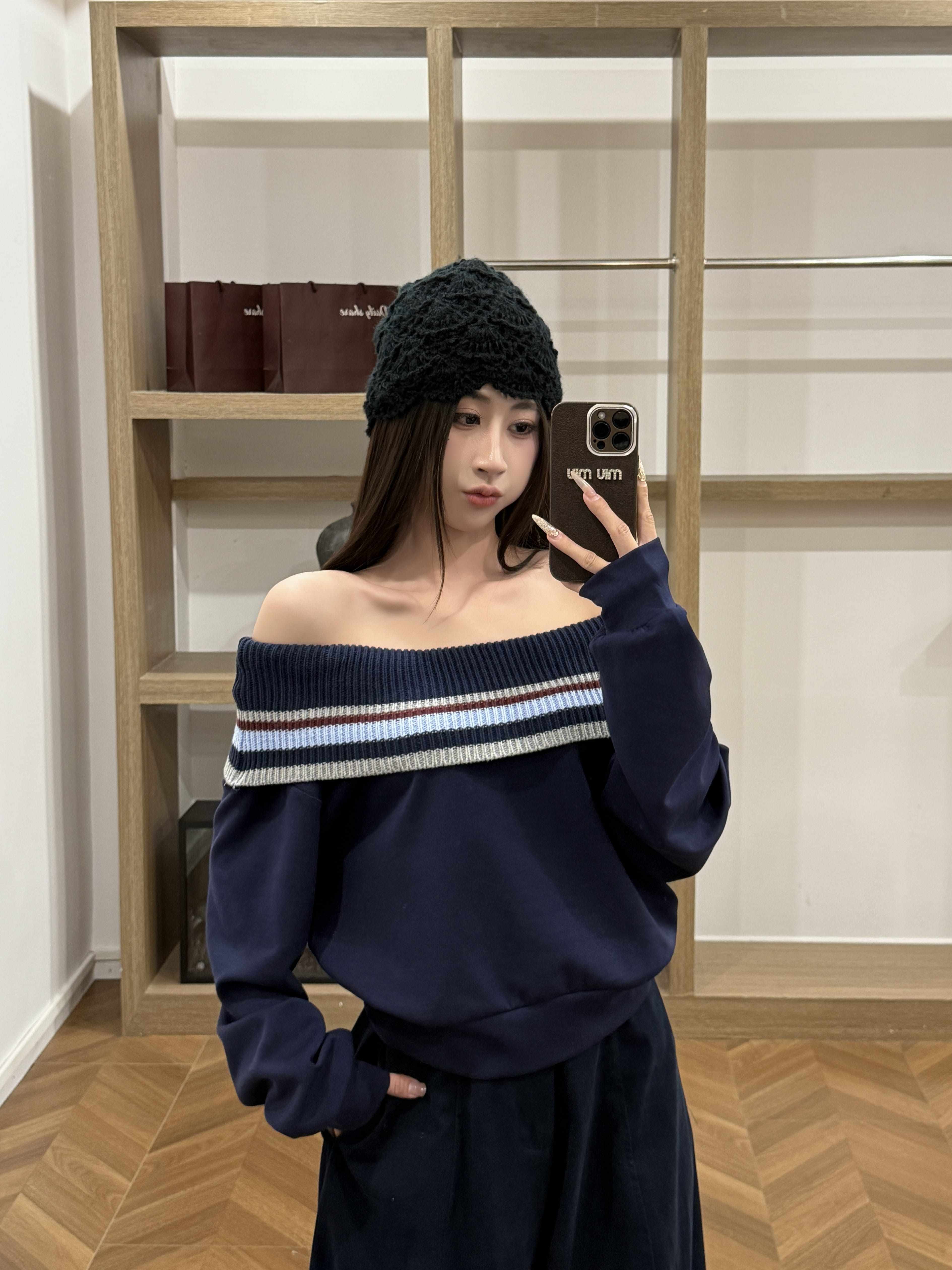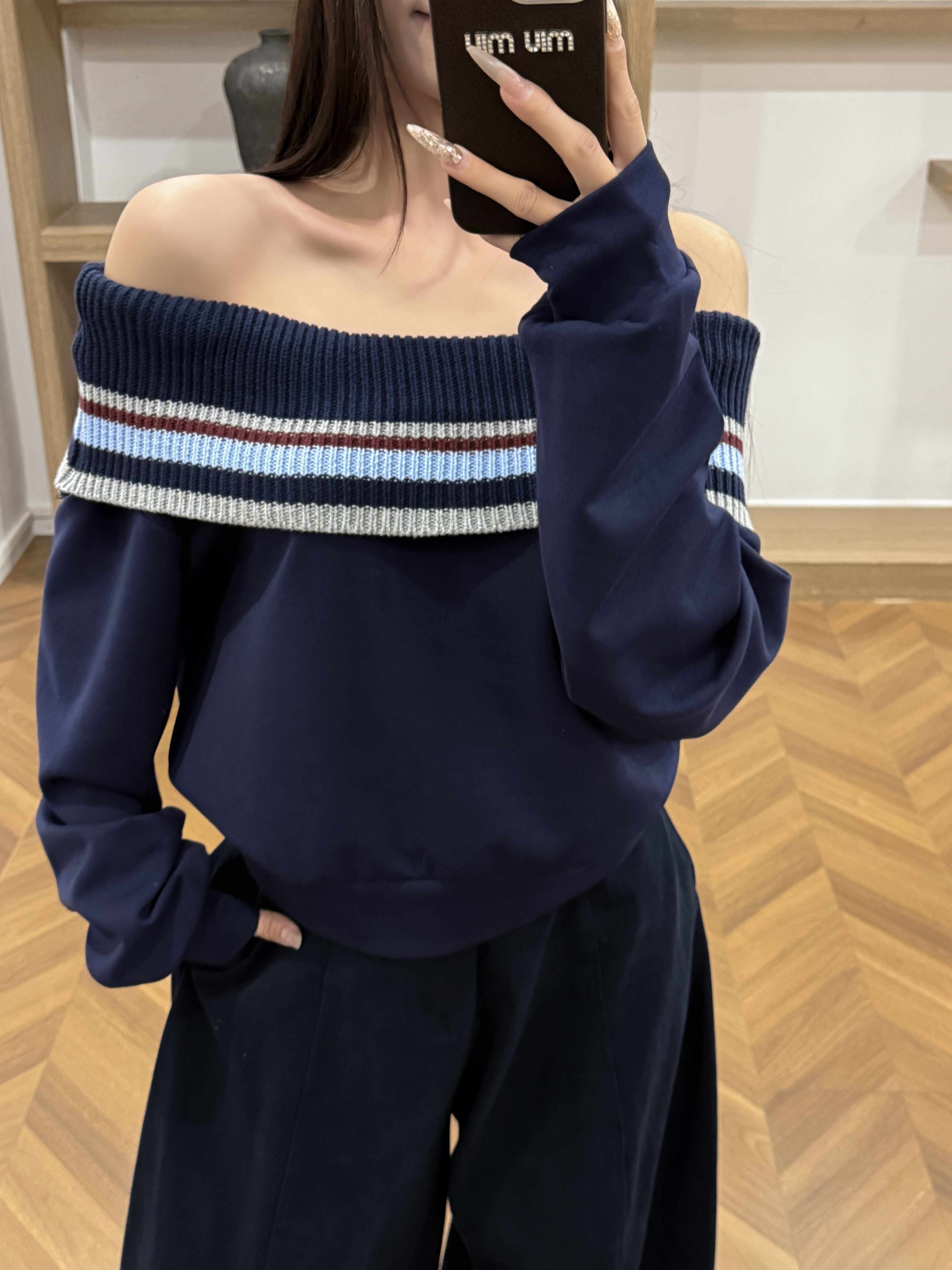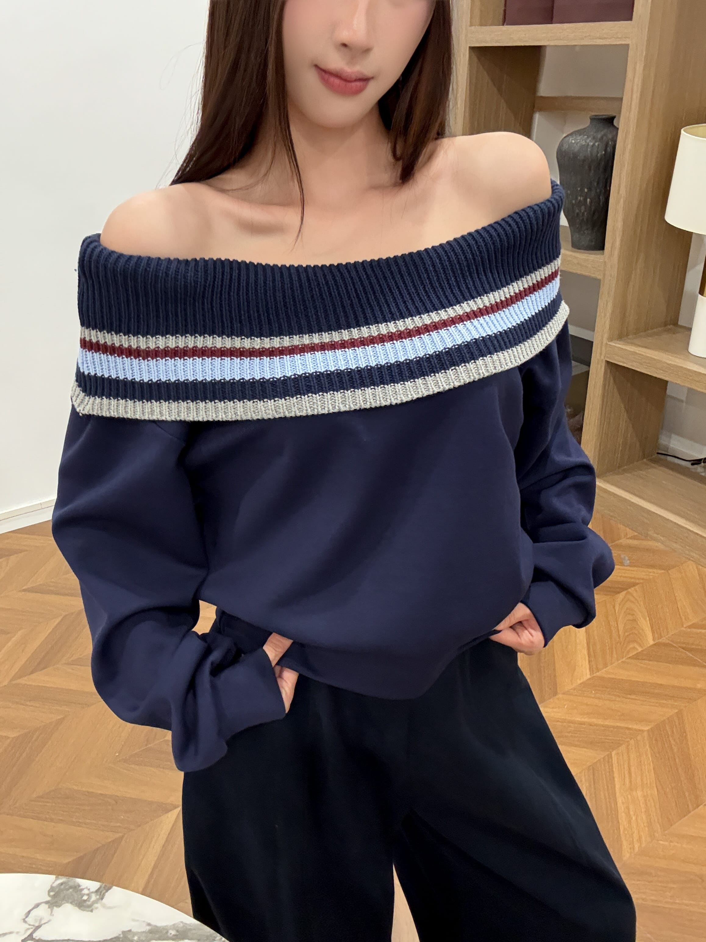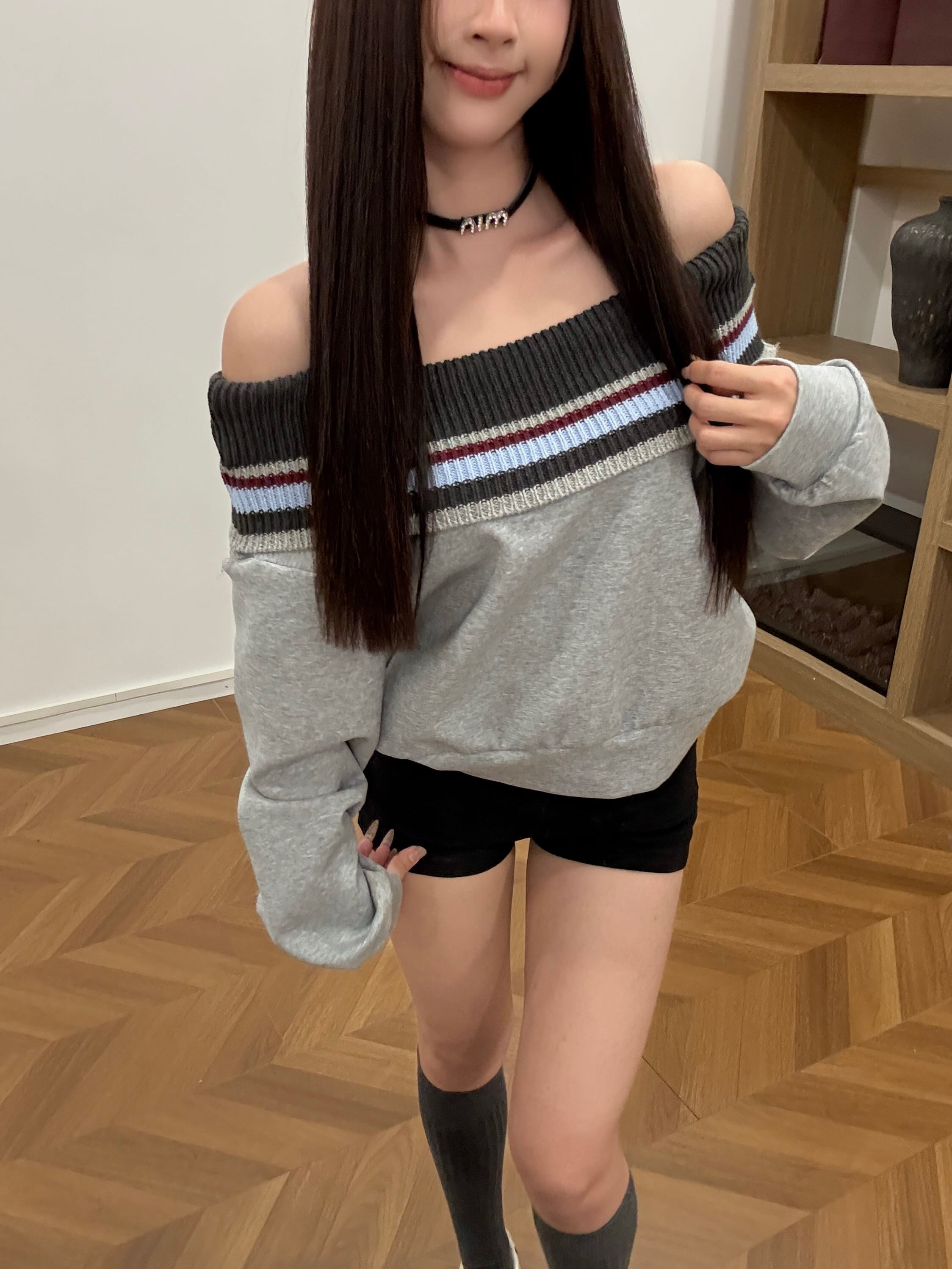 Chic Color-Block Striped Off-Shoulder Knit Patchwork Sweatshirt for Women, 2026 Spring New Loose-Fitting Trendy Top Jacket