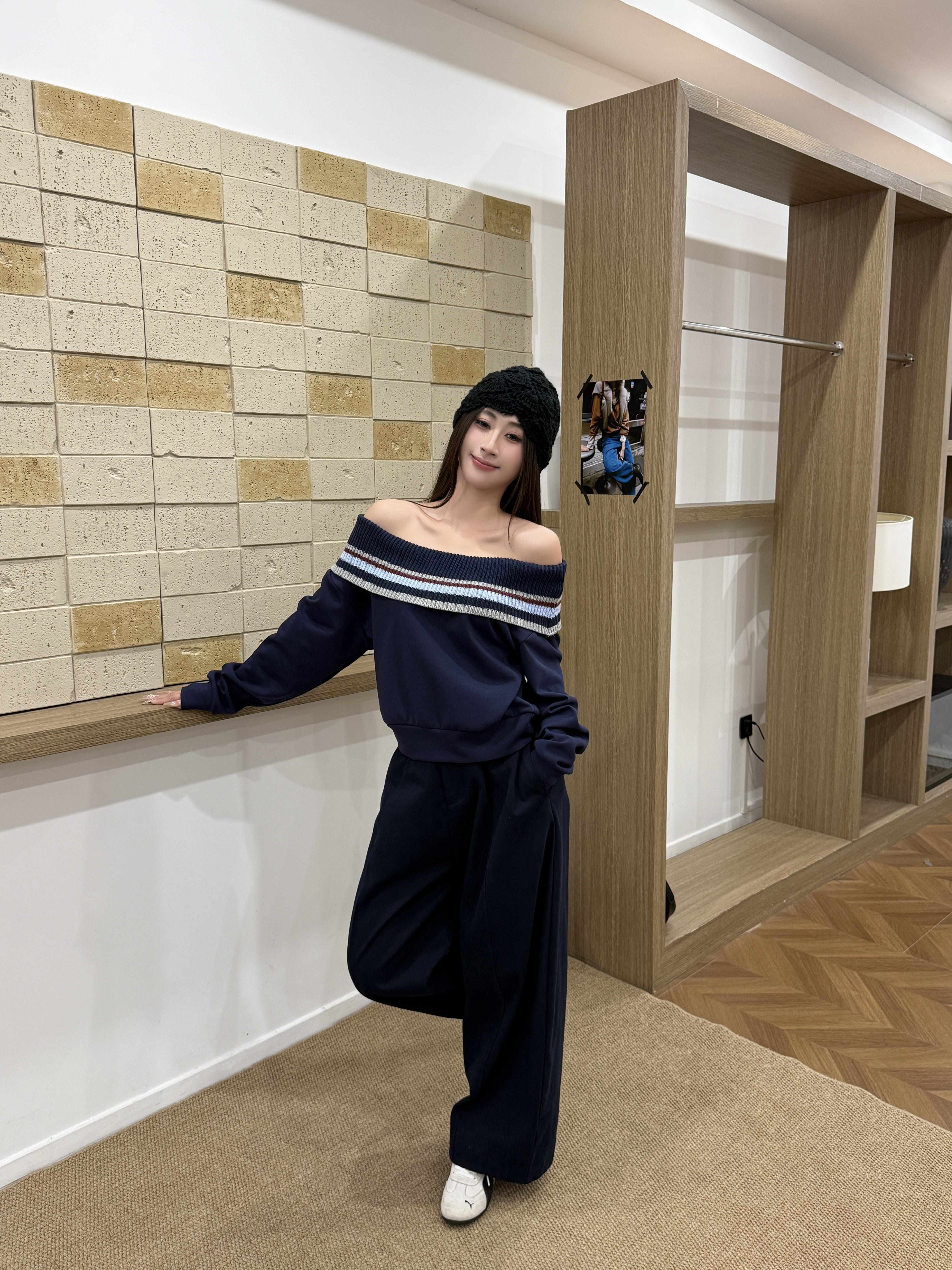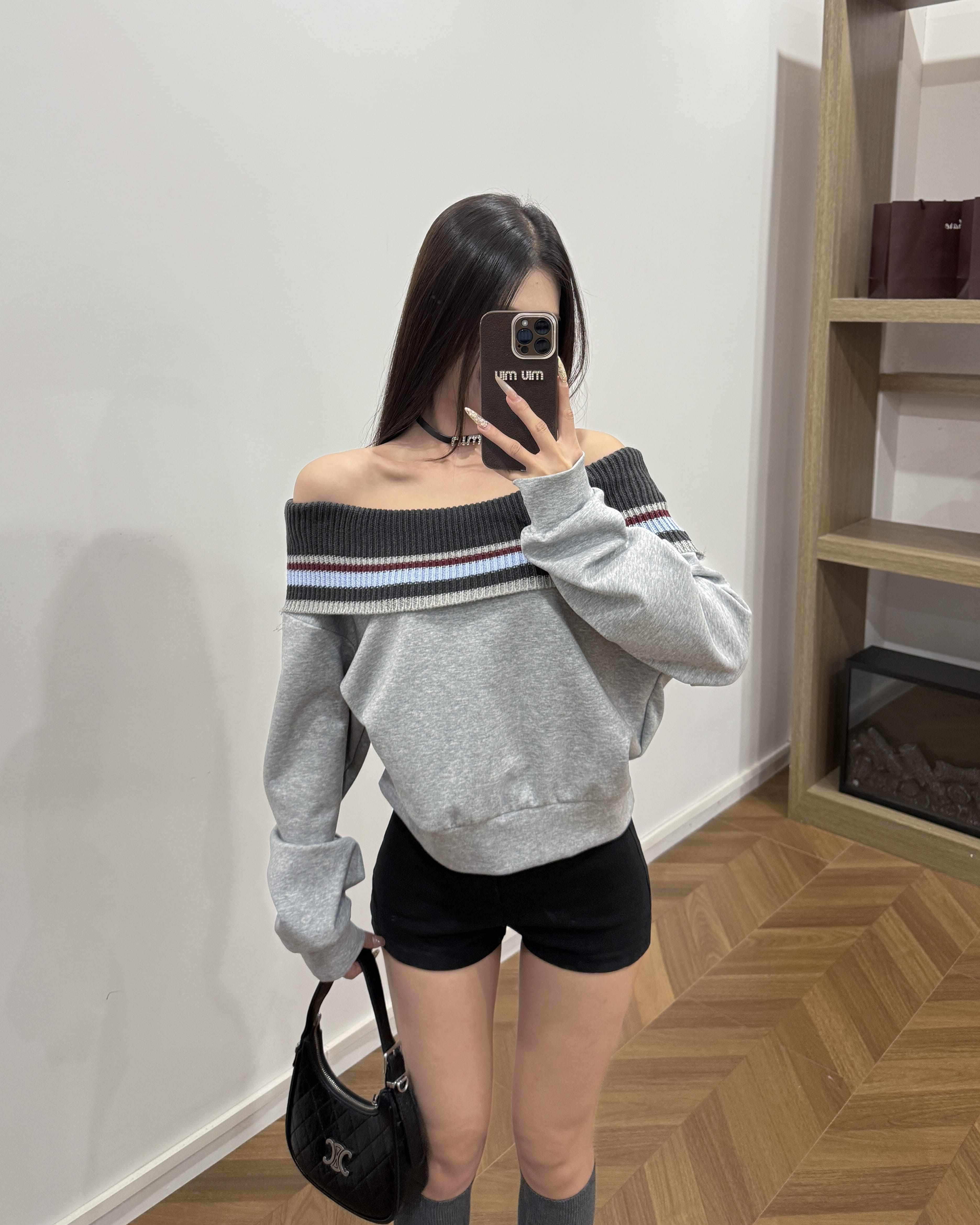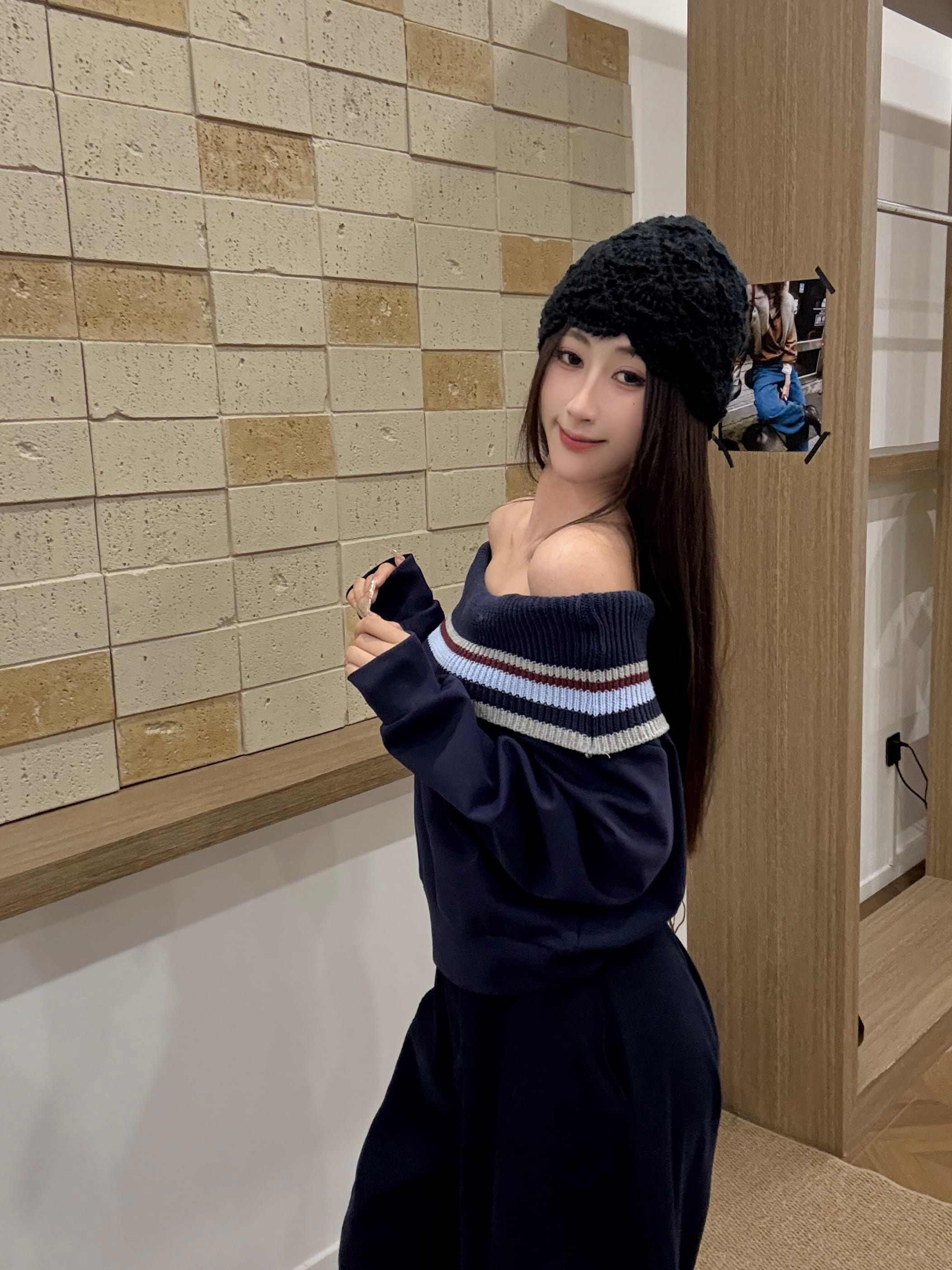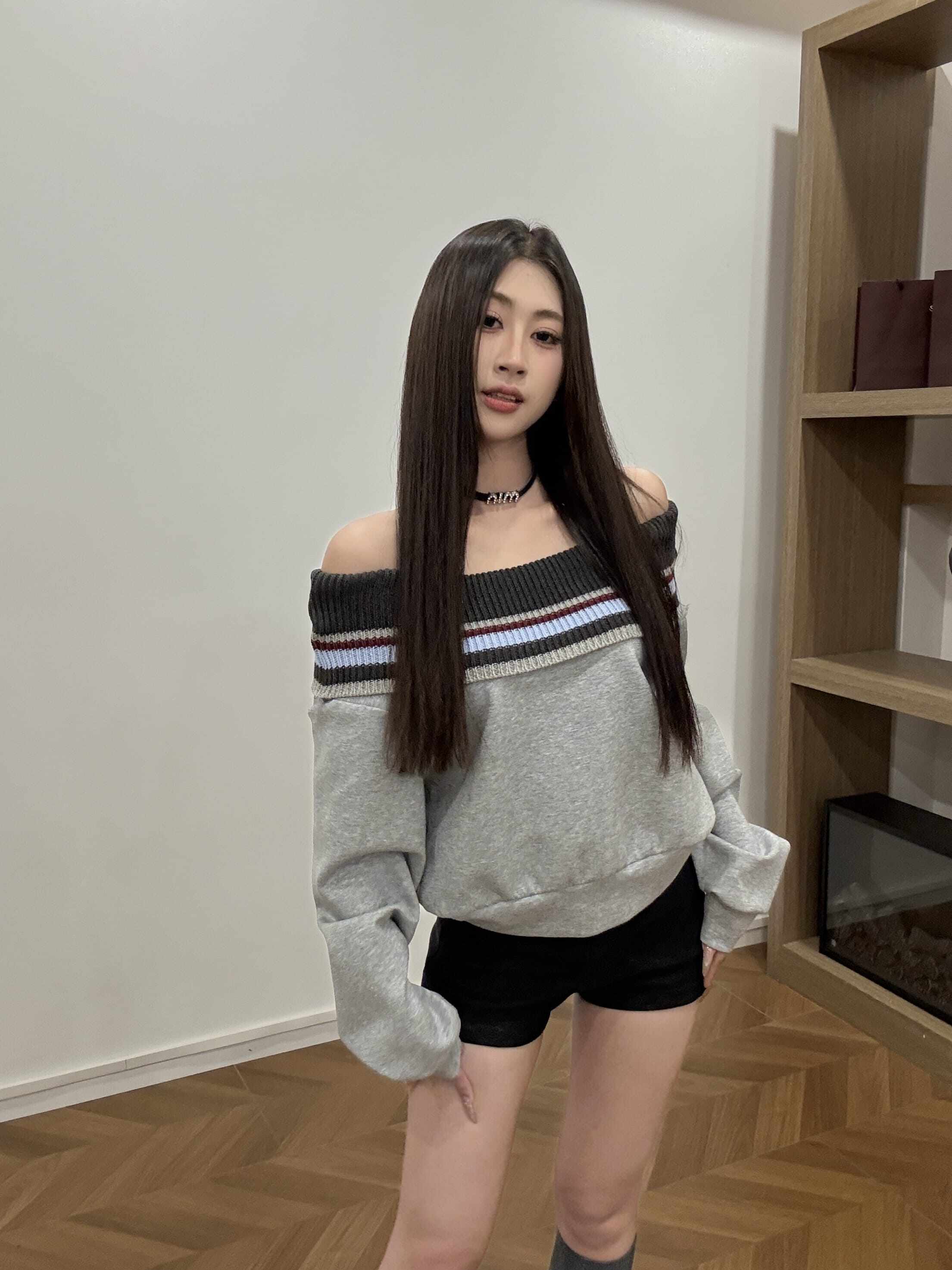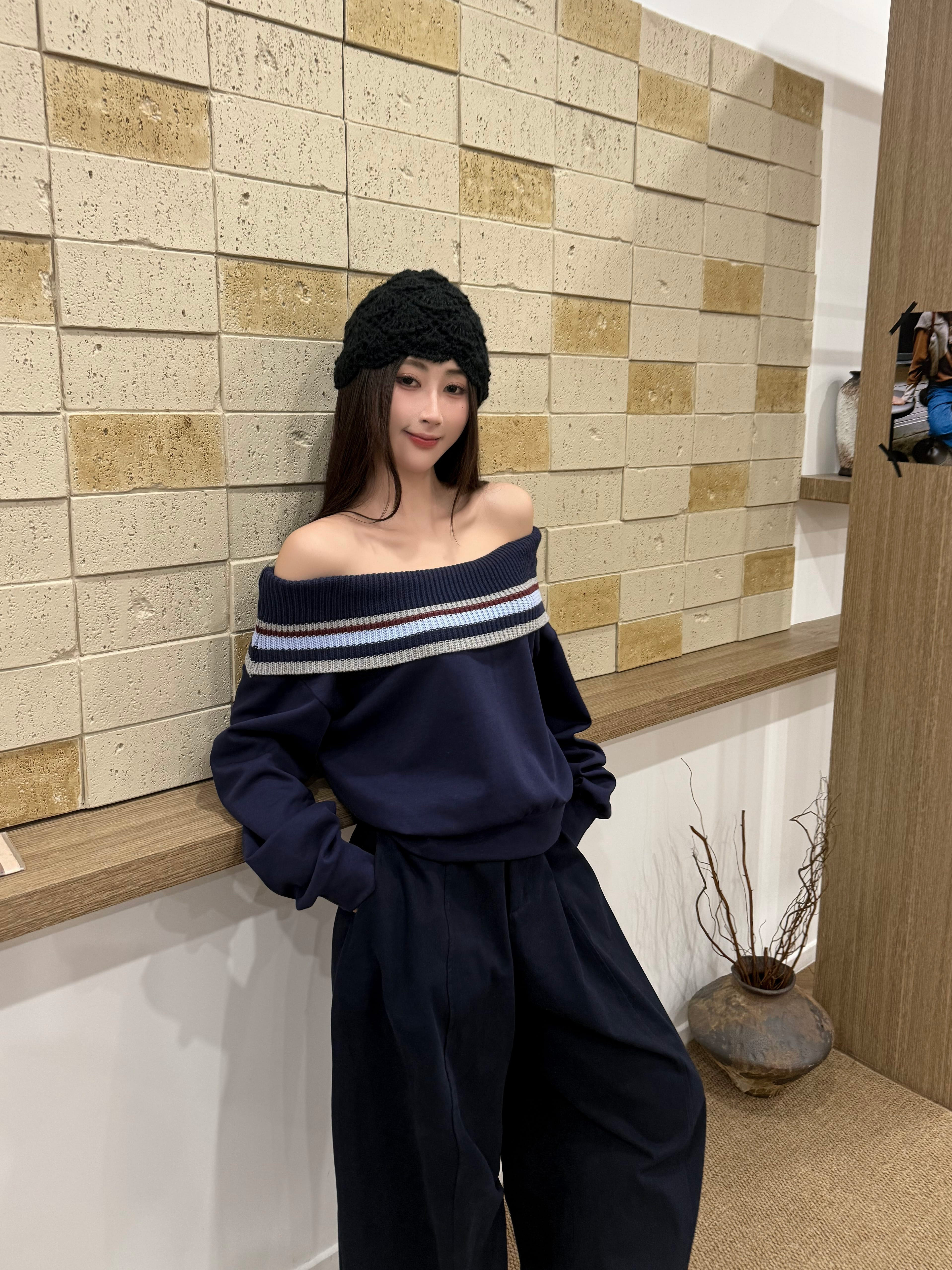 Chic Color-Block Striped Off-Shoulder Knit Patchwork Sweatshirt for Women, 2026 Spring New Loose-Fitting Trendy Top Jacket