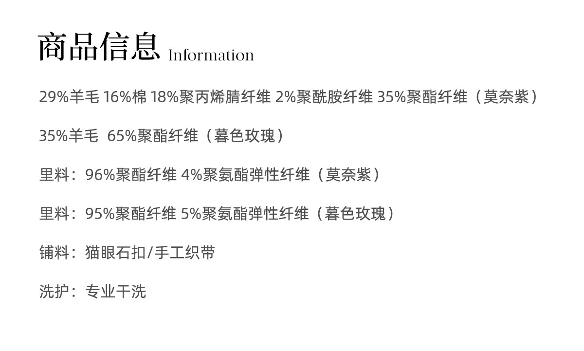 Material Composition 35% Polyester, 29% Wool, 18% Polyacrylic Fiber (Acrylic Fiber), 16% Cotton, 2% Polyamide Fiber (Nylon)