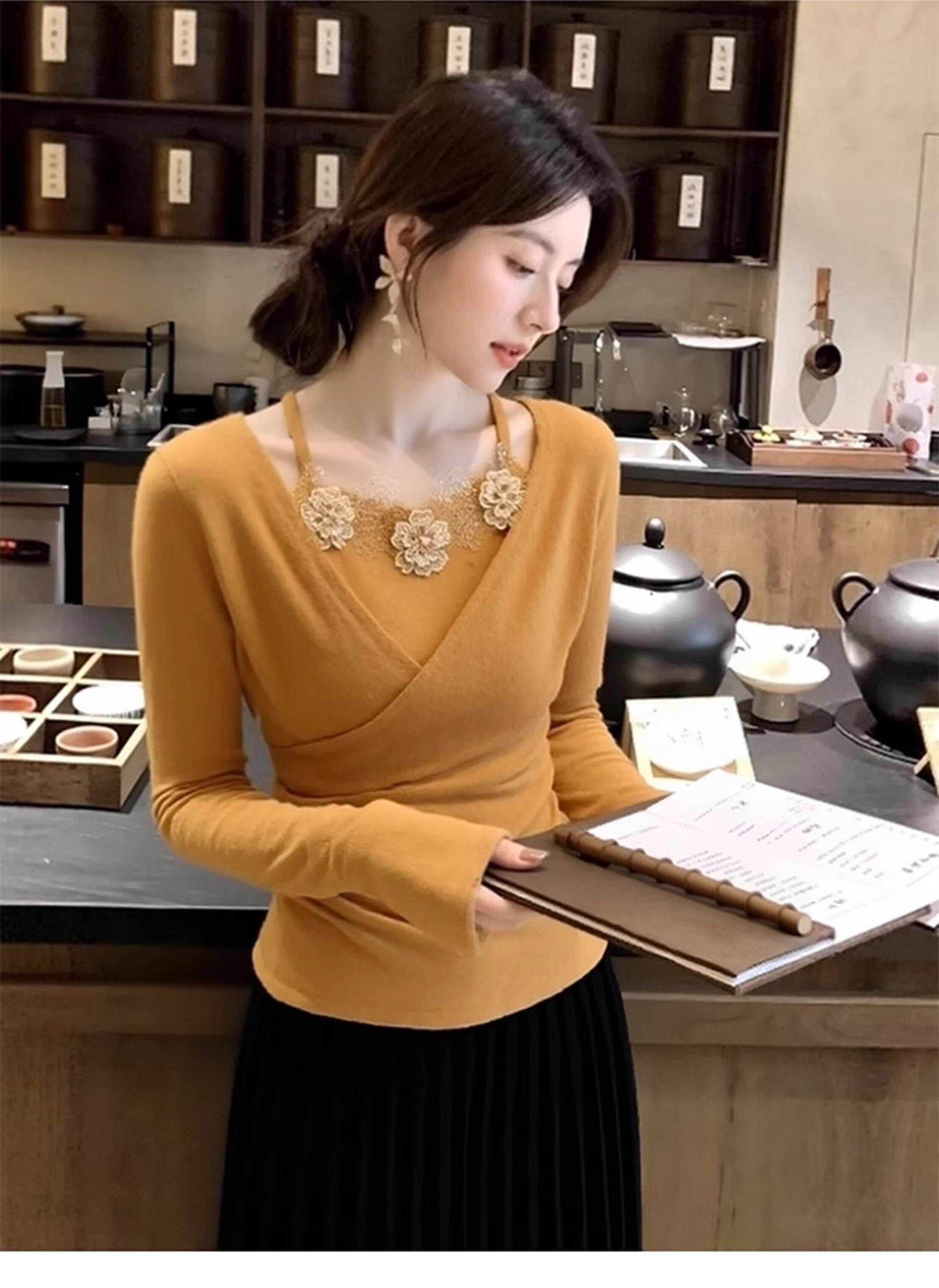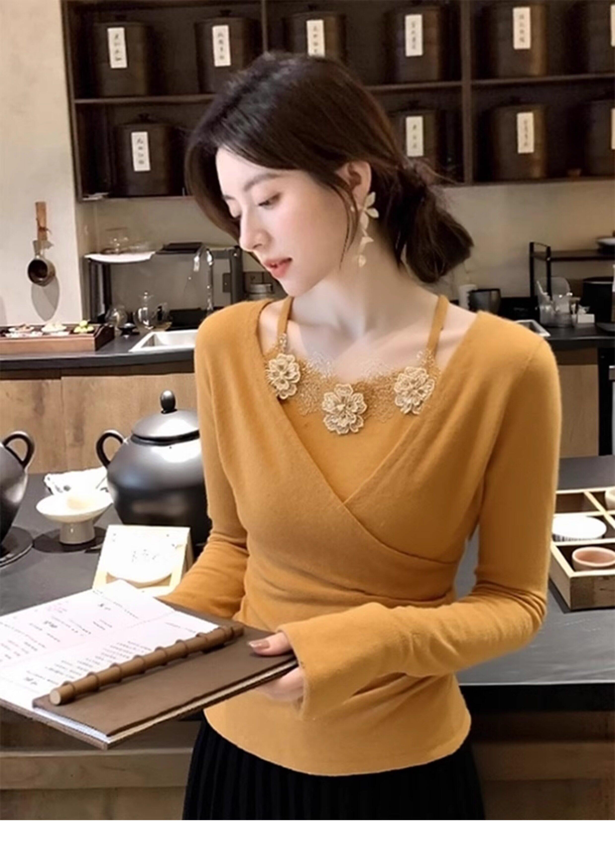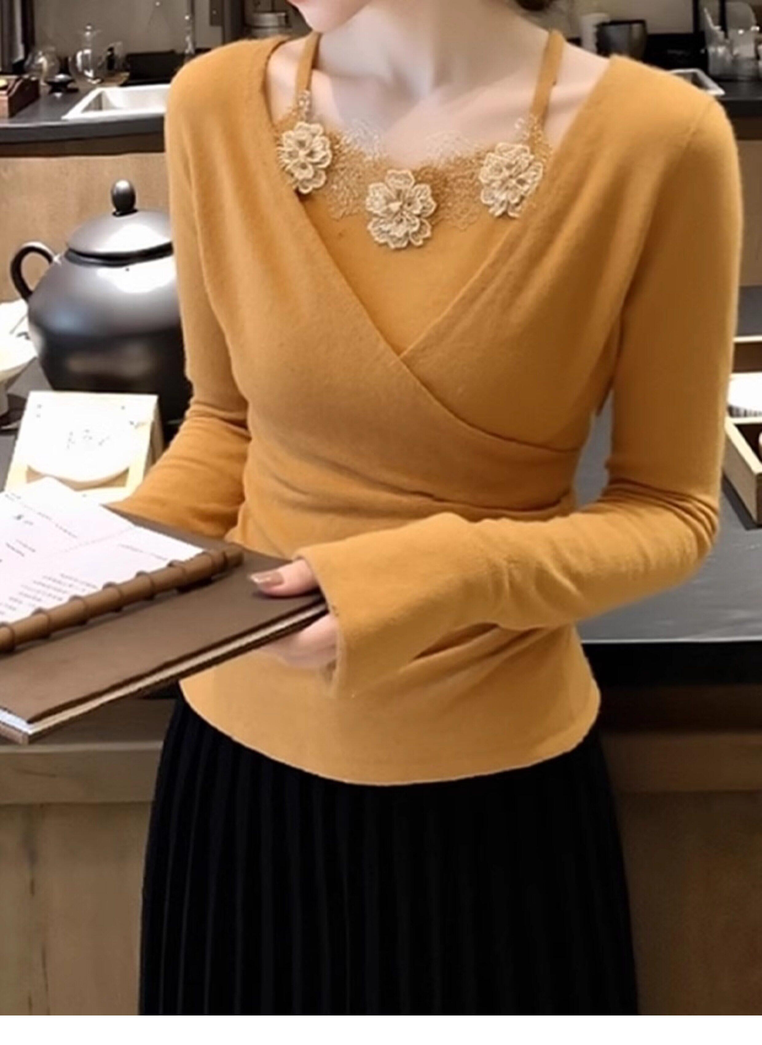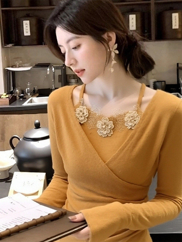 French-Style Yellow Lace Floral Faux Two-Piece Knit Sweater for Women, Stunning and Beautiful for Autumn and Winter, Perfect as a Base Layer and Slim-Fit Top
