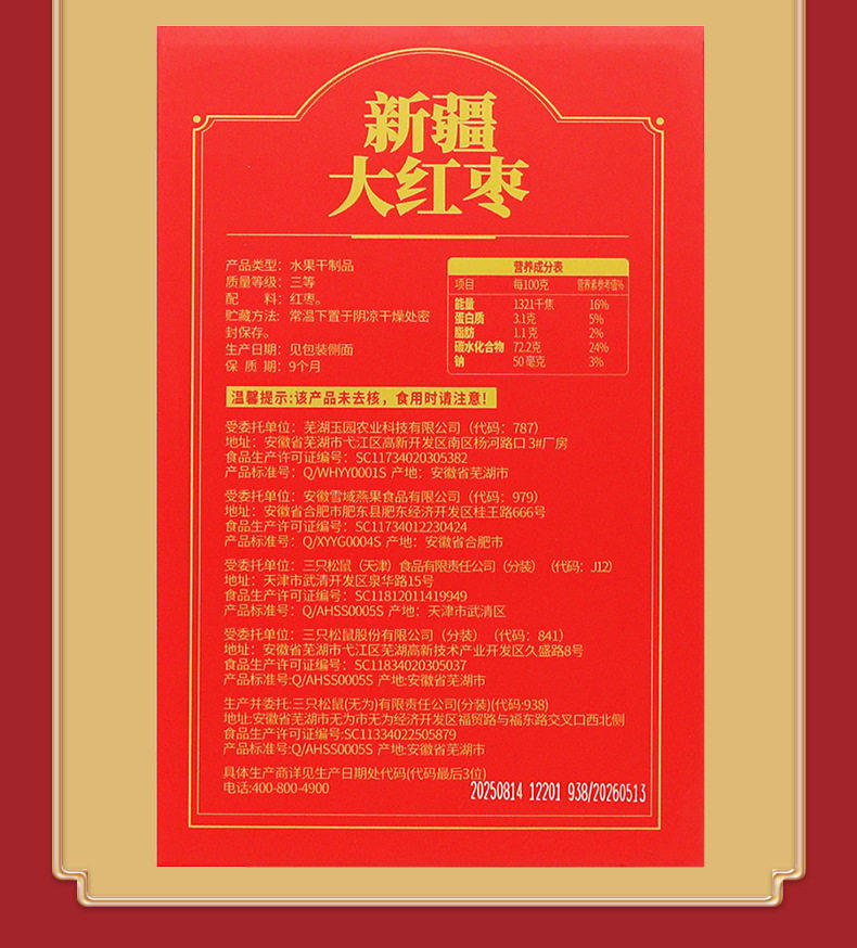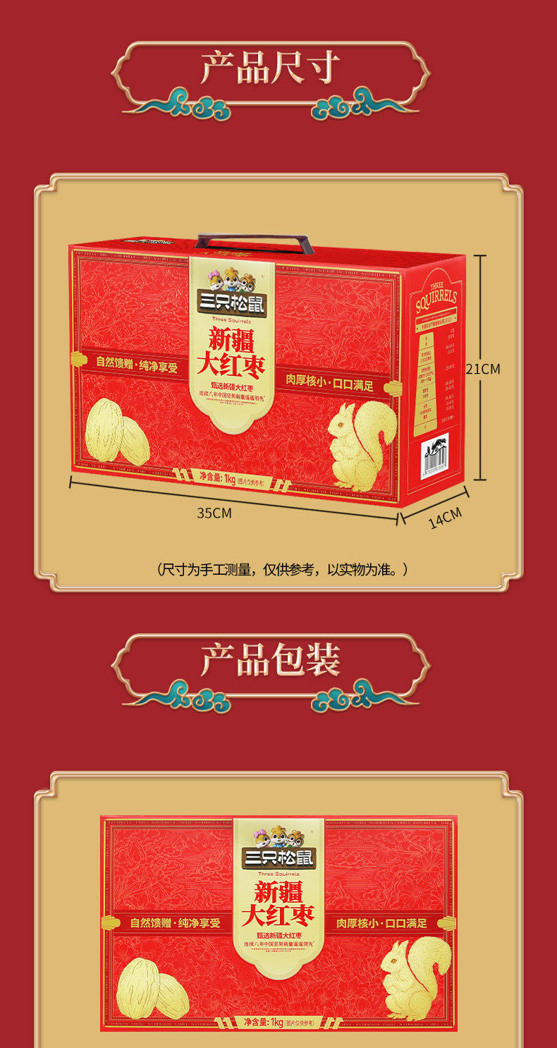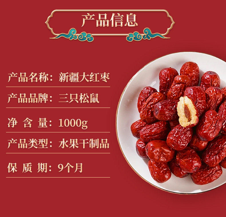 Three Squirrels Xinjiang Red Dates 1000g Bagged 1.0kg Ready-To-Eat No-Wash Date Snacks Individually Packaged