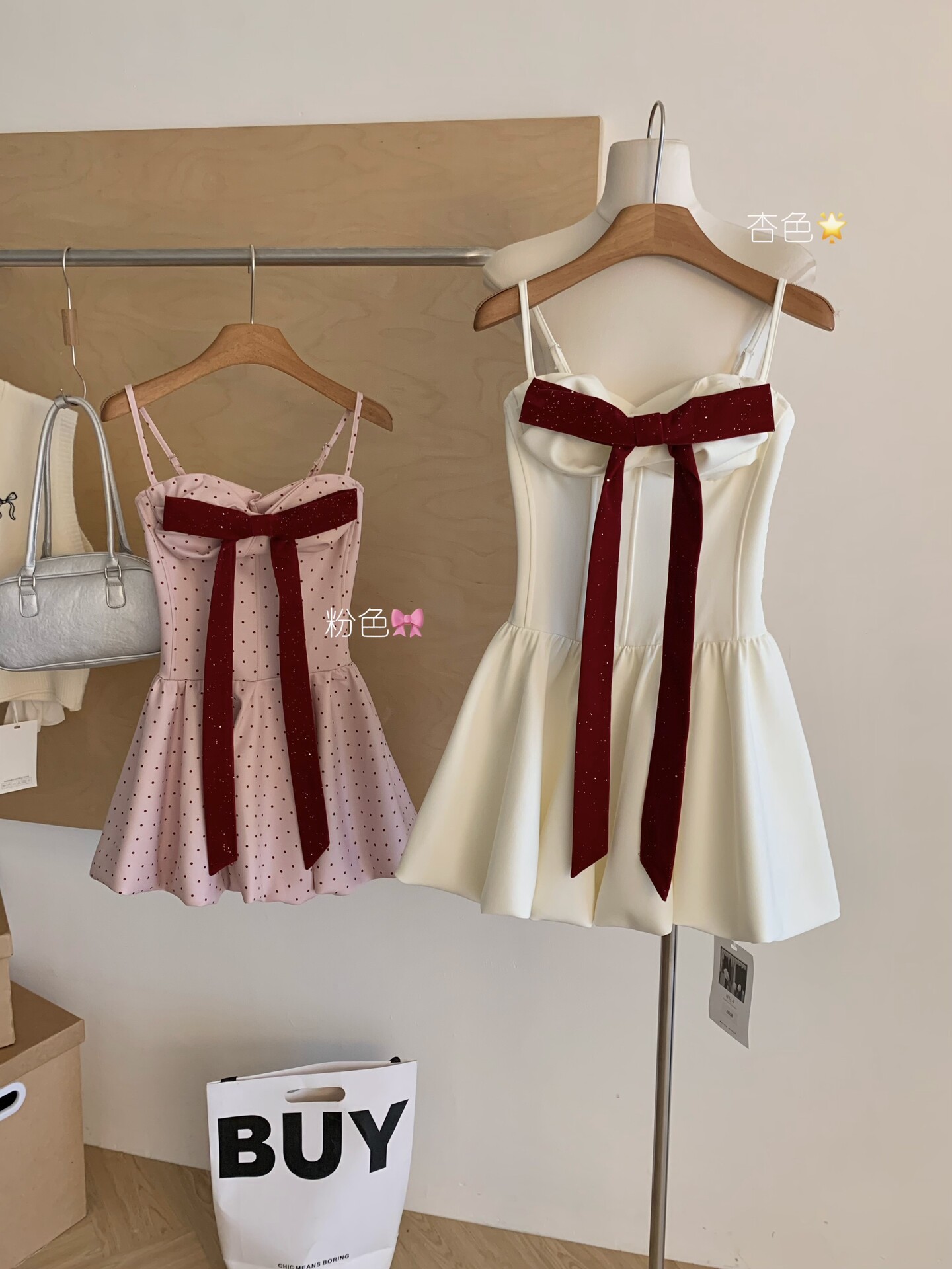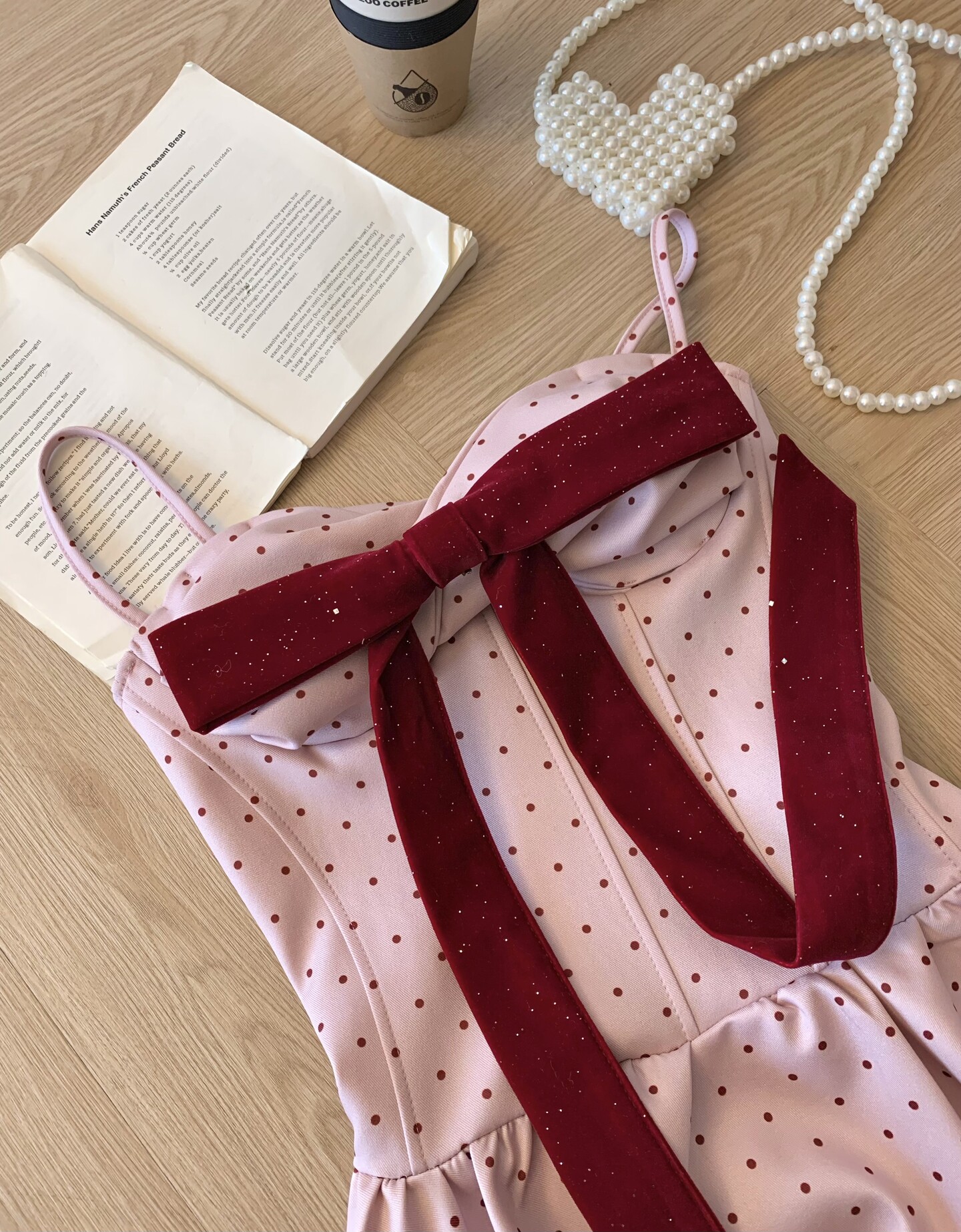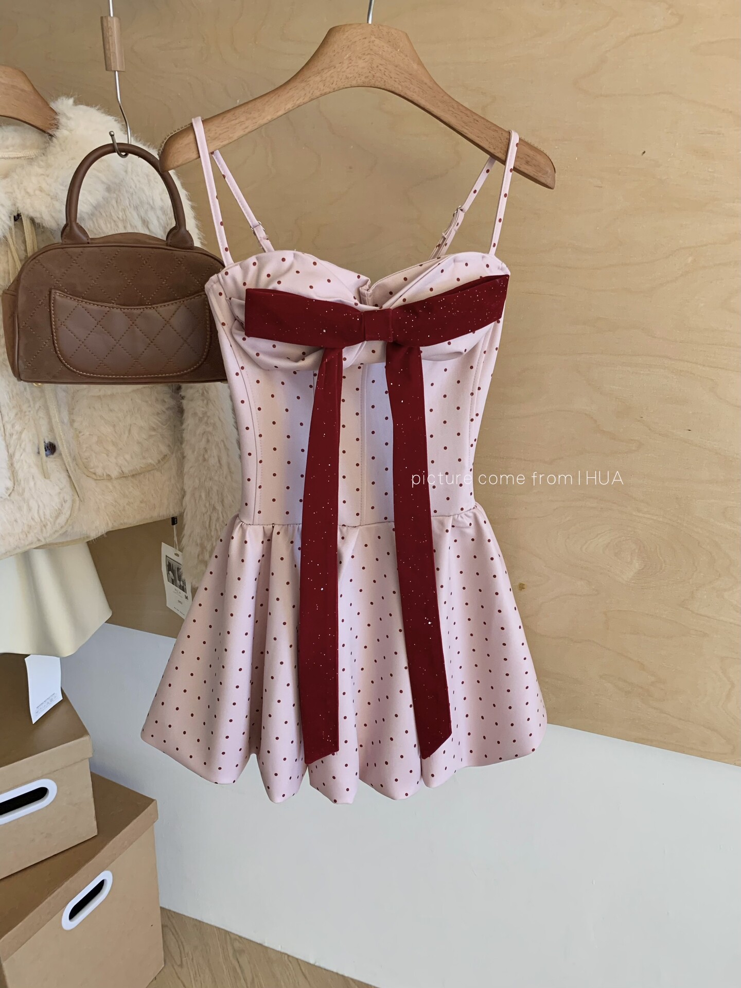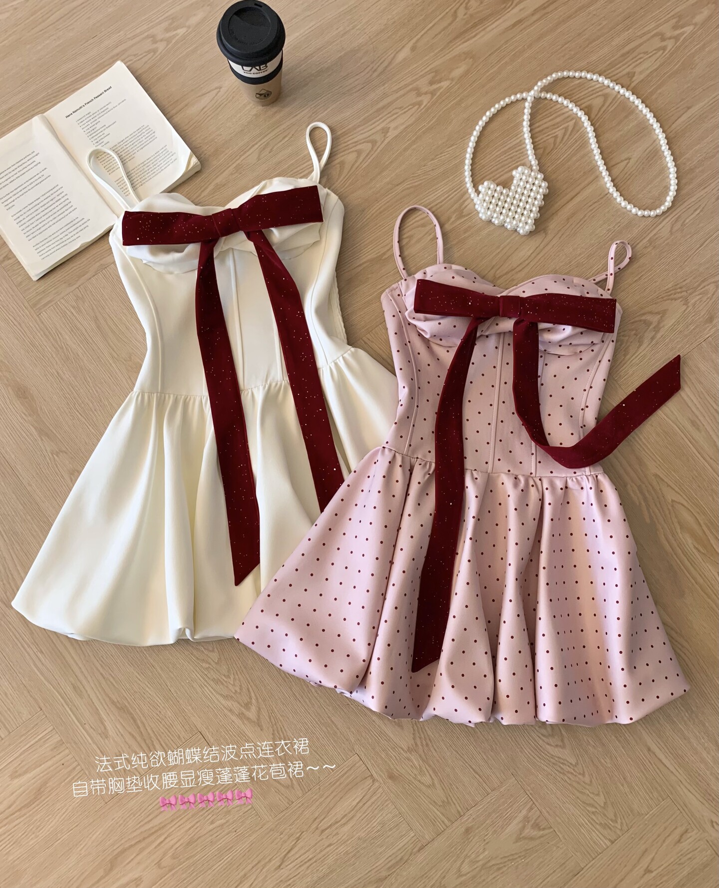 Lin Xiaxia's New French-Style Pure Desire Bow-Tie Waist-Cinching Slimming Polka Dot Women's Dress