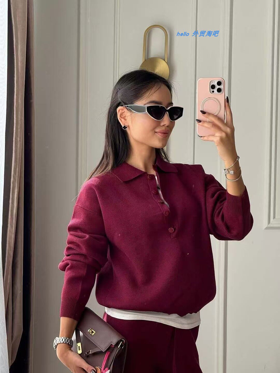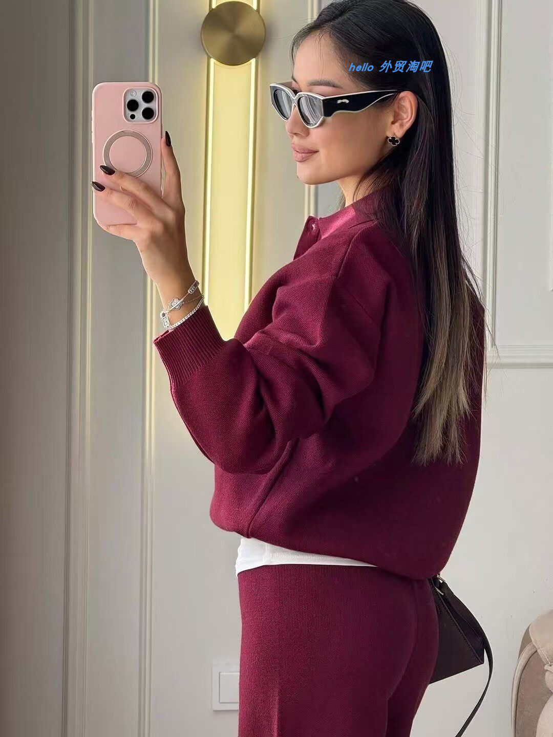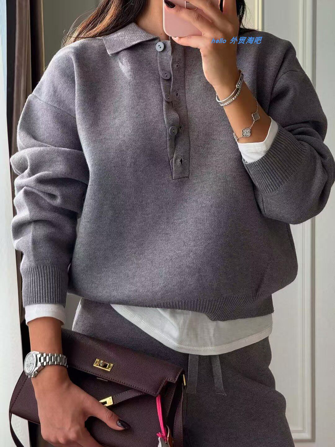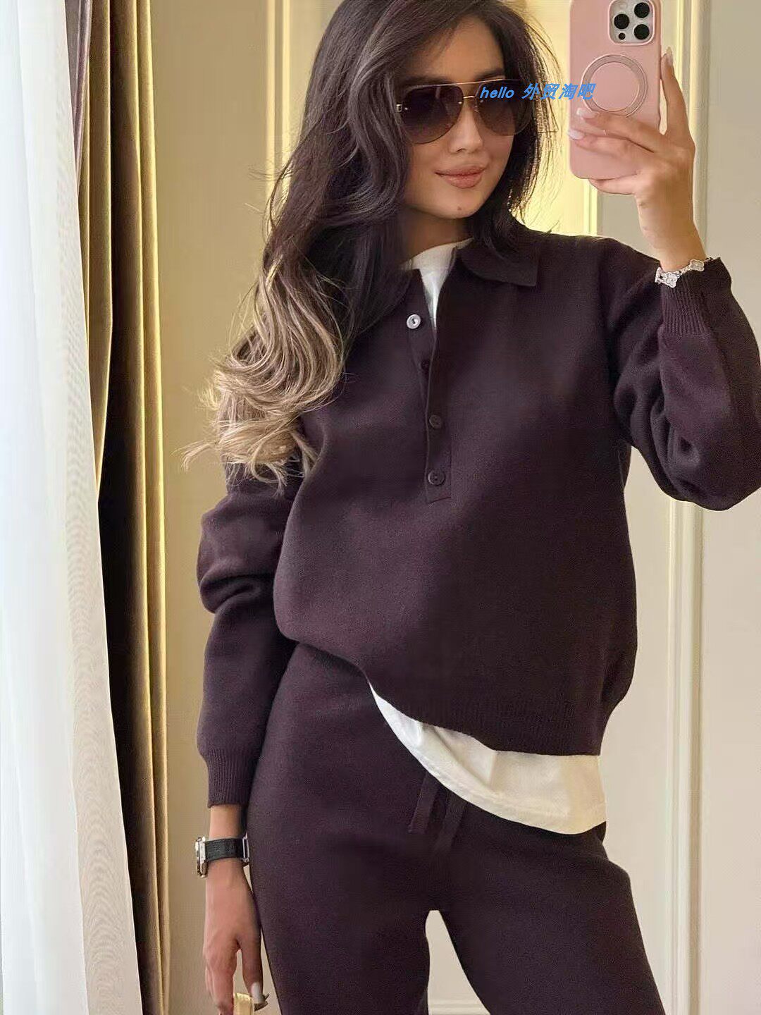 European and American Style Solid Color Lapel Button Knit Top and Pants Set