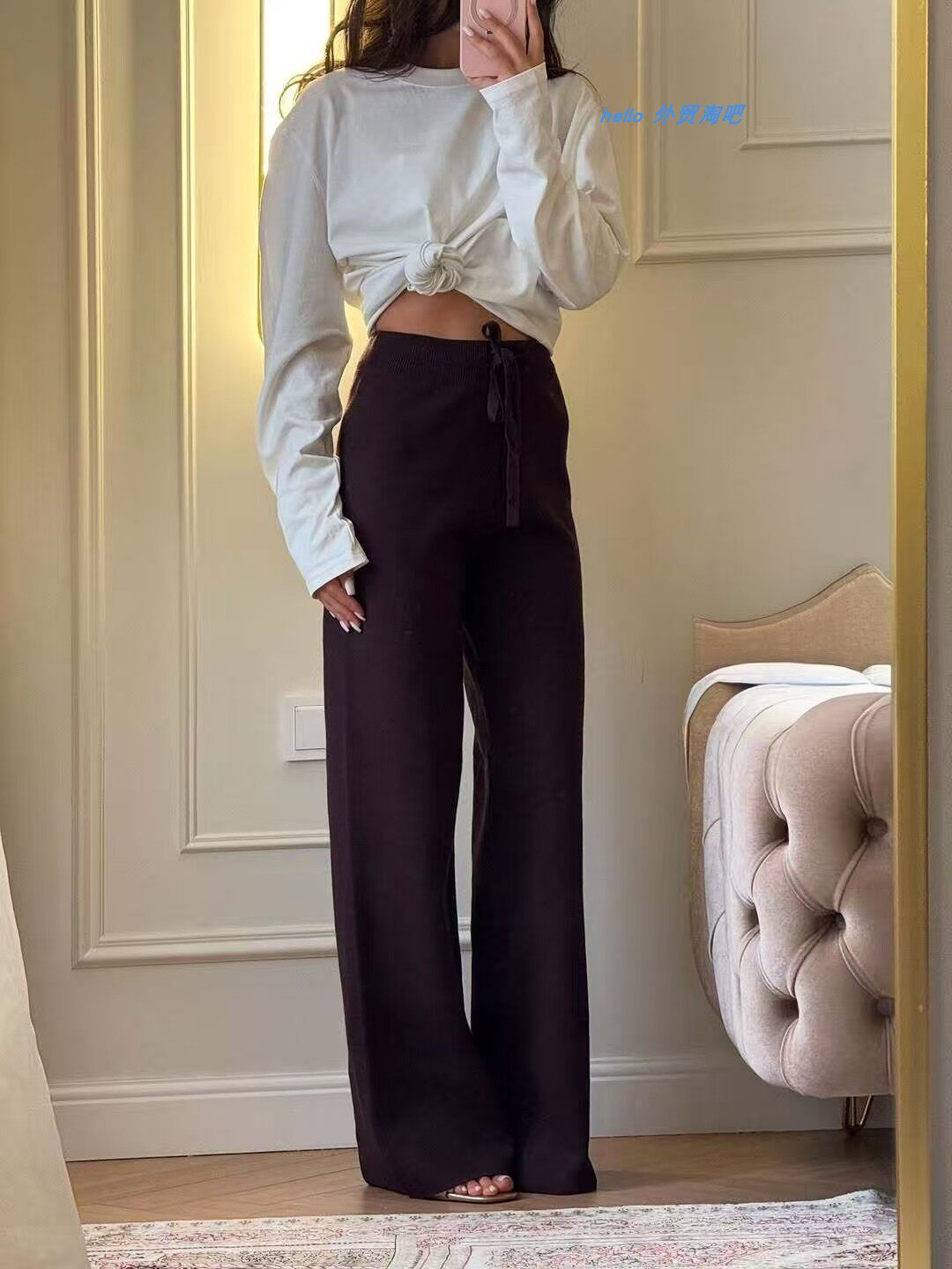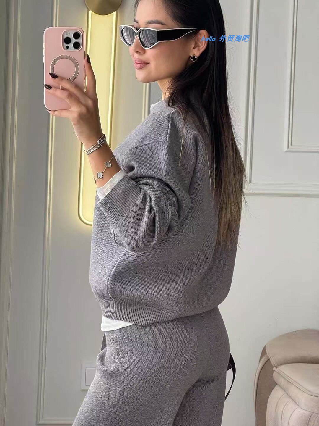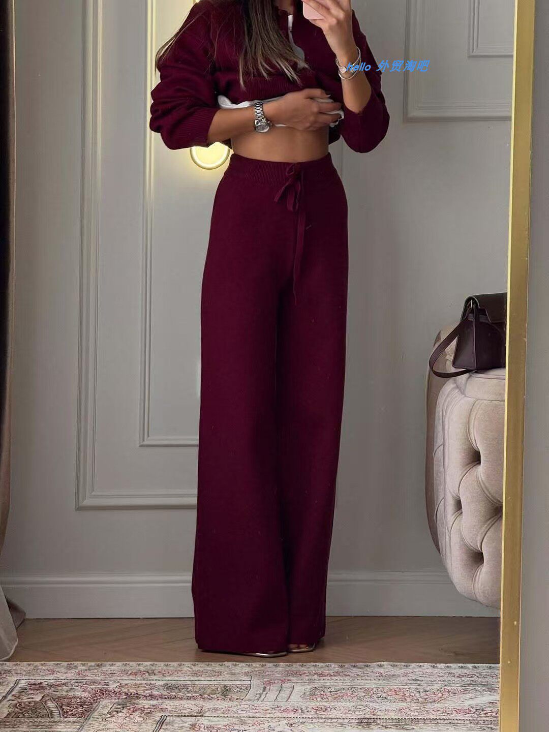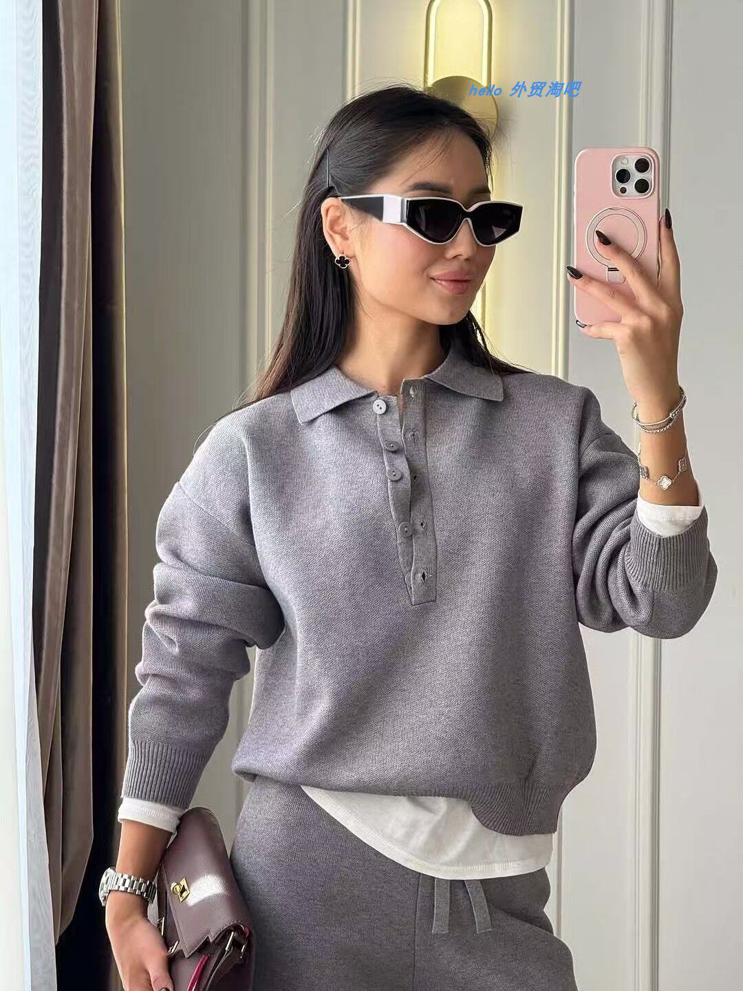 European and American Style Solid Color Lapel Button Knit Top and Pants Set