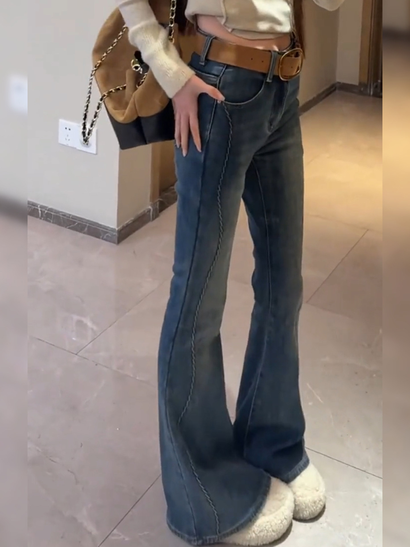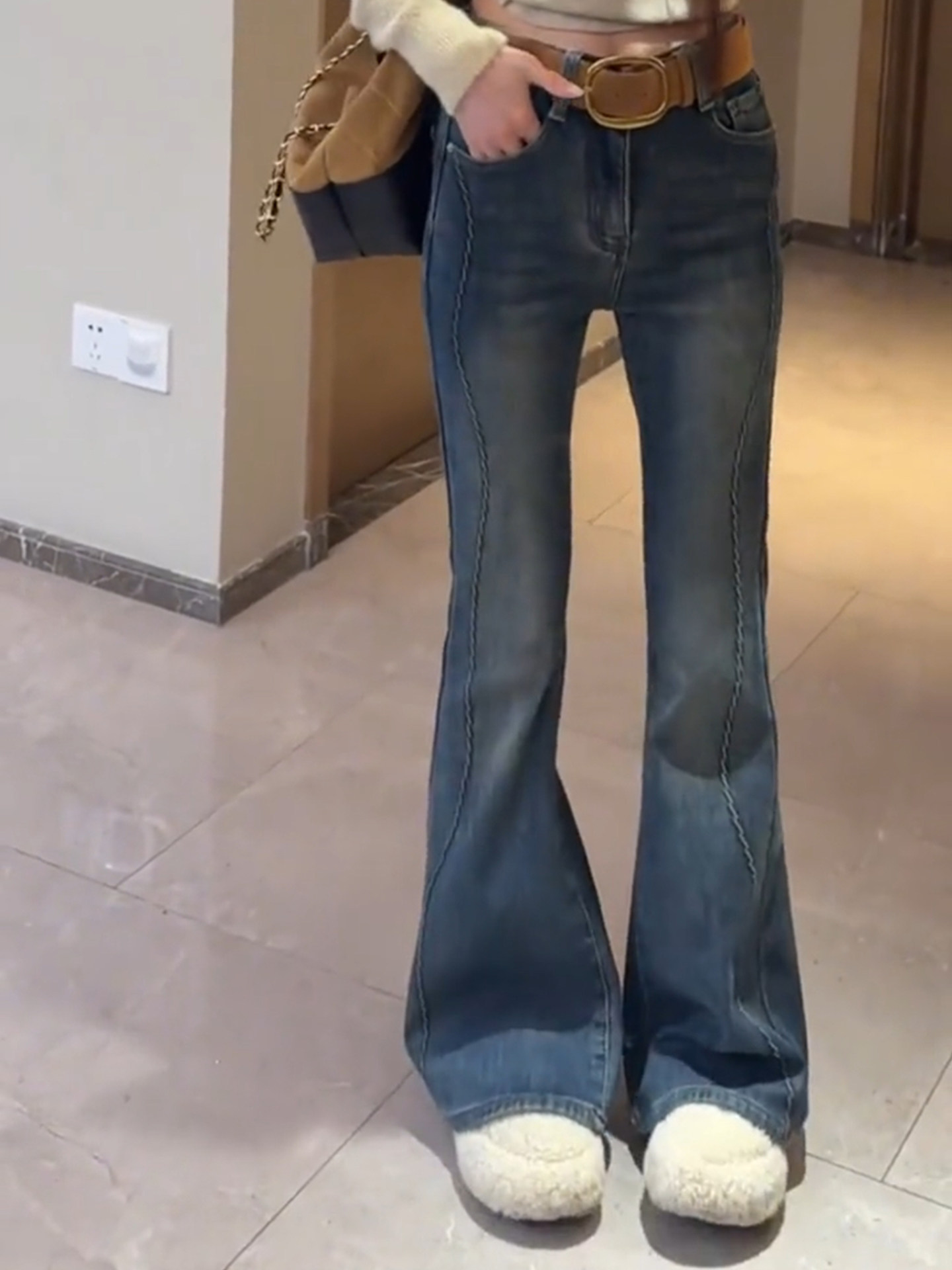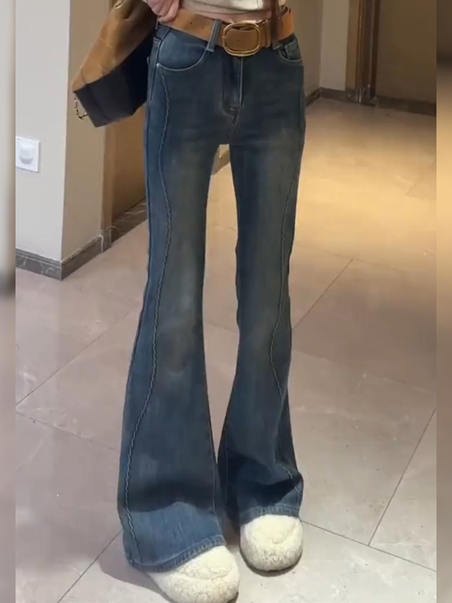 Blue velvet horseshoe jeans for women winter new large size high waist slimming straight flared floor mopping pants for small people