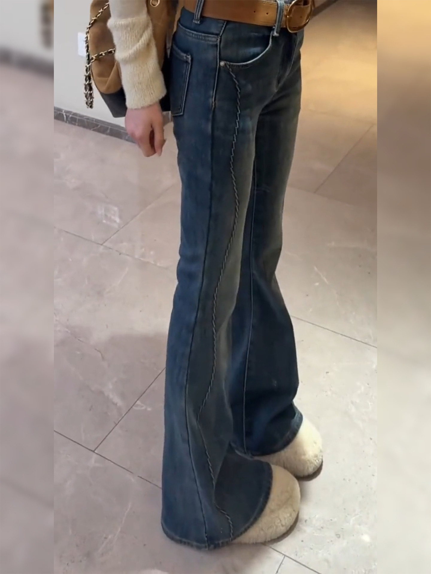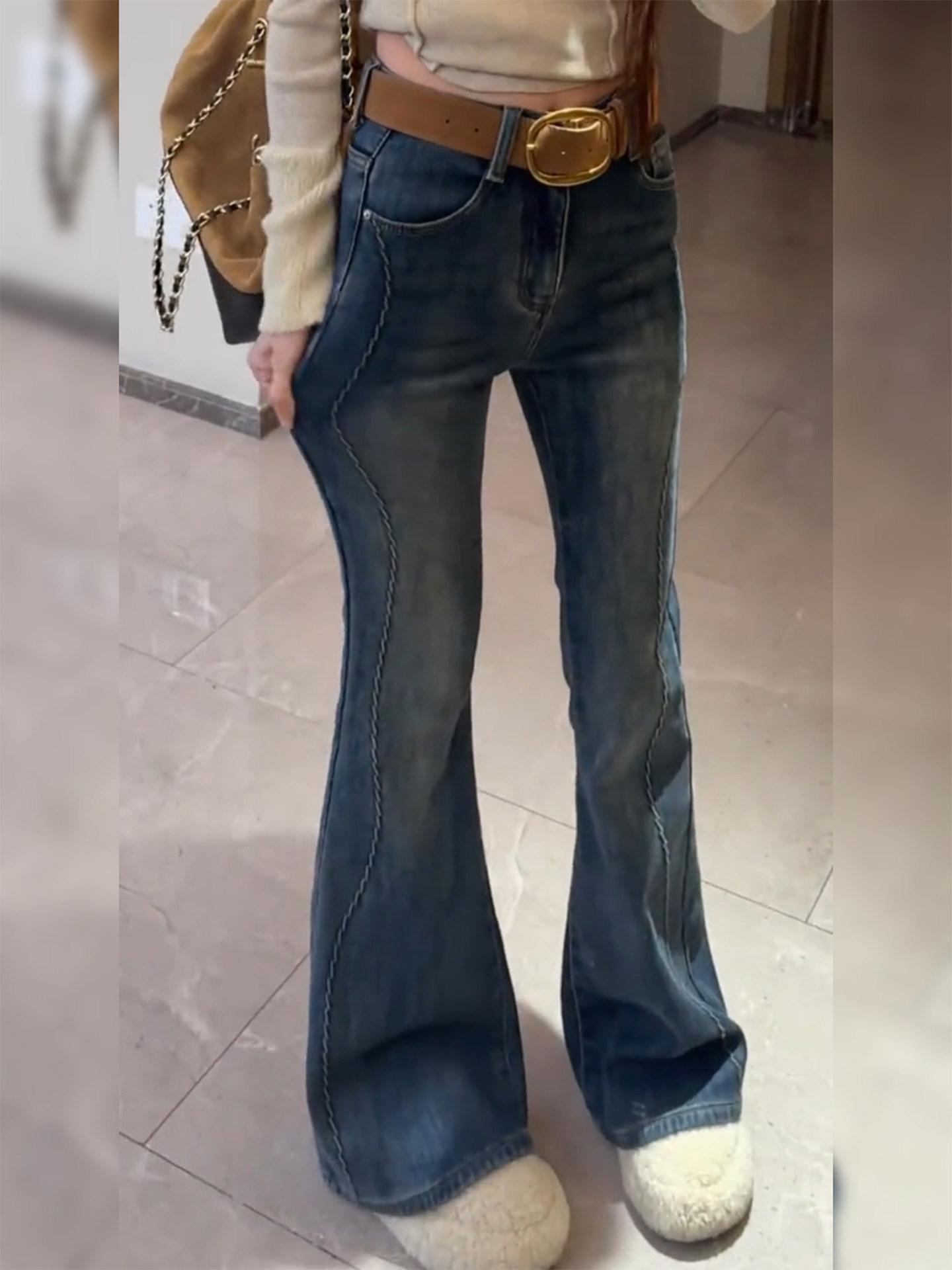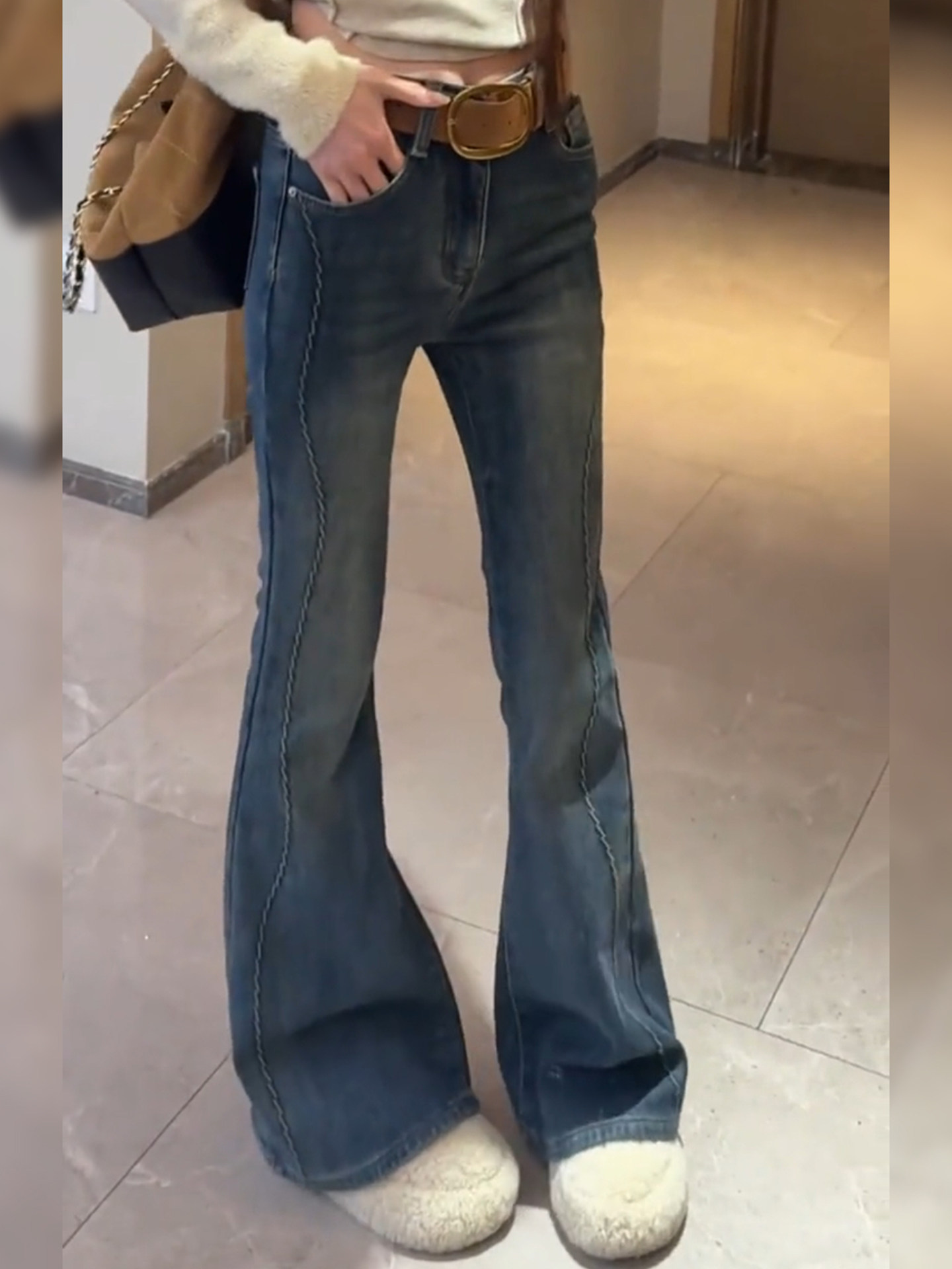Blue velvet horseshoe jeans for women winter new large size high waist slimming straight flared floor mopping pants for small people