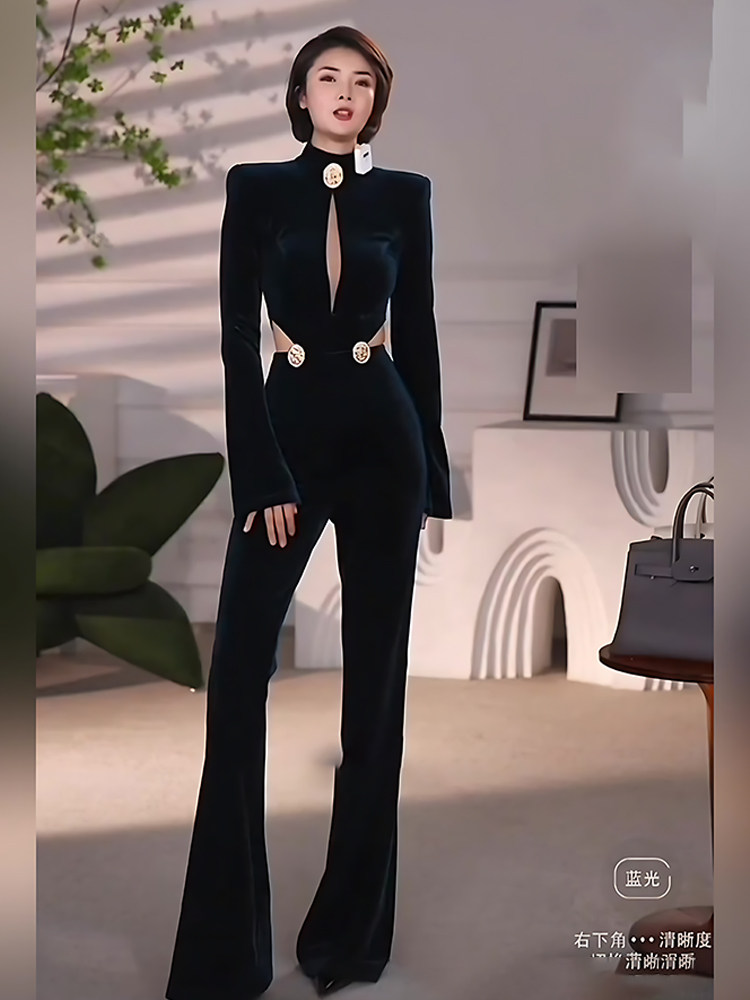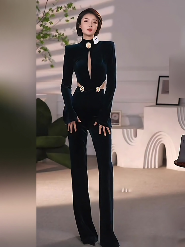 Yijie's Light Luxury and Elegant Style Black Velvet Jumpsuit for Women with Deep V-Neck, Long Sleeves, High Waist, and Slightly Flared Pants, Sexy Jumpsuit