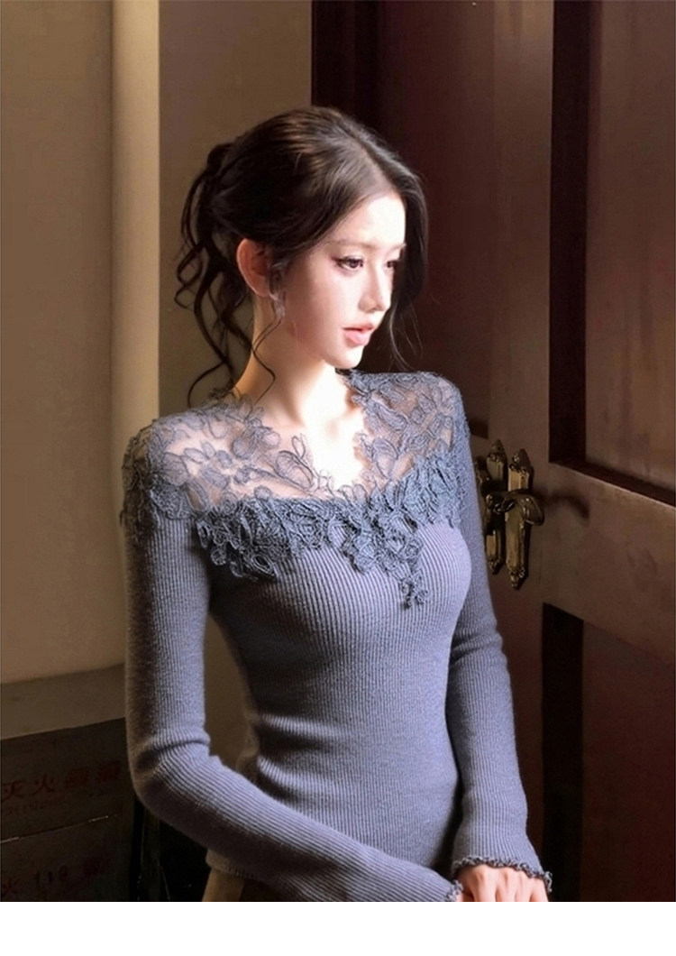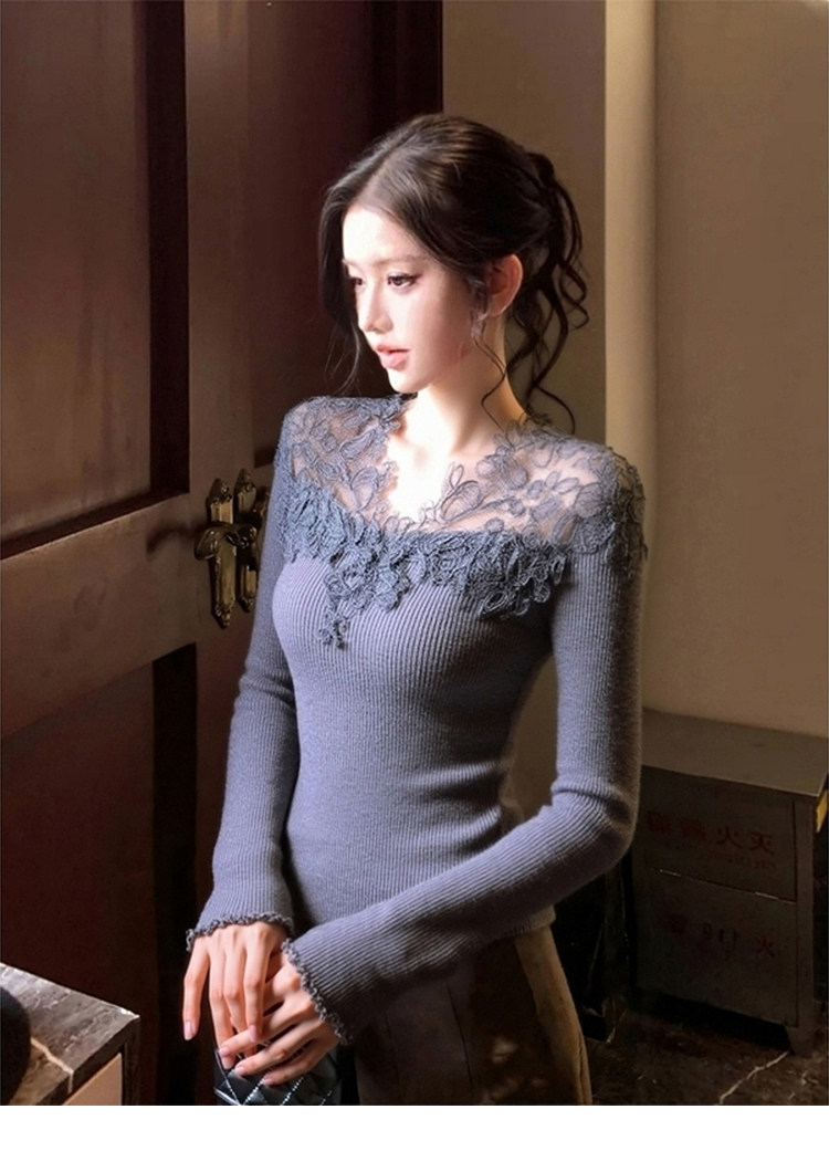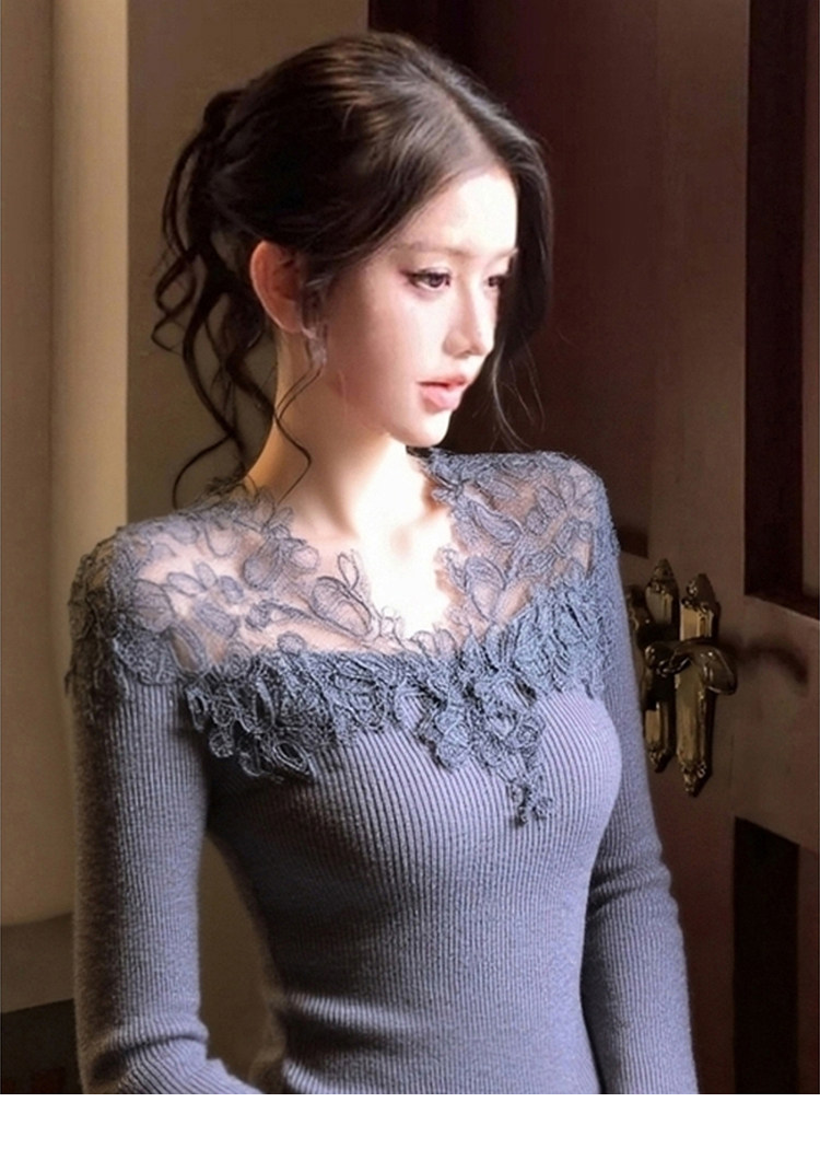 Gentle Style Lace Patchwork Knitwear for Women, Stunningly Beautiful Autumn and Winter Base Layer Sweater, Elegant Top