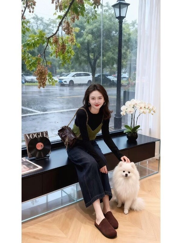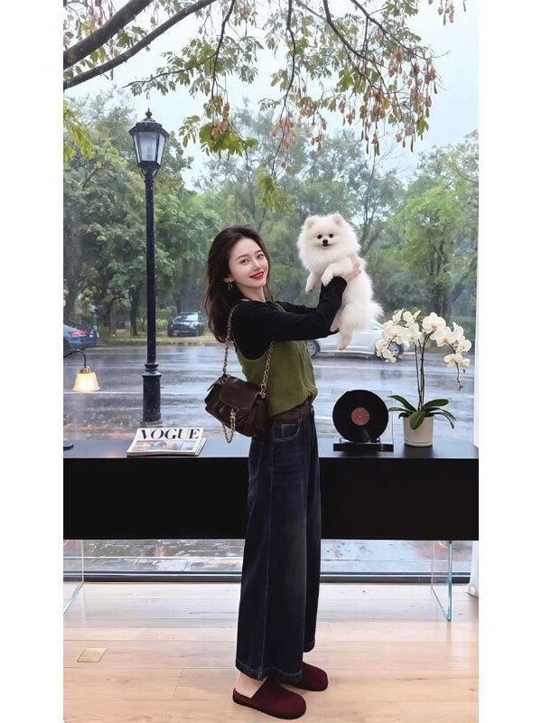 Korean-style great-looking early autumn complete set of simple knitted camisole layered with bottoming shirt and jeans suit