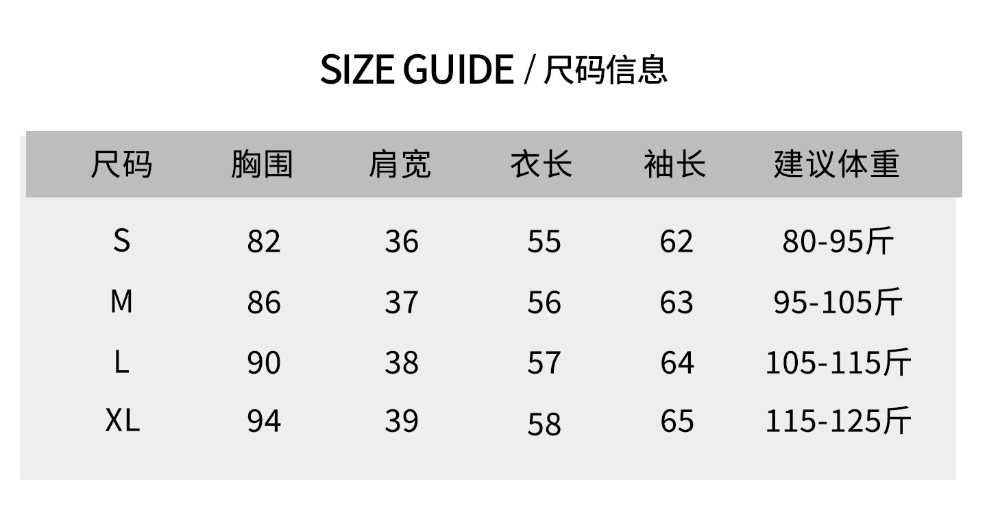 China (cm) 165 / 88-90 170 / 96-98 175 / 108-110 180 / 118-122 185 / 126-130