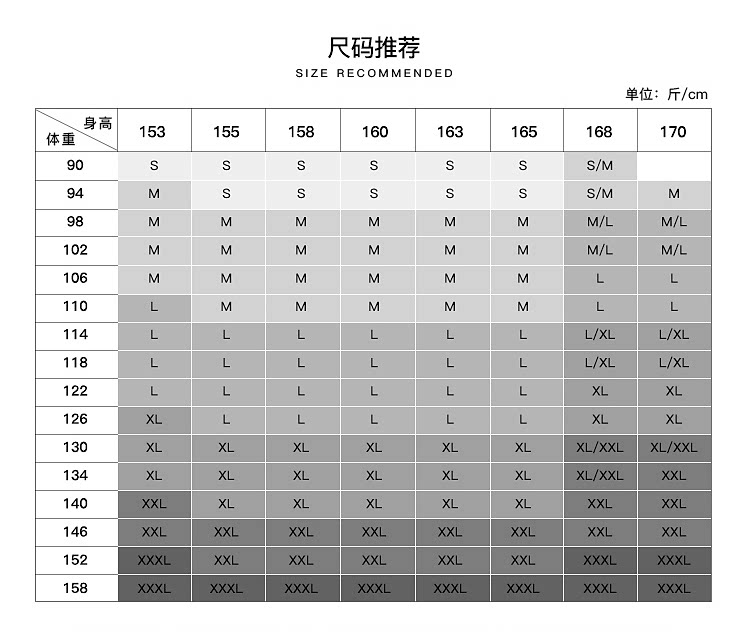 China (cm) 160-165/84-86 165-170 / 88-90 167-172 / 92-96 168-173 / 98-102 170-176 / 106-110