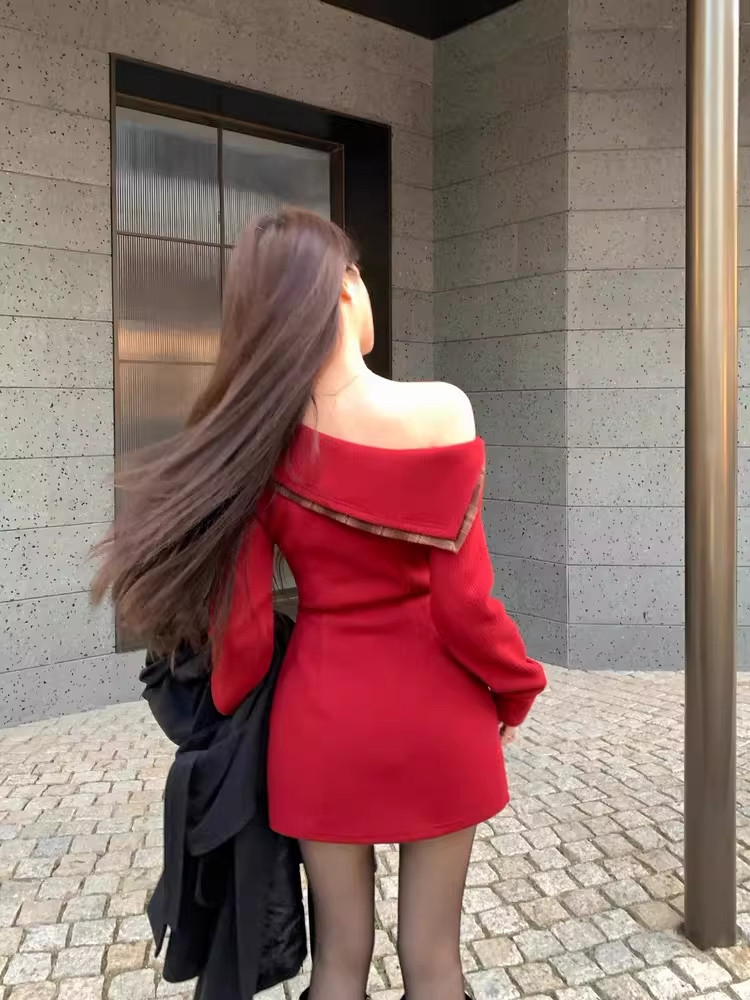 New Year's Red One-Shoulder Knitted Dress for Women, New Spring Style, Slim Fit, Elegant, One-Shoulder, Hip-Hugging Short Skirt