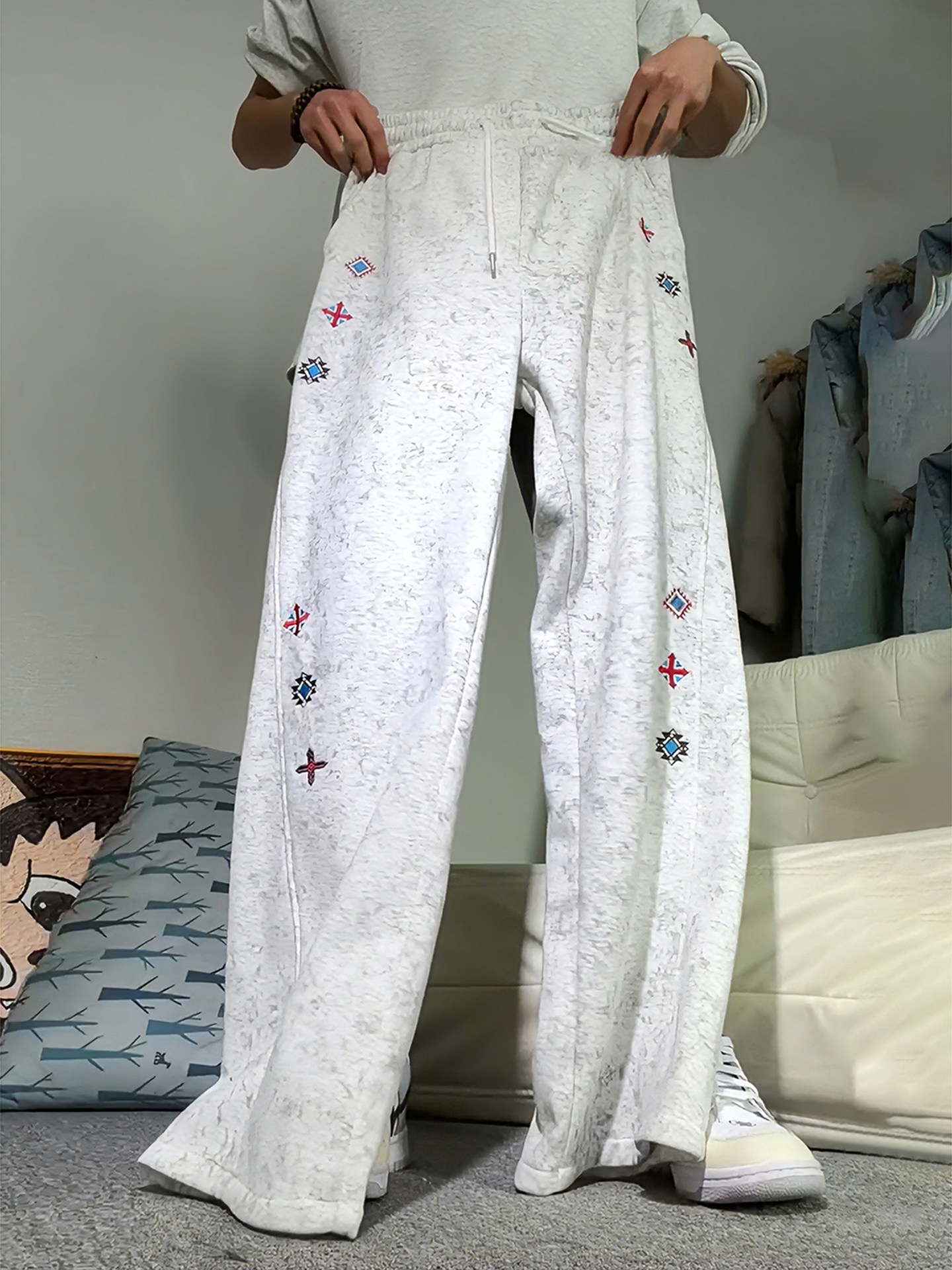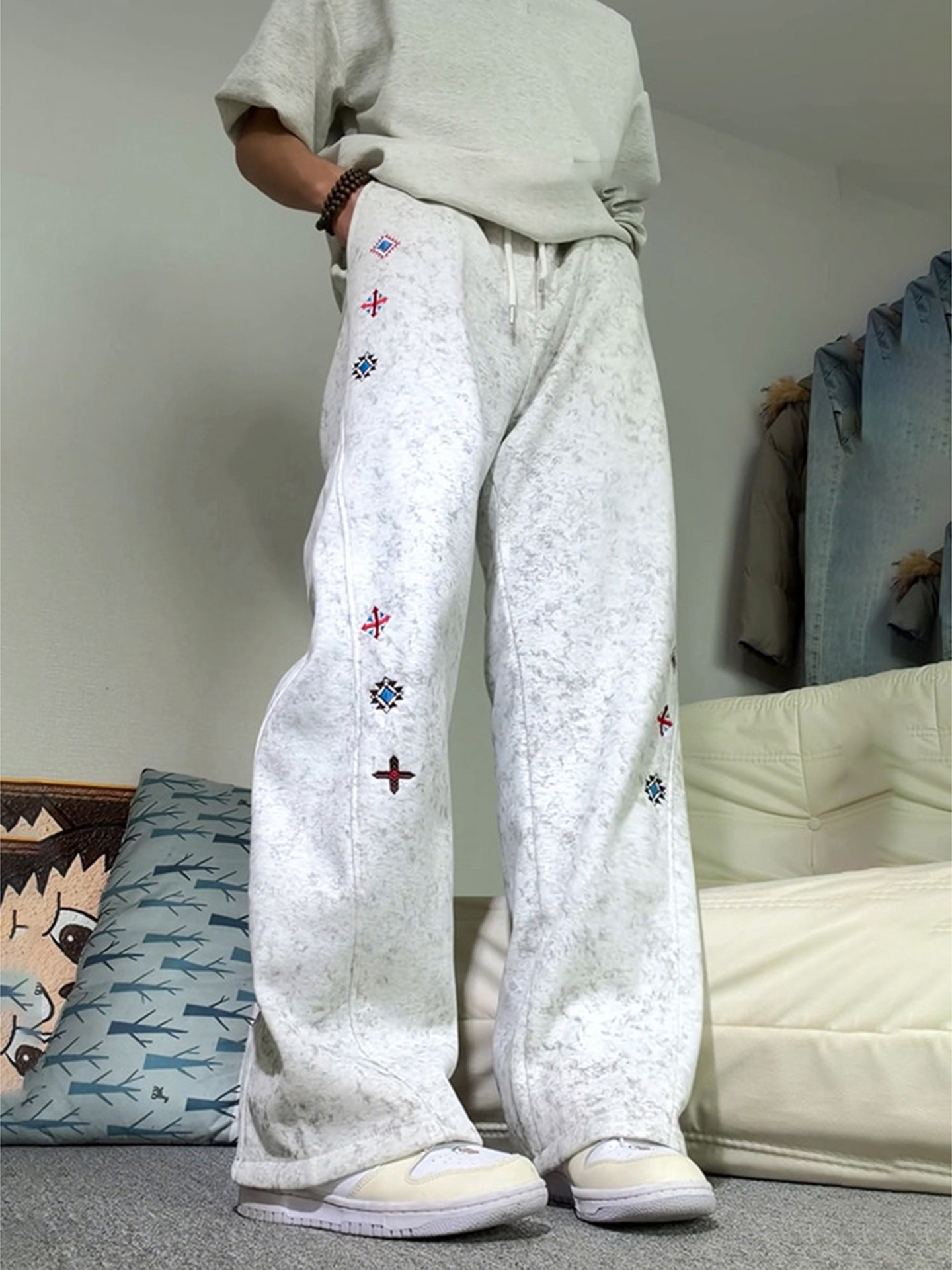 White and gray American tie-dye embroidered sweatpants men's winter velvet scimitar boot pants slim straight-leg sweatpants