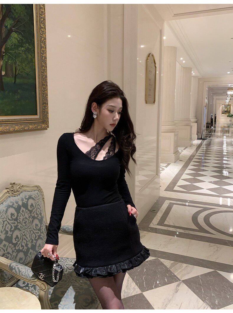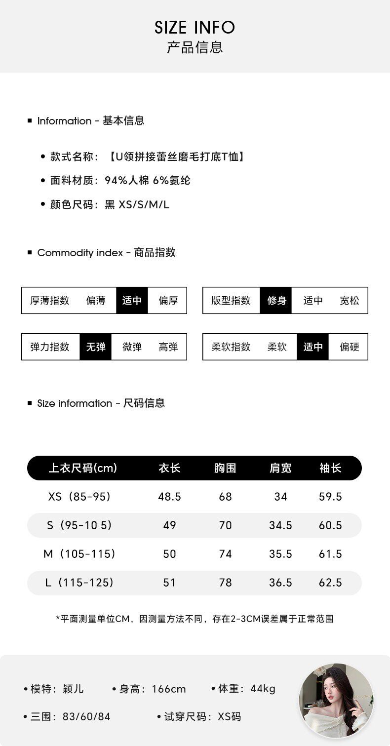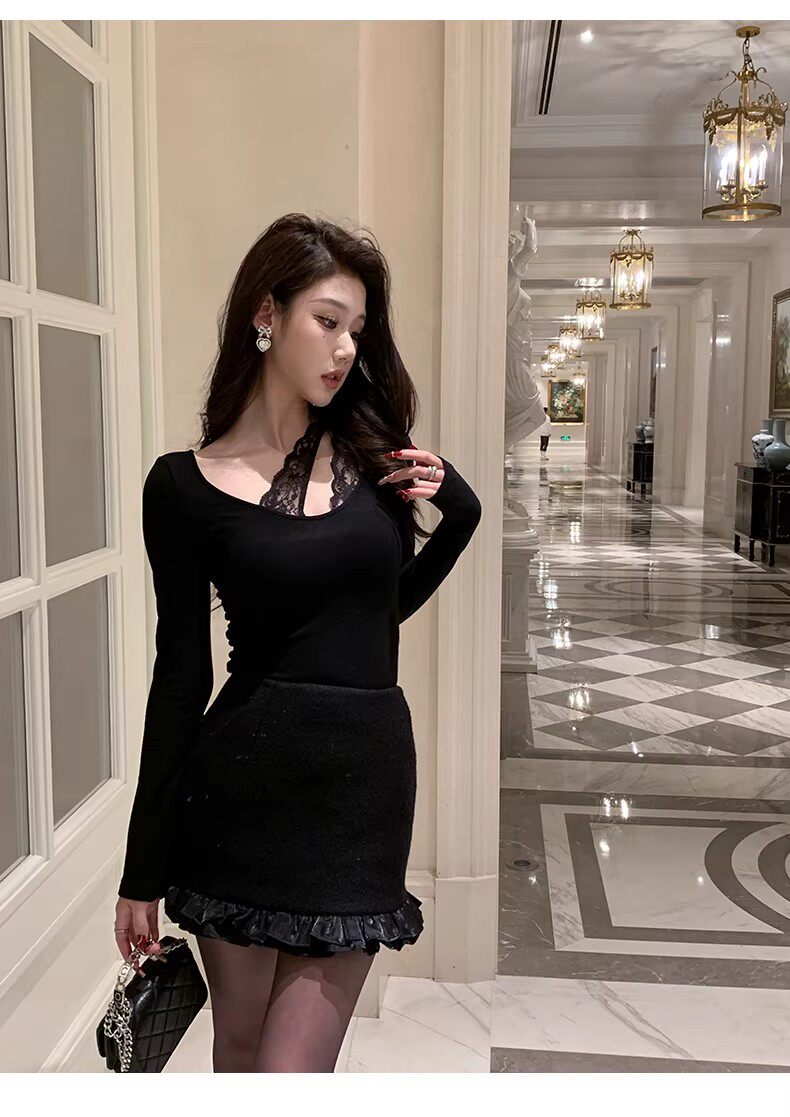 Hollinna U-Neck Lace Splicing Knitted Brushed T-Shirt for Women, Spring and Autumn 2025 New Style, Waist-Cinching Slim-Fit Base Top