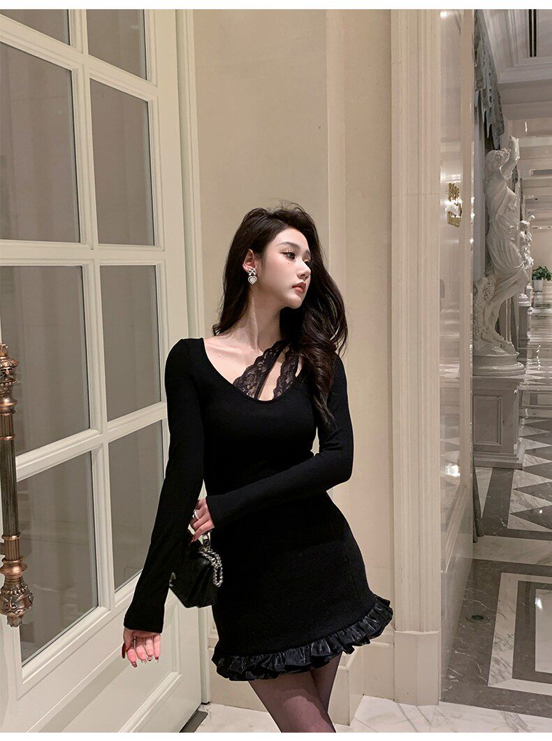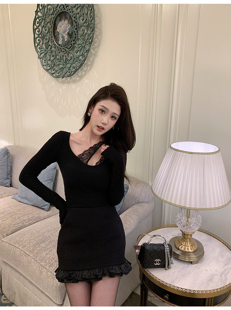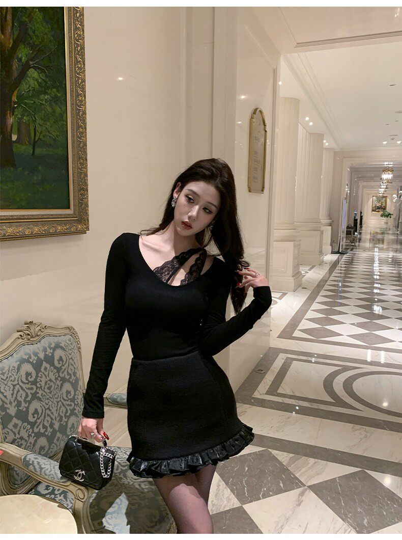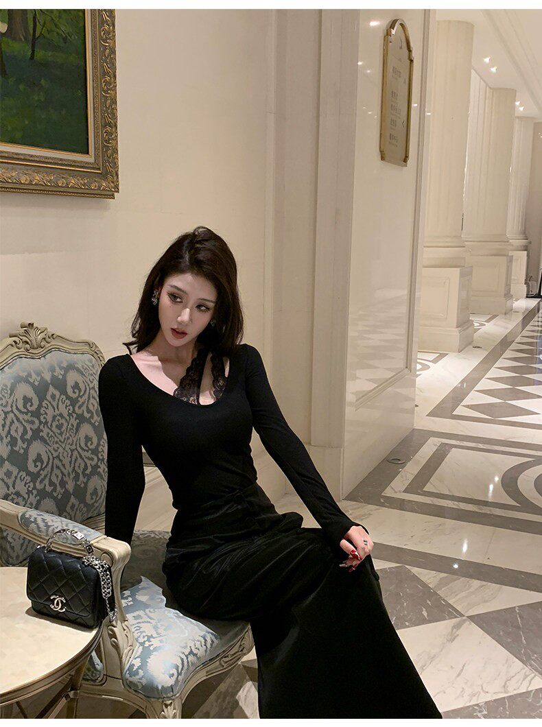 Hollinna U-Neck Lace Splicing Knitted Brushed T-Shirt for Women, Spring and Autumn 2025 New Style, Waist-Cinching Slim-Fit Base Top