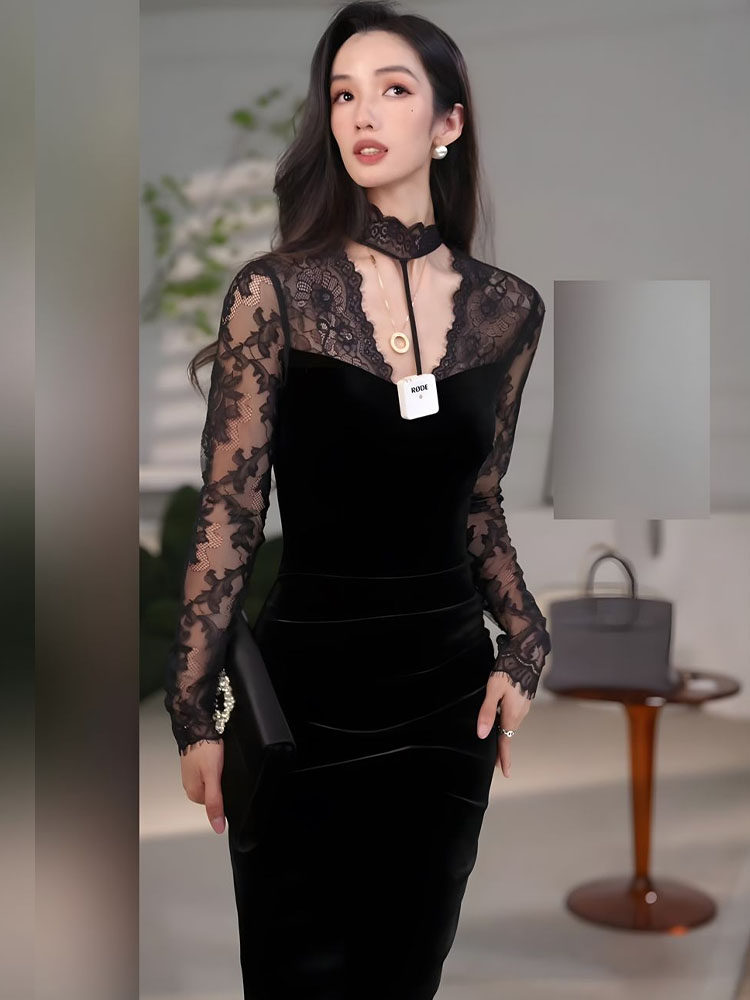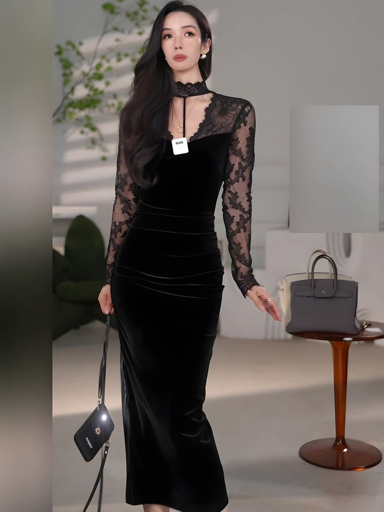 Mijie French-Style Halter V-Neck Lace Patchwork Velvet Dress for Women, Waist-Cinching, Slimming, Slit, Bodycon Long Dress, Sexy