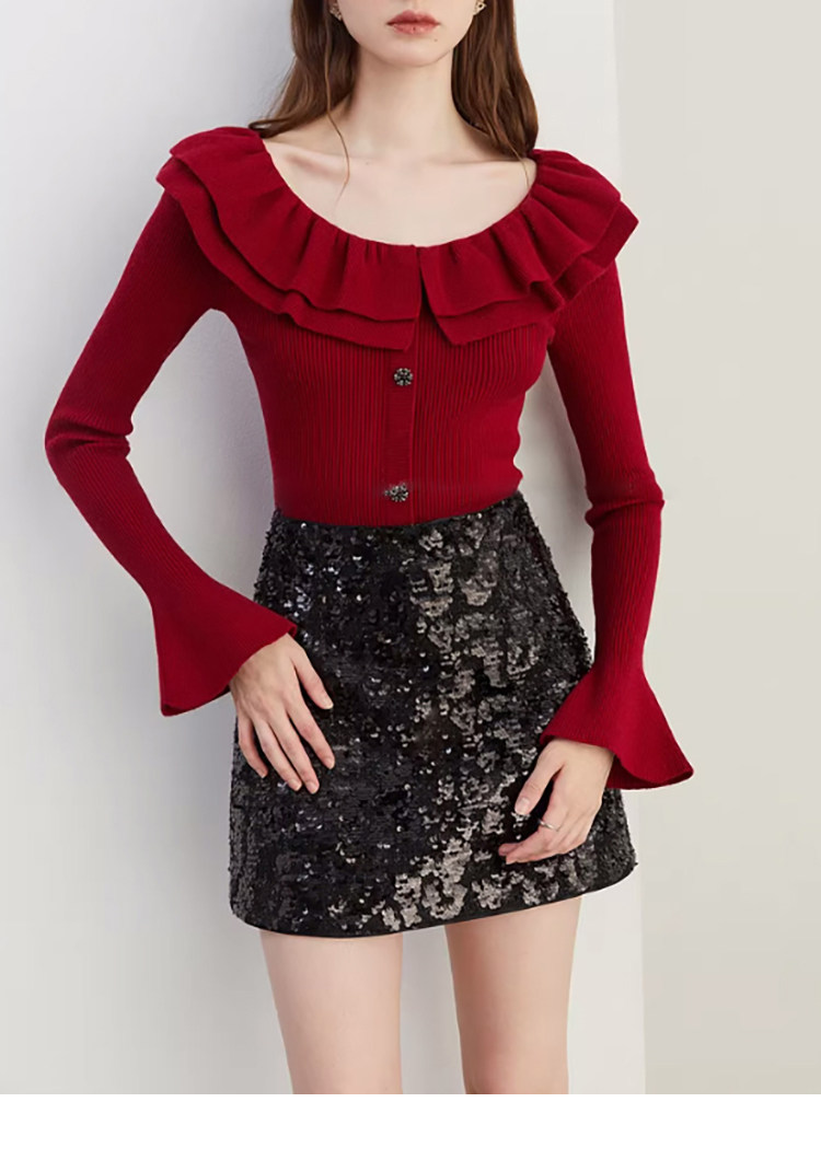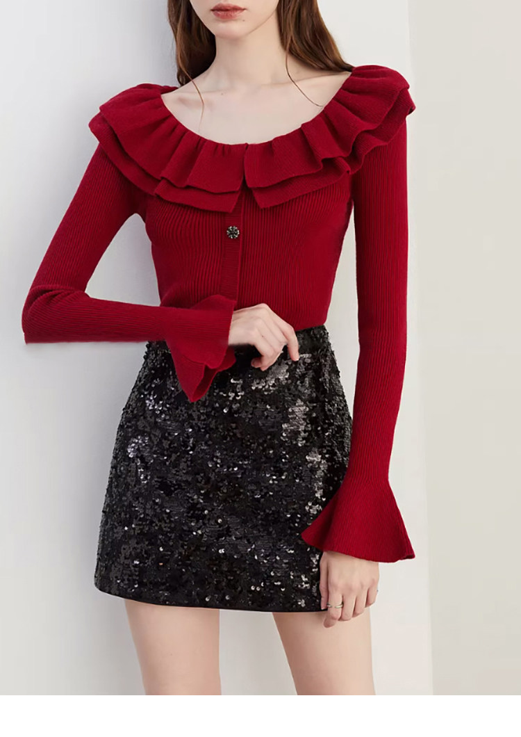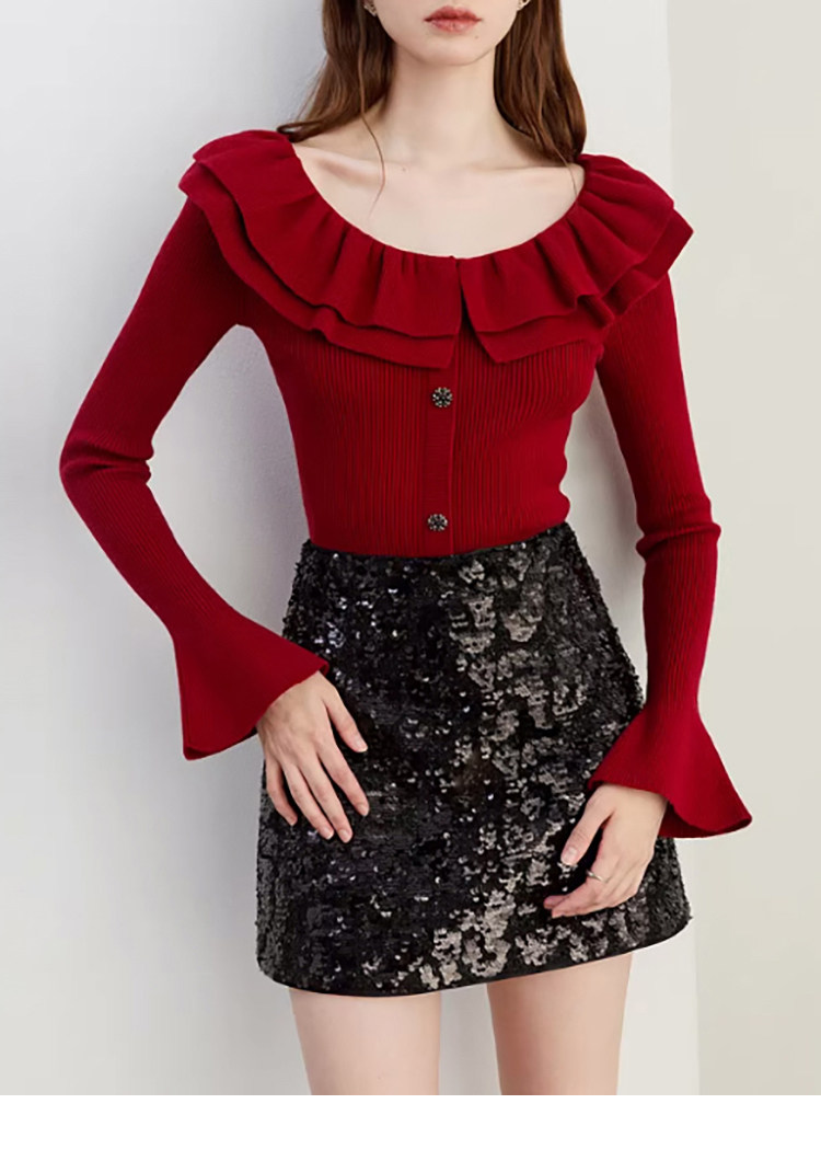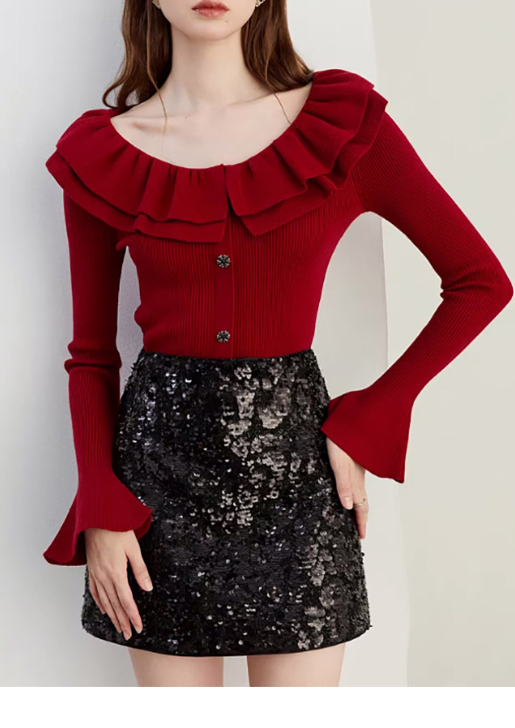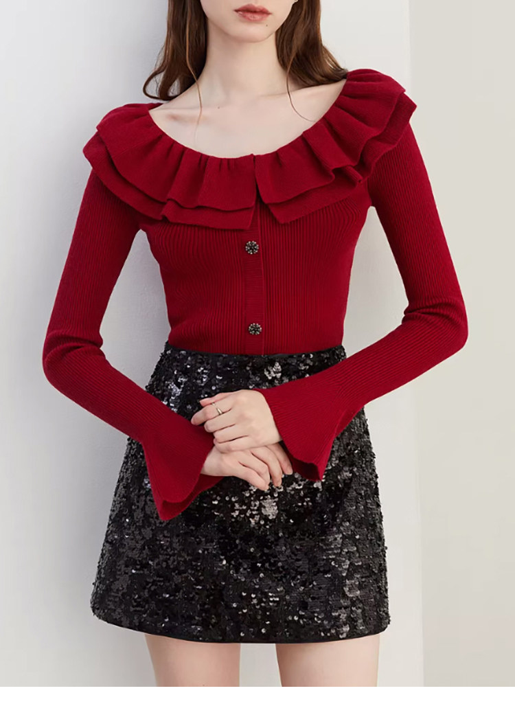 Autumn and Winter Ruffled Slim-Fit Beautiful Knit Sweater for Women, Stunning Red New Year Base Layer Top