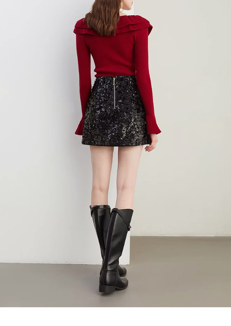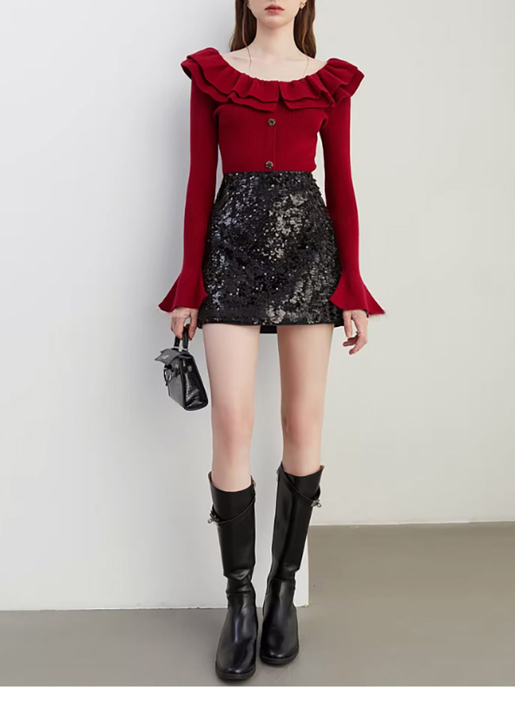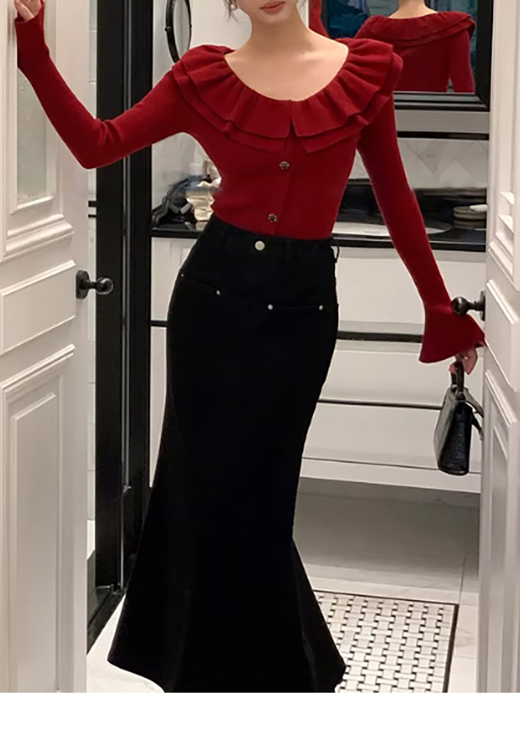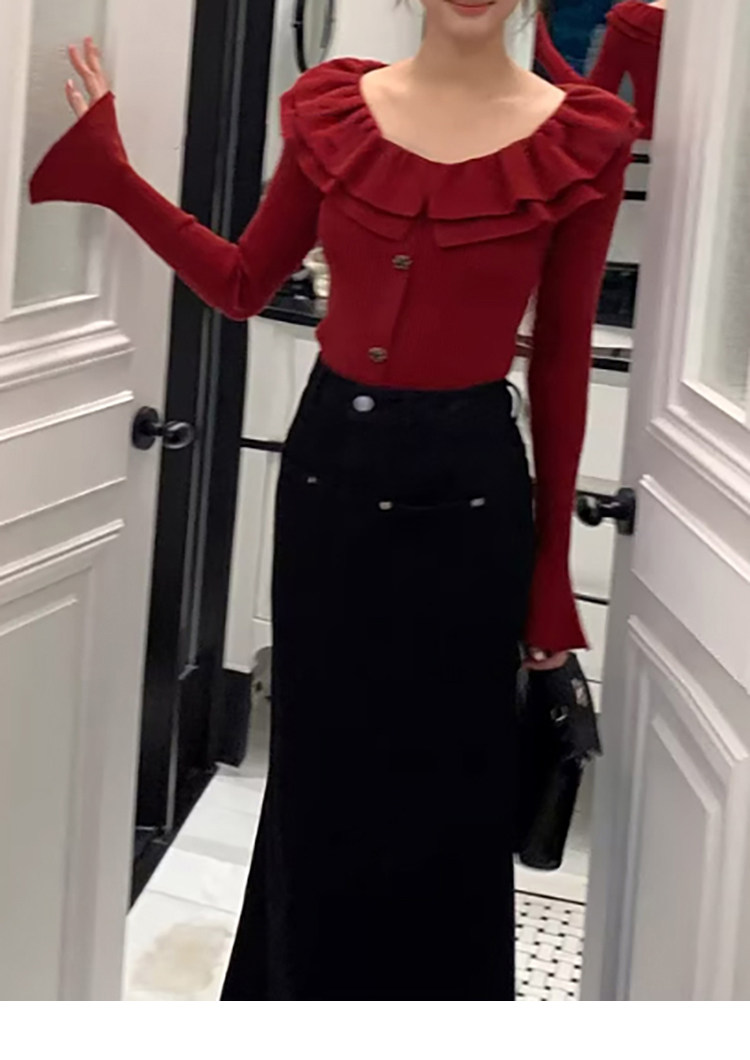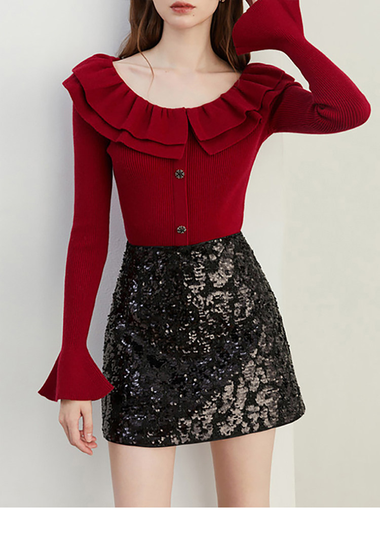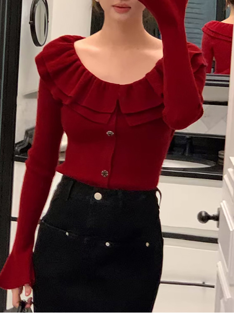 Autumn and Winter Ruffled Slim-Fit Beautiful Knit Sweater for Women, Stunning Red New Year Base Layer Top