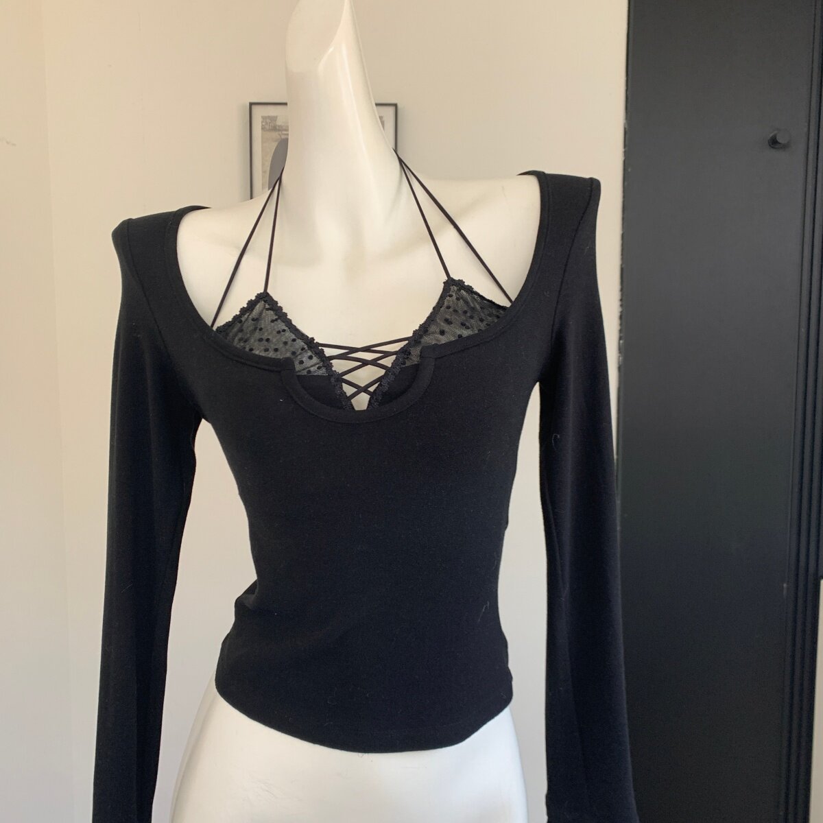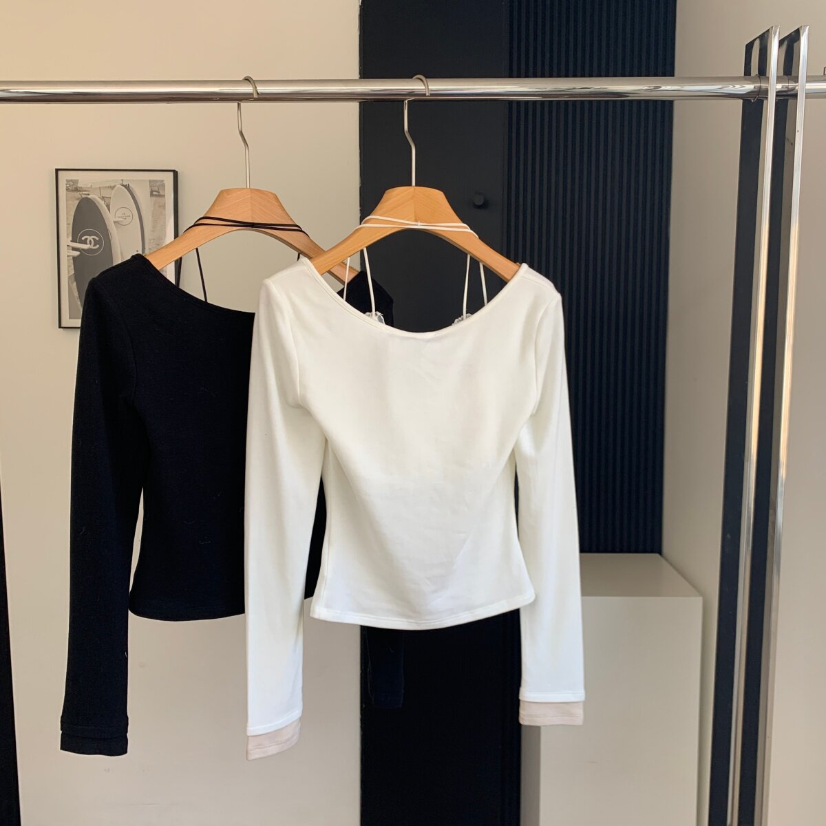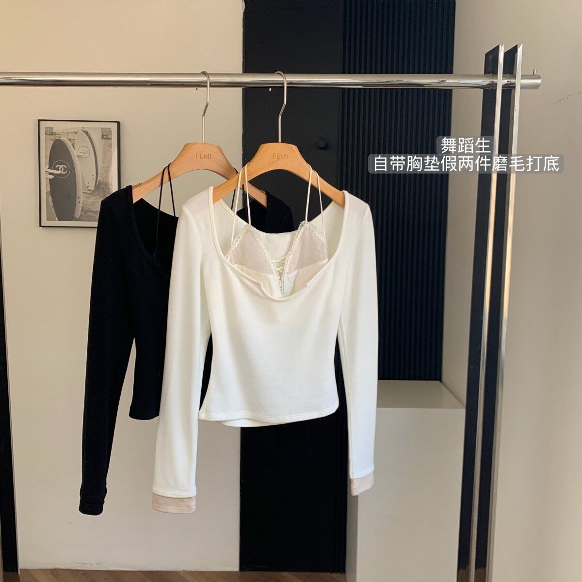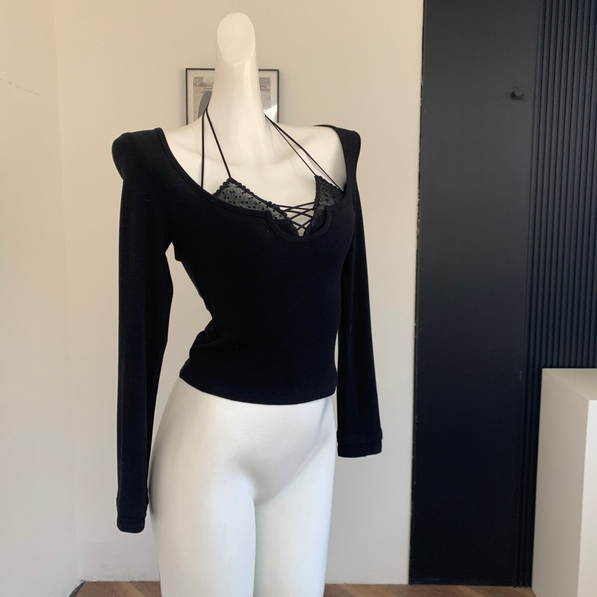 Lin Xiaxia's Two-Piece Halter Neck Long-Sleeve T-Shirt with Built-In Bra Pads, Pure and Sexy Slim-Fit Top for Women