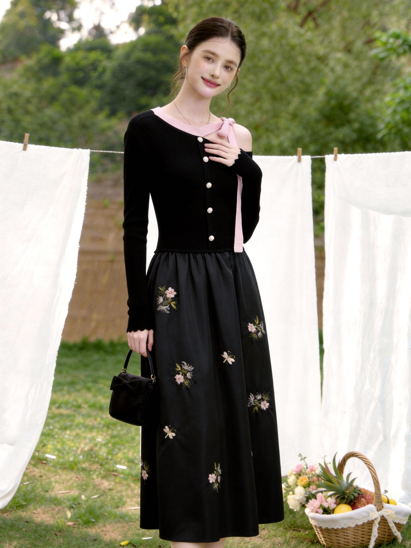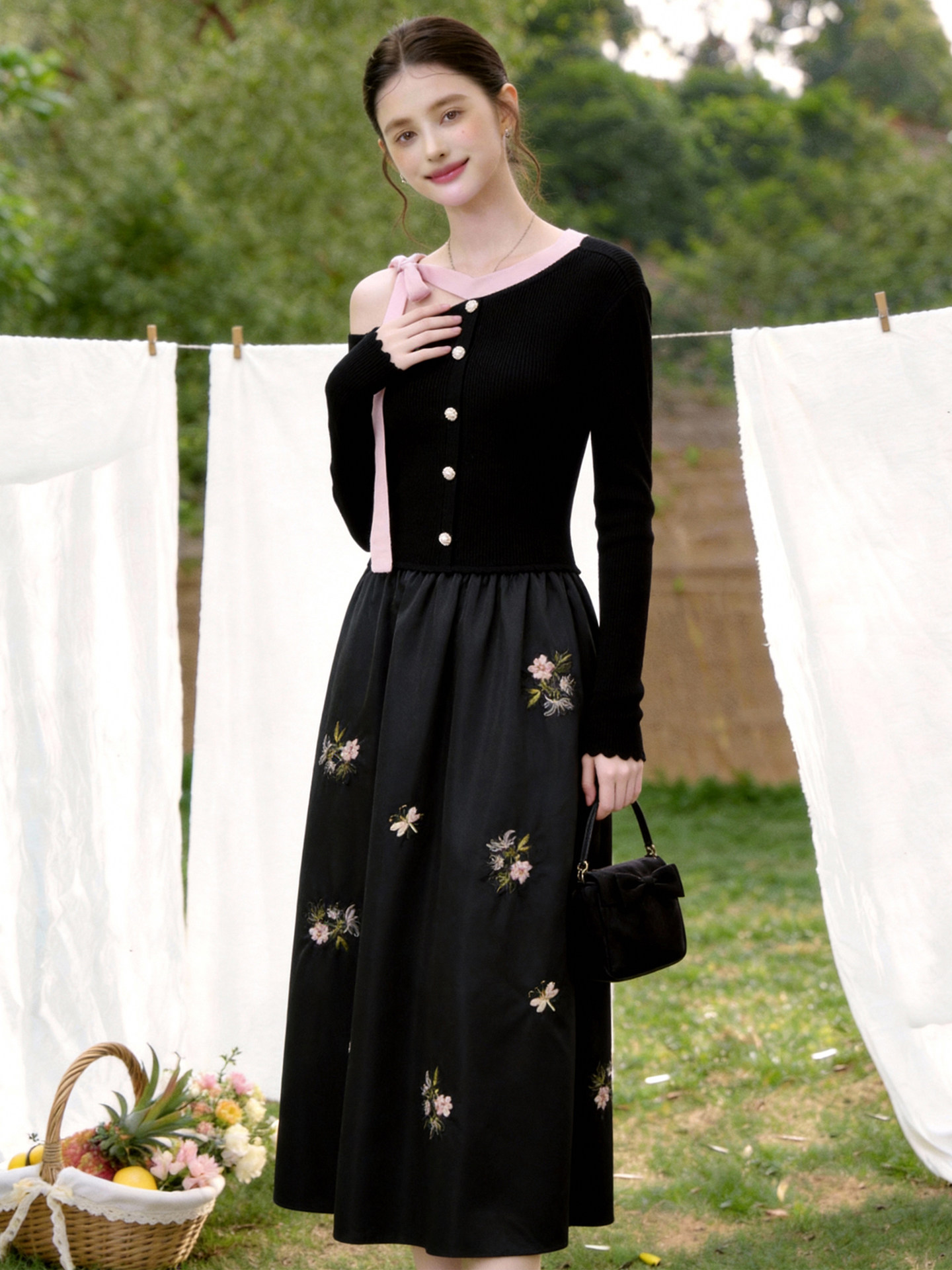 A Stylish and Elegant Mature Lady's Dress with Embroidered Bow, Off-Shoulder, Waist-Cinching, Hepburn-Style, Gentle and Graceful, Luxurious and High-End Dress