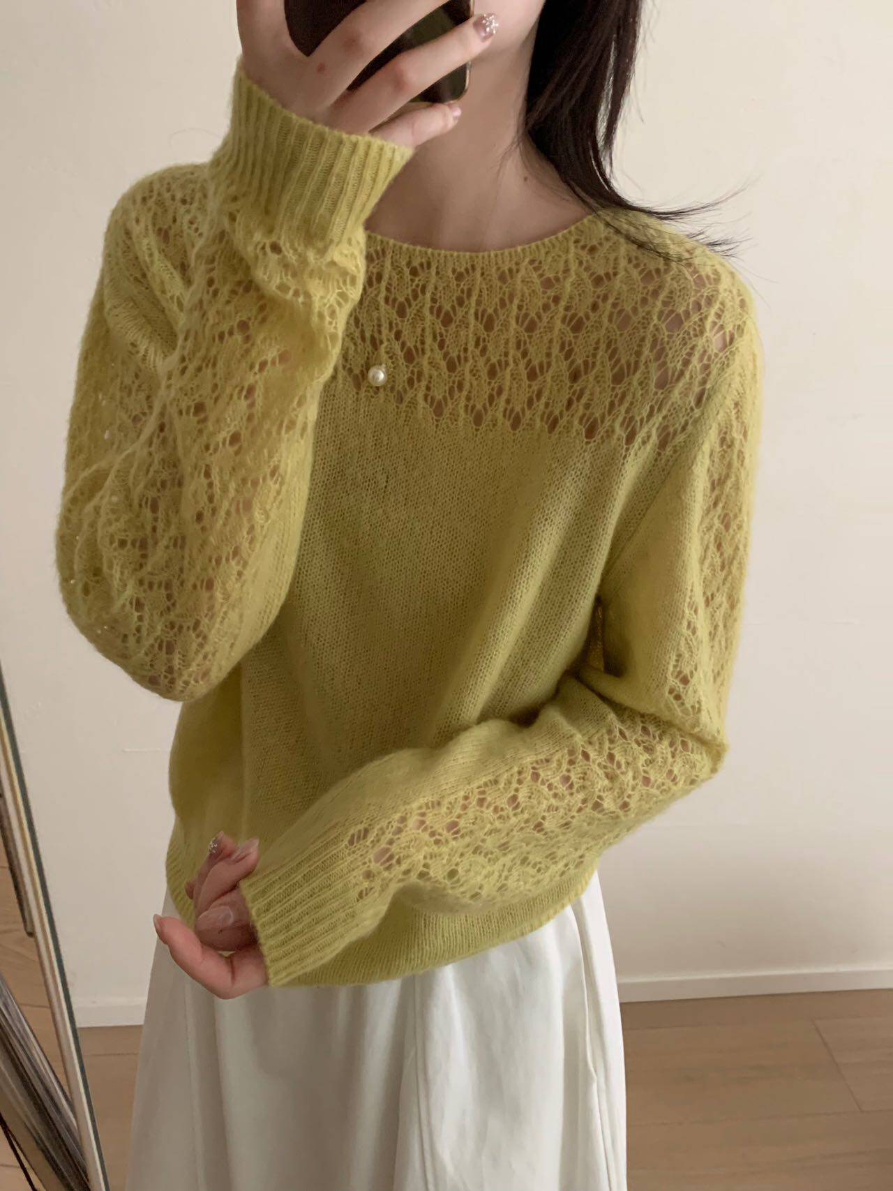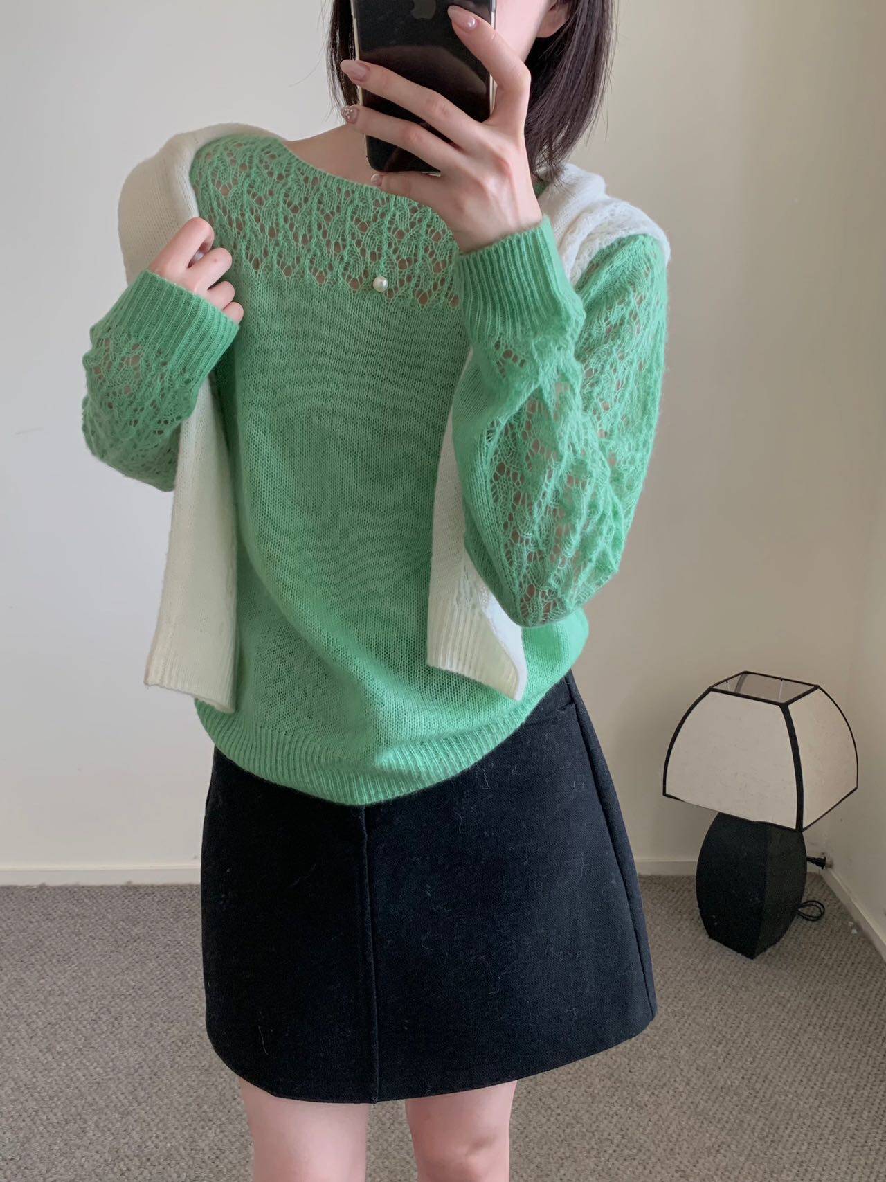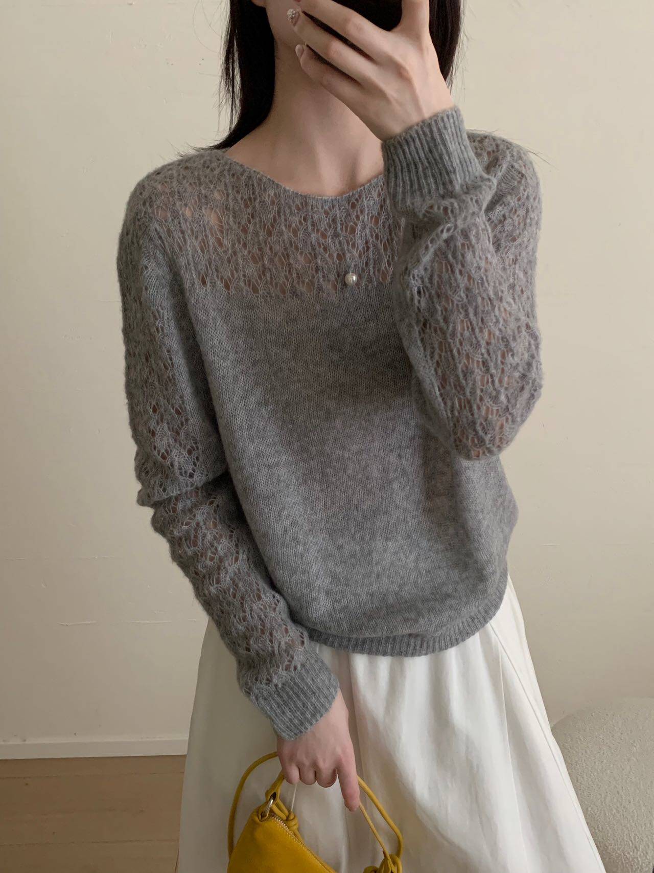Alpaca Wool 27120 Spring New Korean Style Loose Slimming Round Neck Hollow Knit Sweater for Women Versatile Sweater