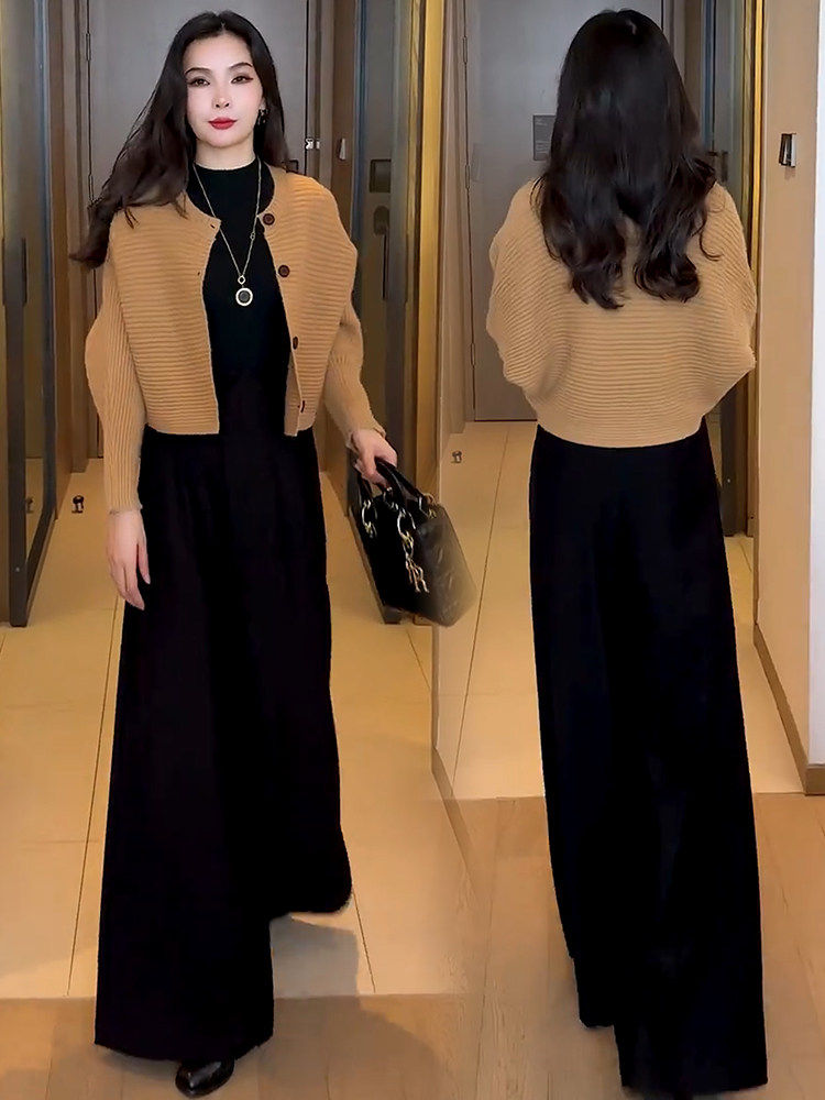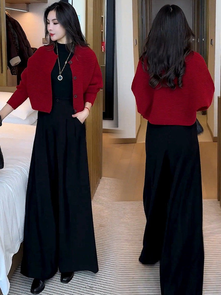 Jasmine Haute Couture New Year Outfit Set Women's Winter Fashion New Knitted Cardigan Jacket Wide Leg Pants Two-Piece Set
