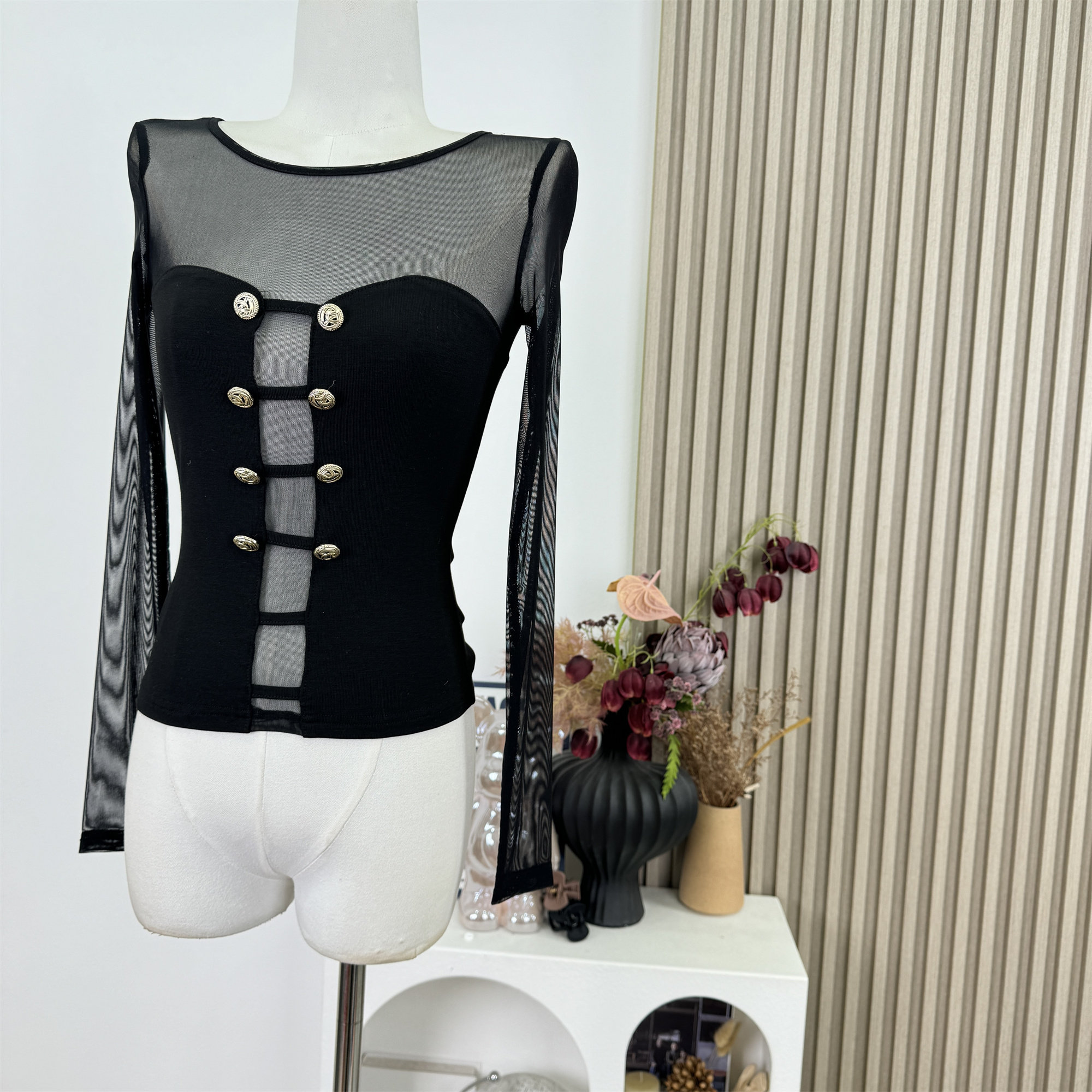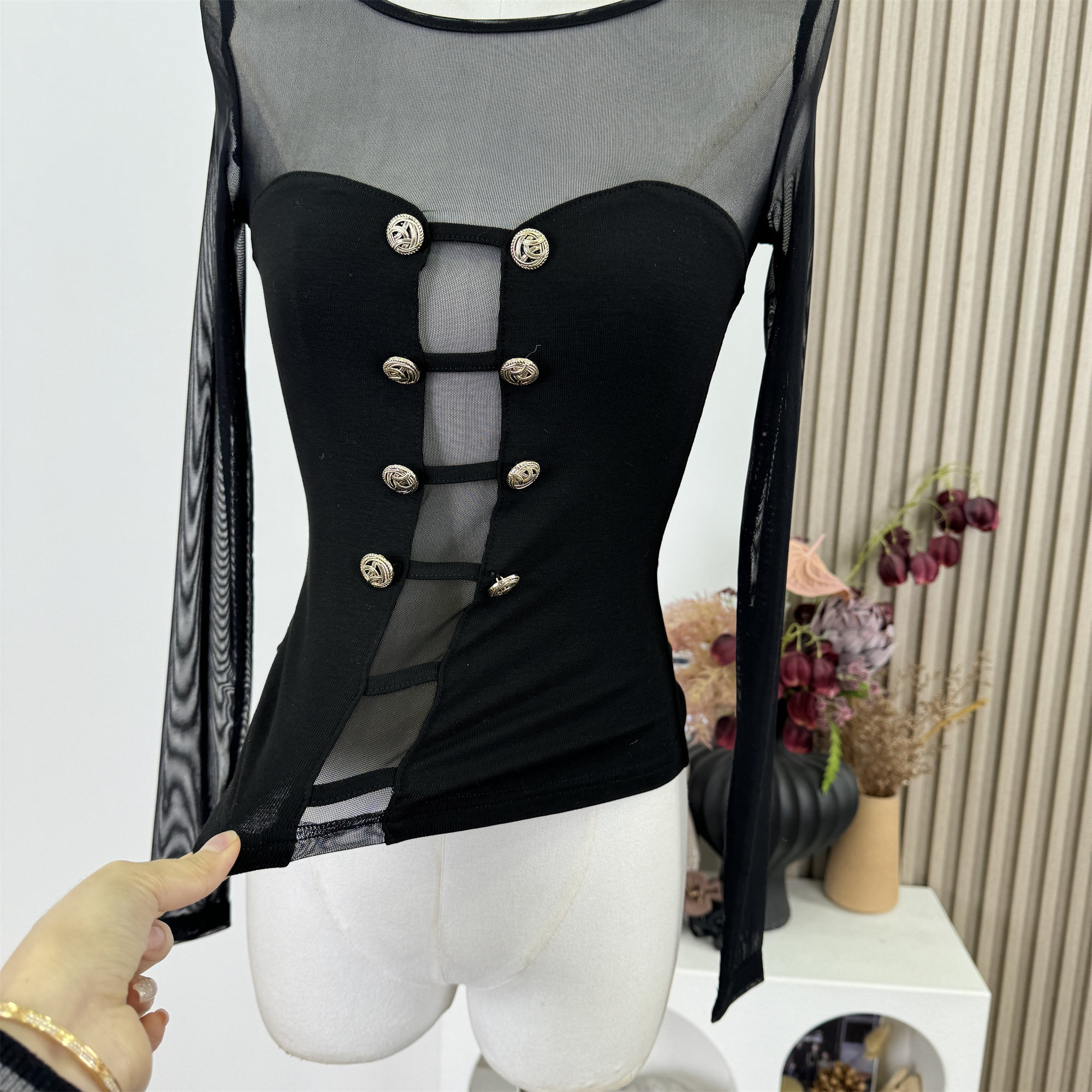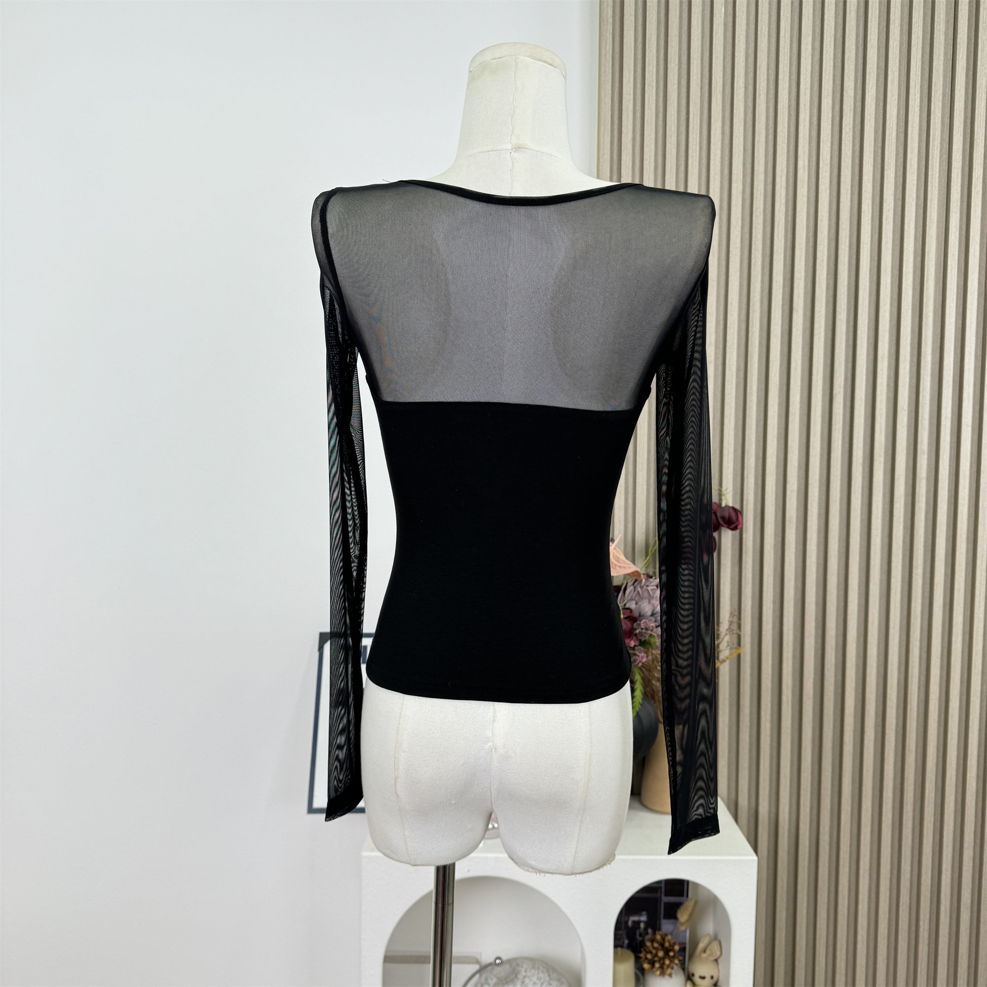 Popw New Design Sheer Mesh Patchwork Slim Fit Pure Desire Knitted Sweater Top