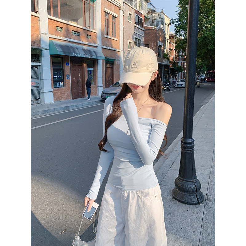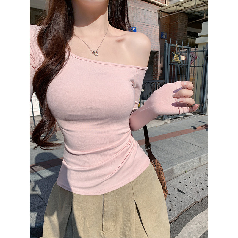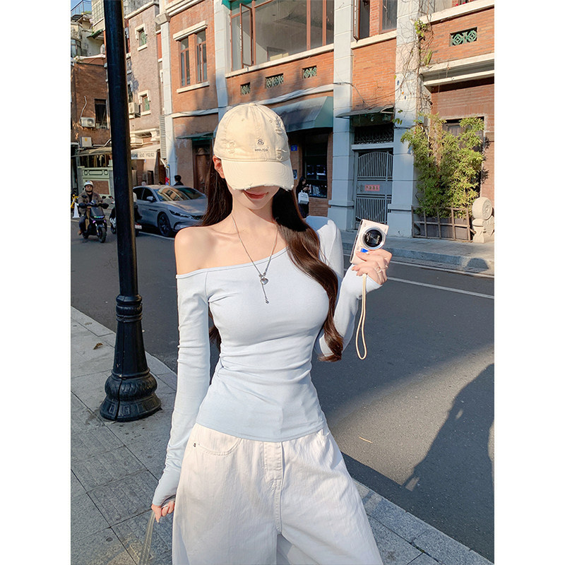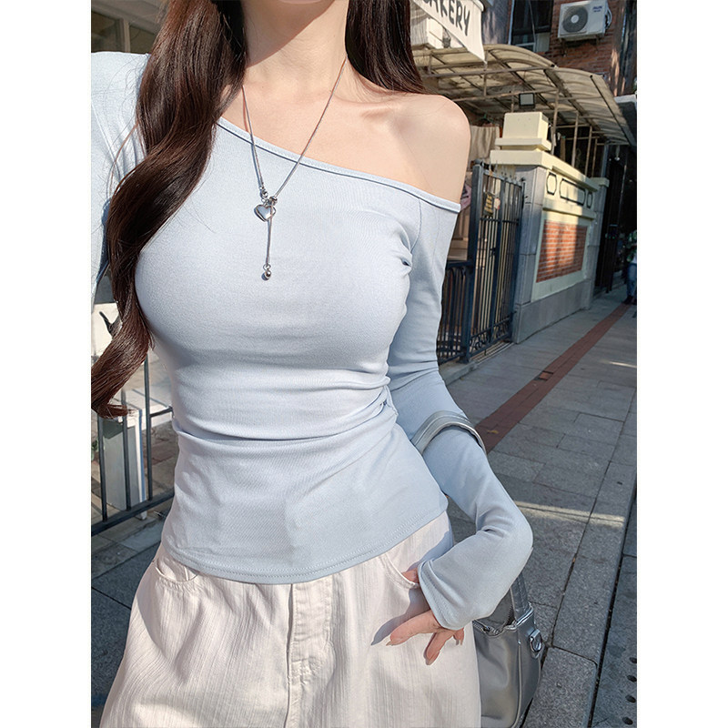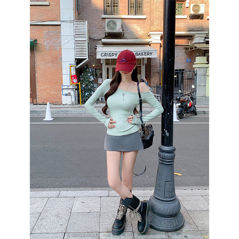 Mosesqueen green oblique shoulder long-sleeved t-shirt for women in autumn and winter hot girl one-shoulder bottoming shirt top