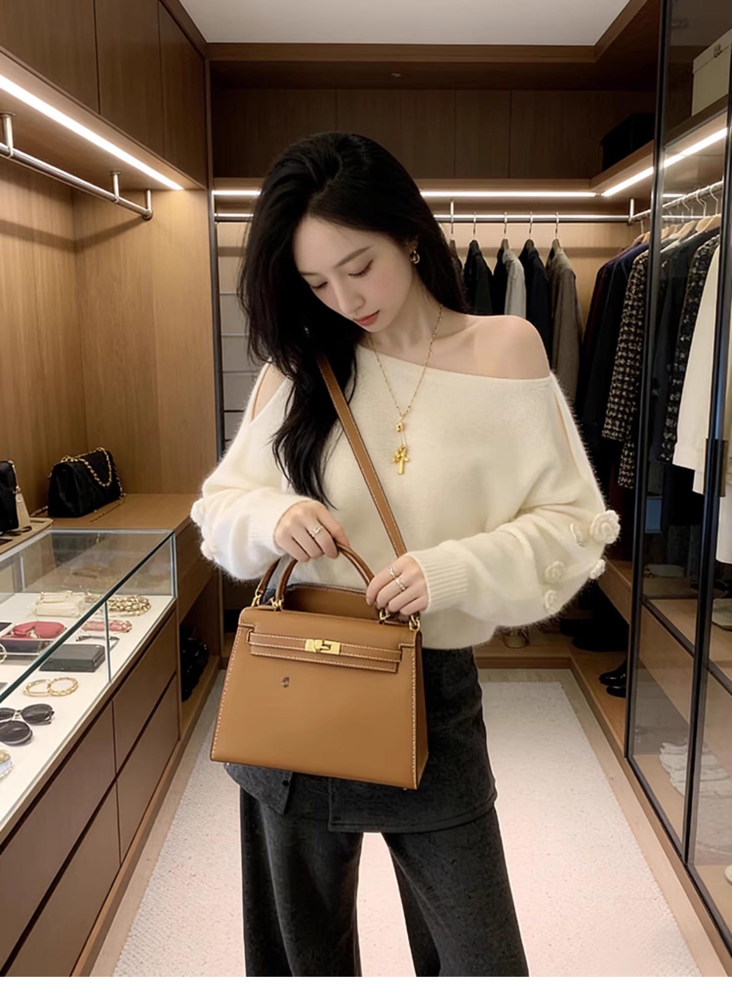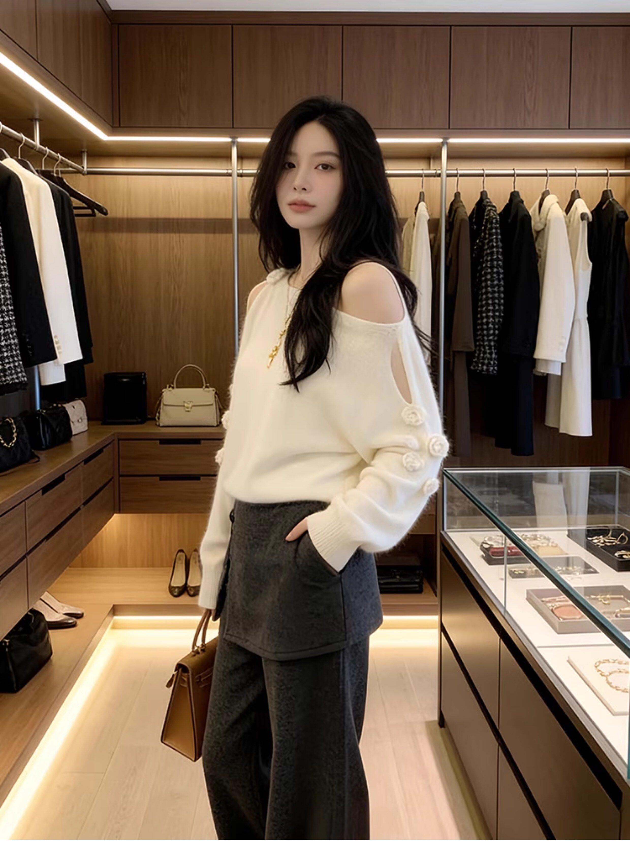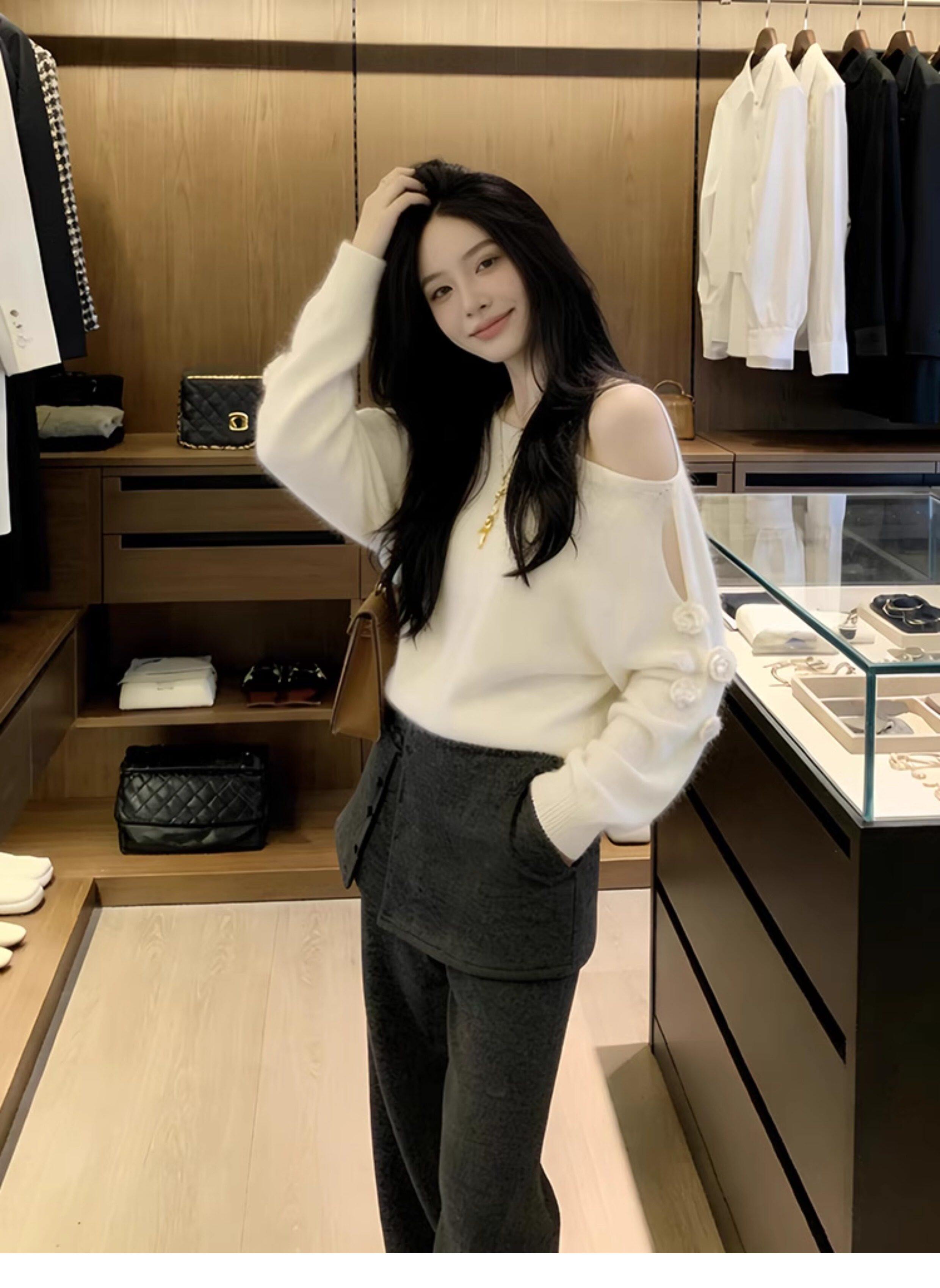 Stunningly Beautiful Floral One-Shoulder Knit Top for Women, Loose Fit, Off-Shoulder, Asymmetrical Shoulder Design, Suitable for Autumn and Winter