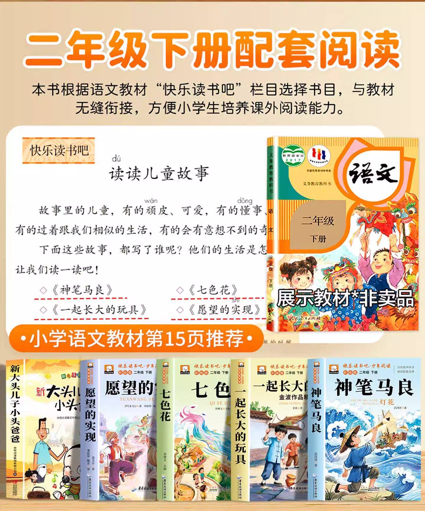 A complete set of 5 volumes. The second volume of Ma Liang's second grade must-read authentic extracurricular books. The teacher recommends Seven Color Flowers. Happy Reading Bar 2. Second Reading Books People's Education Edition. Toys that grow up together. The fulfillment of wishes.