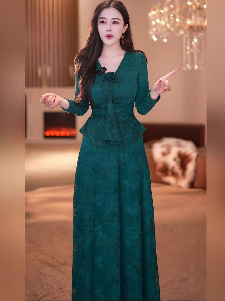 Elegant and Luxurious Dark Blue Lace Dress for Women, Long-Sleeved, Waist-Cinching, Slit Long Dress, High-End, Slim-Fit, Flattering
