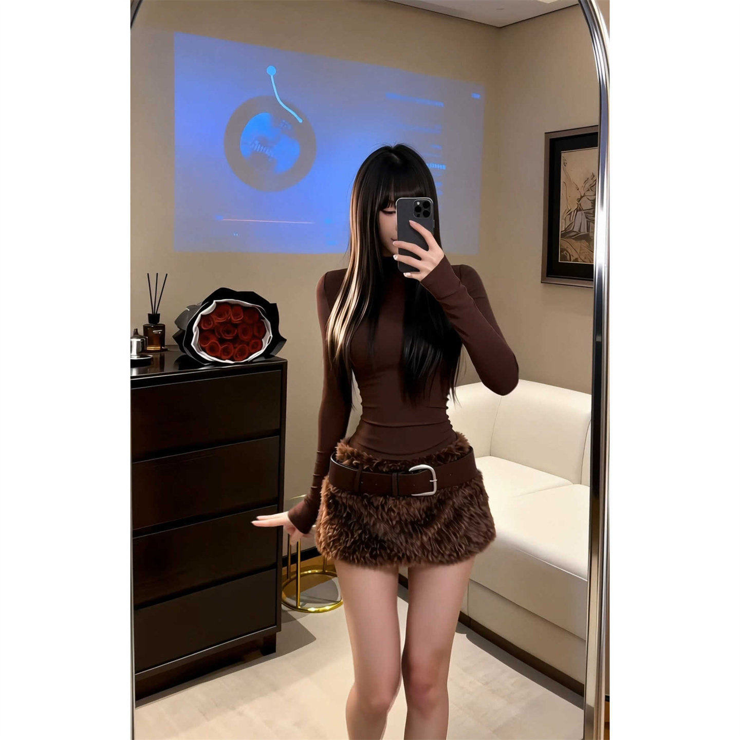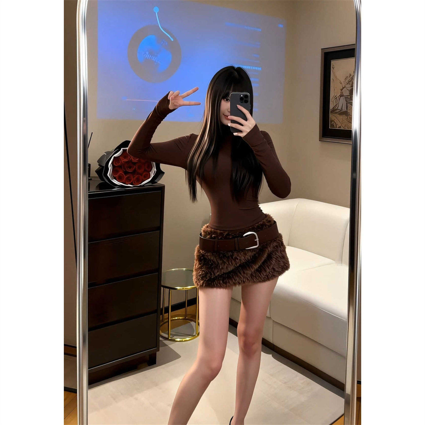 Stylish, comfortable and casual high-neck slim top, furry skirt suit, good-looking women's spring slimming outfit