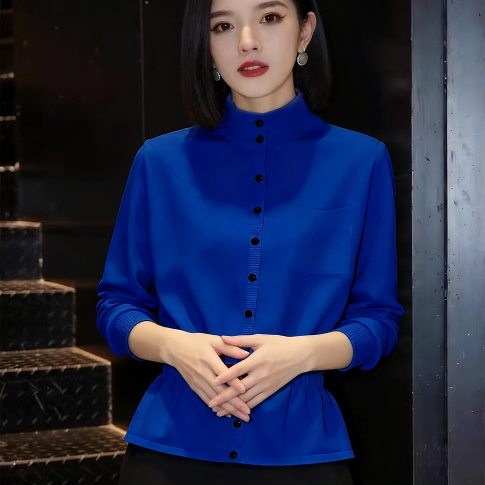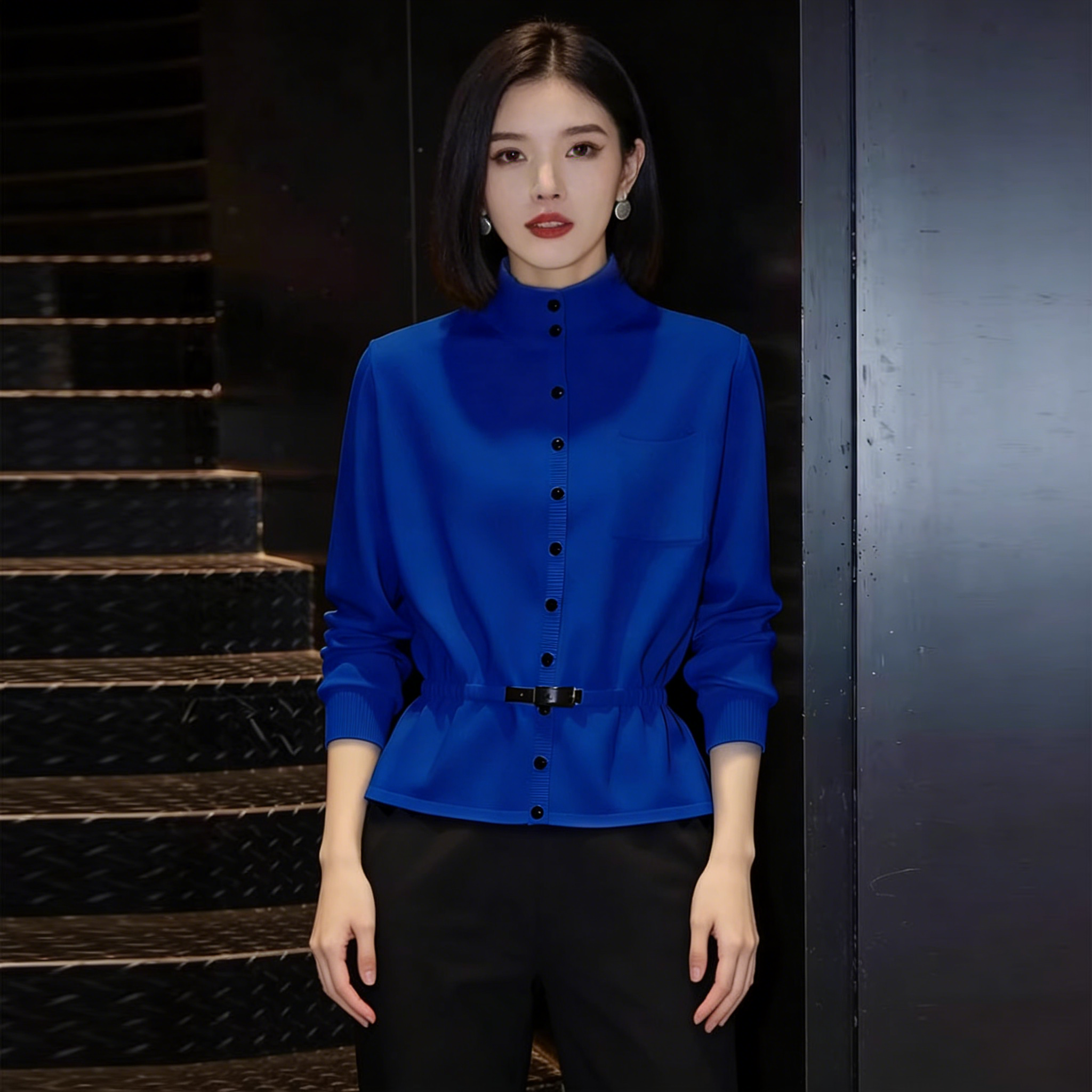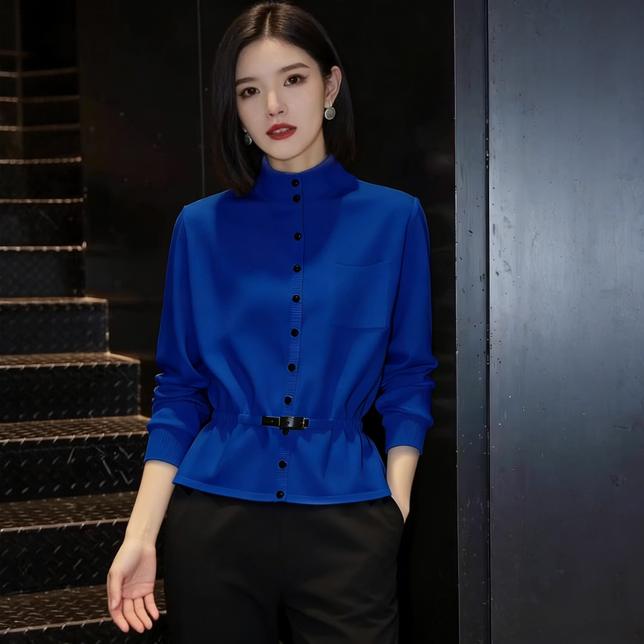(in Stock) Klein Blue High-Neck Long-Sleeve Top 2026 Spring New Style Waist-Cinching Button-Down Slimming Shirt