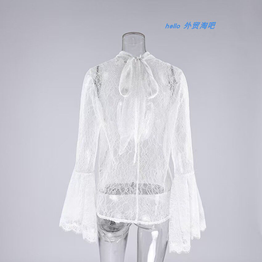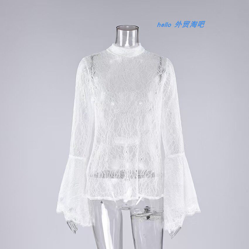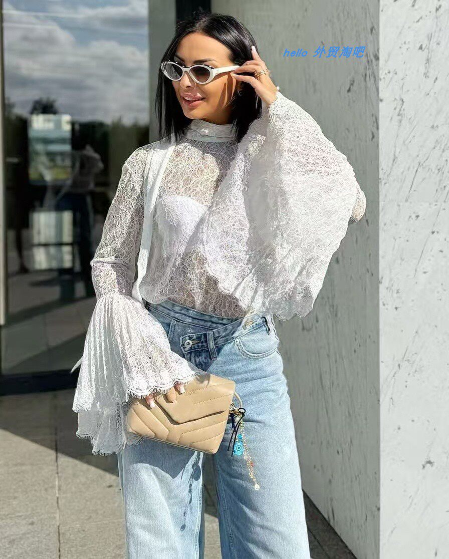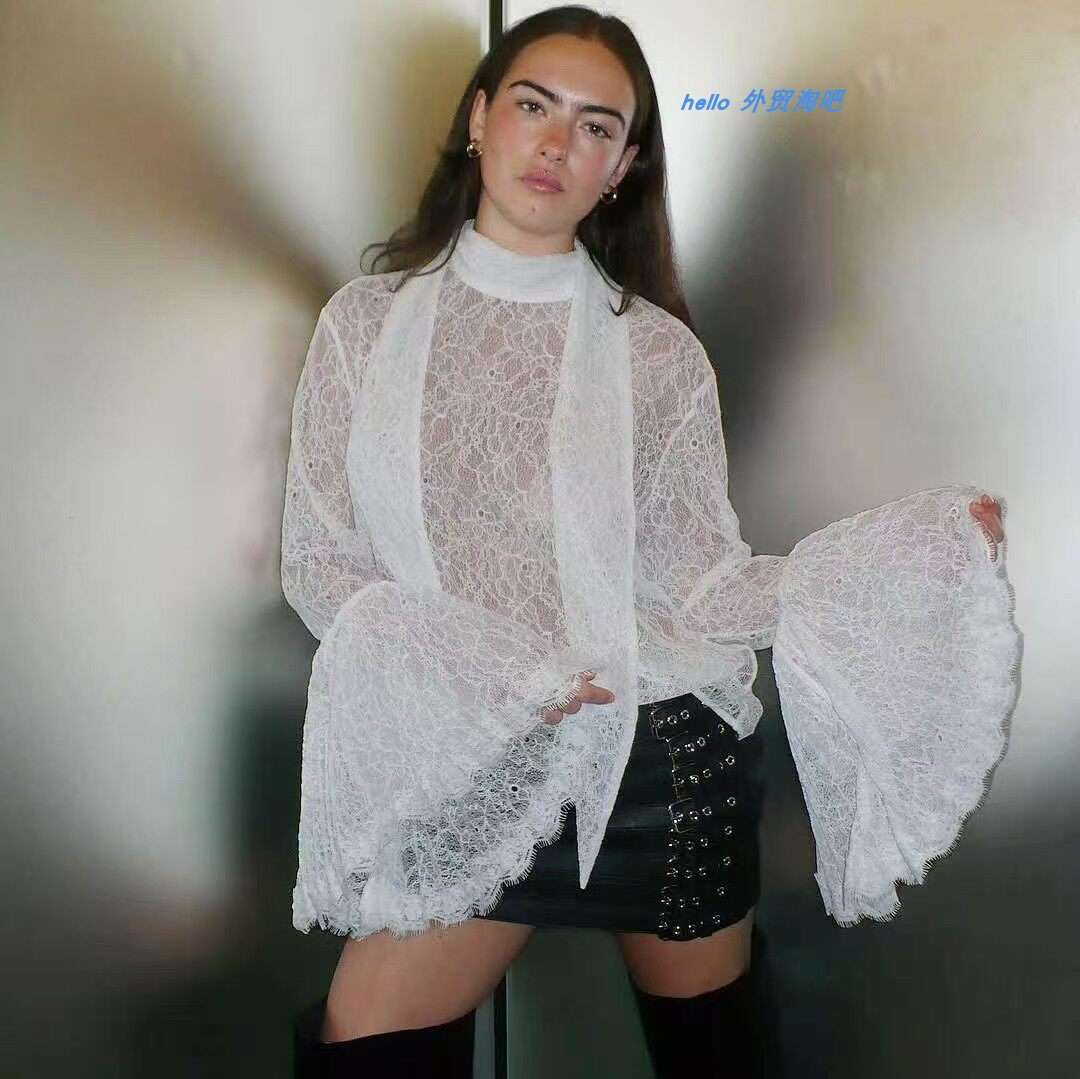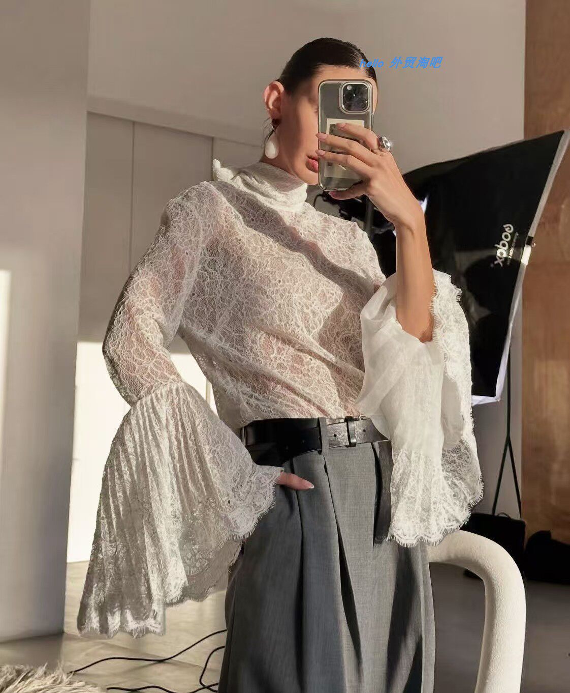 New French-Style Sexy Sheer Lace Blouse with Ruffle Sleeves, Elegant Top Perspective Sexy Top