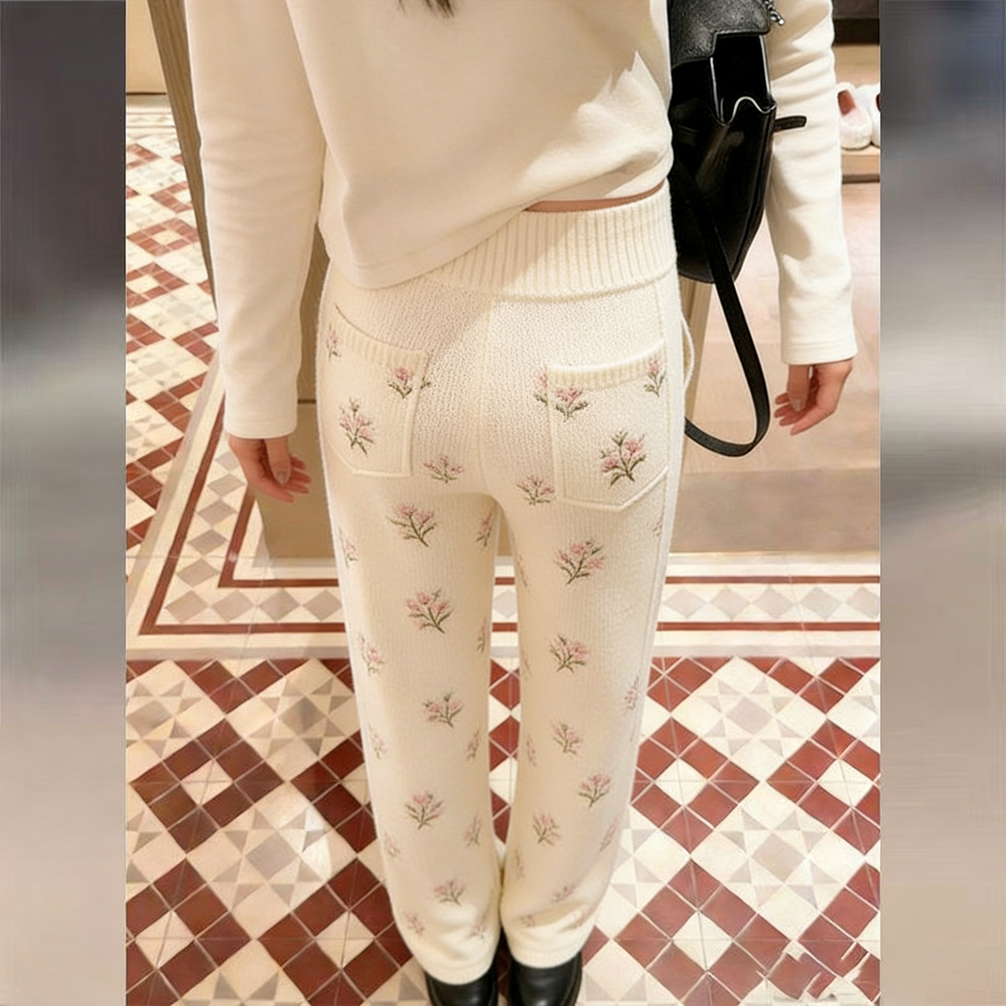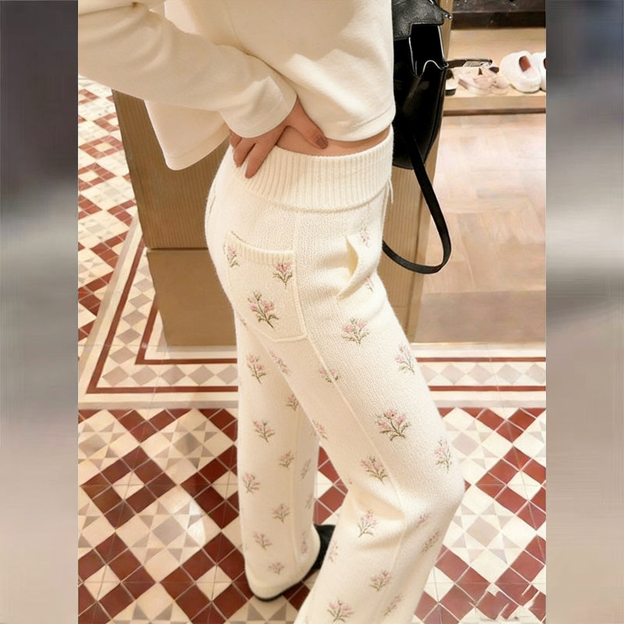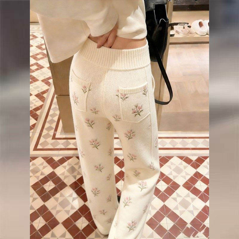 (In stock) French white printed knitted straight pants 2026 new spring versatile loose wide-leg trousers