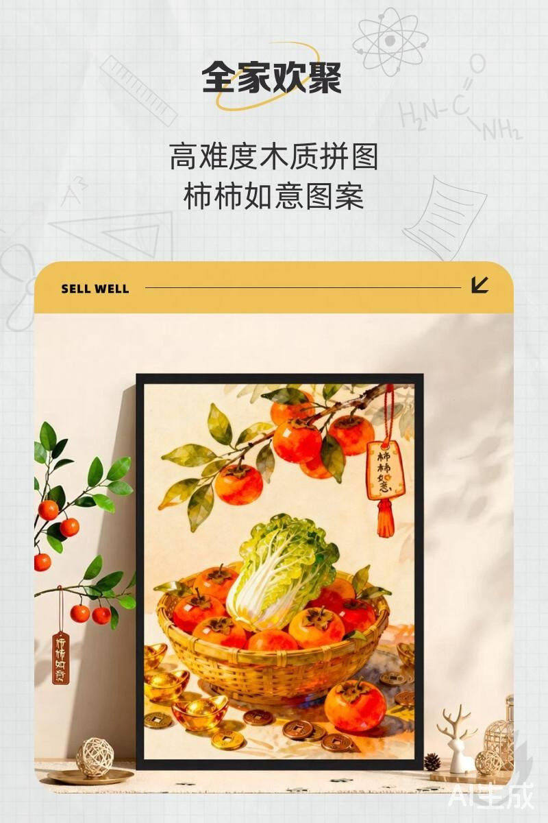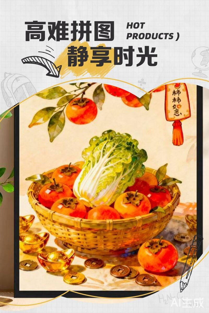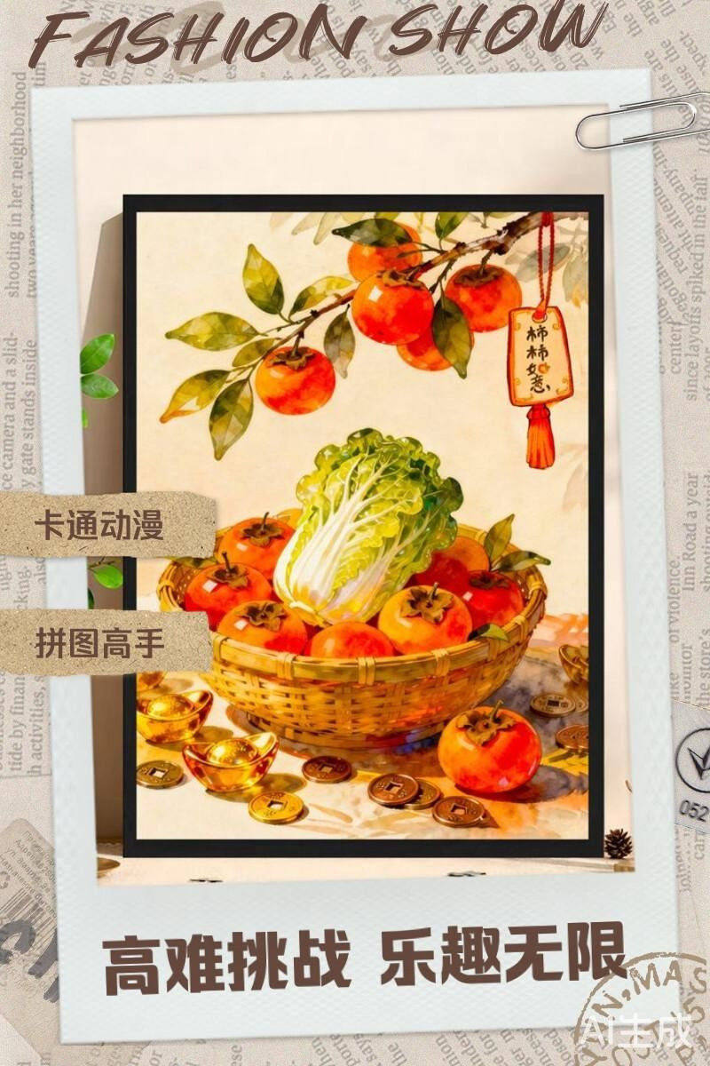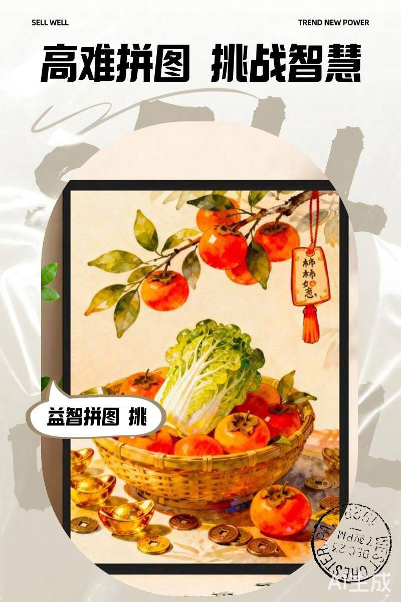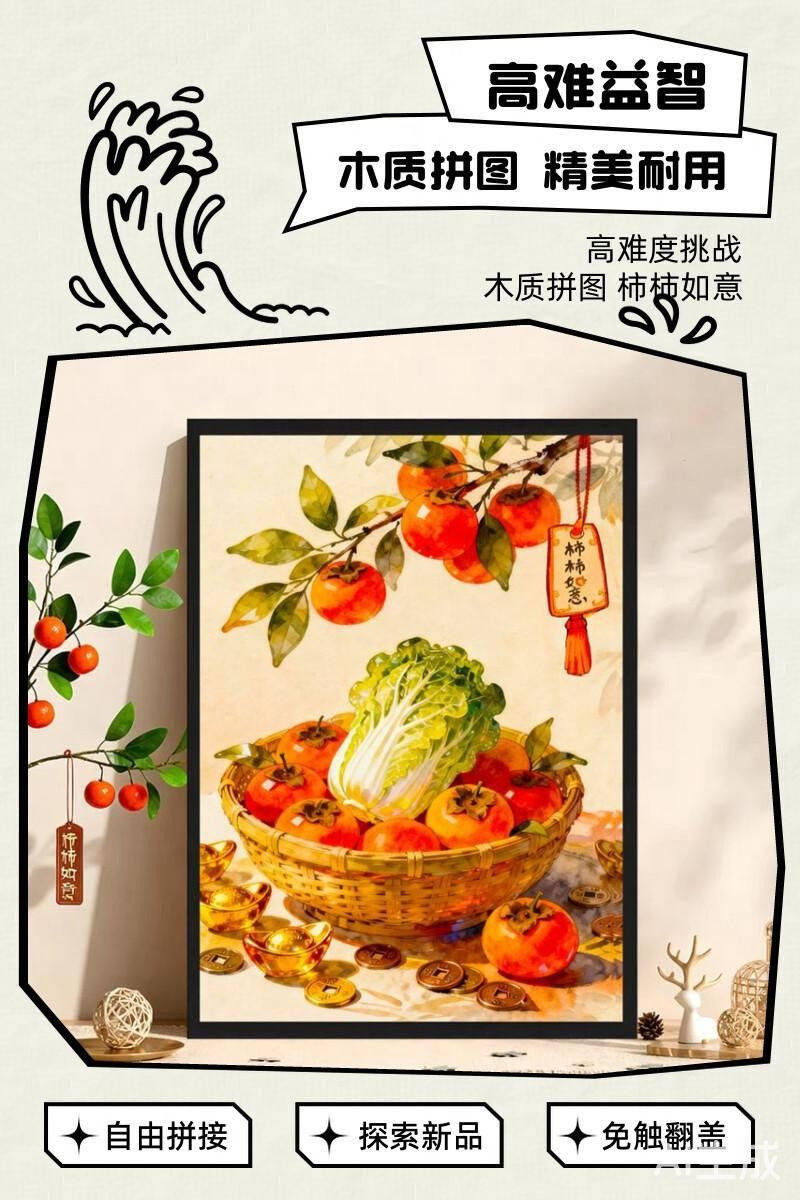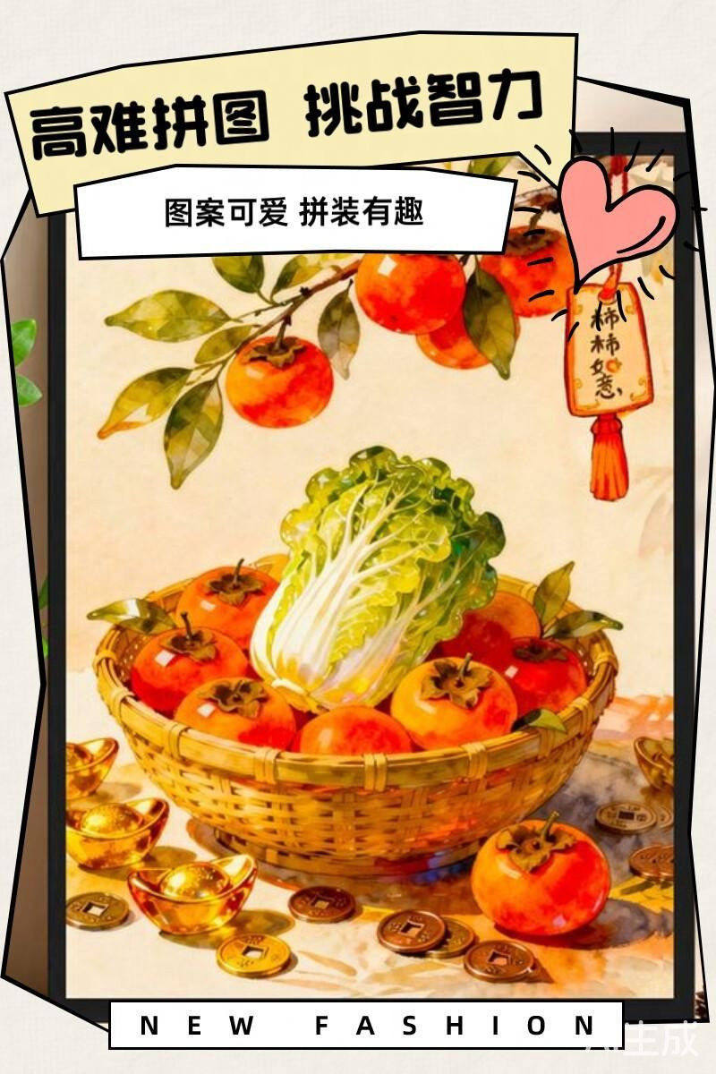 Highly Difficult Puzzle for Adults, 1000 Pieces, Persimmon Good Luck Cartoon Children's Toy, New Year's Fortune Series, 300 Pieces