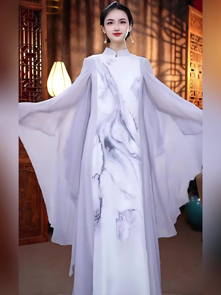 Mijie 2026 Spring New Chinese Style Ink Print Dress for Women, Long Sleeve Stand Collar, Elegant Slimming Long Dress