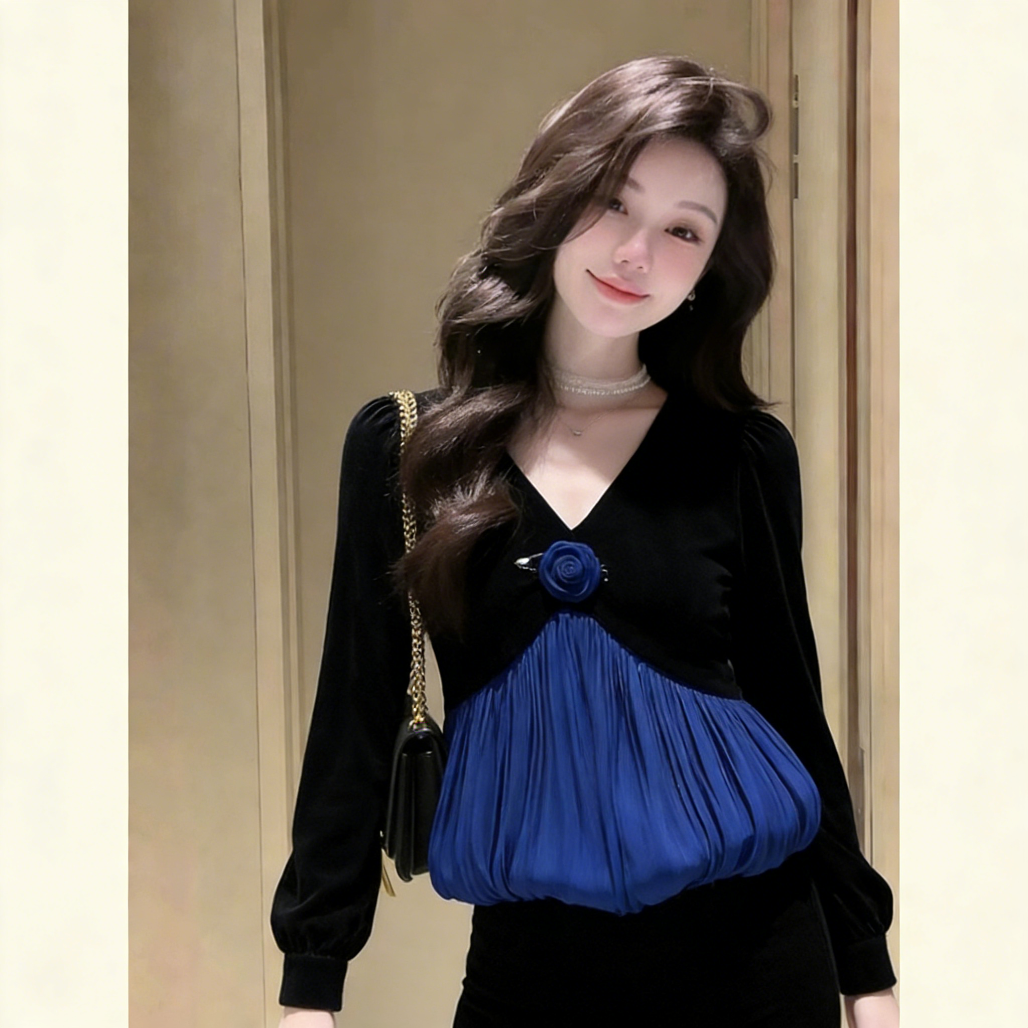 (in Stock) 2026 Spring French-Style Unique and Exquisite Top, Light Luxury, Age-Reducing, Chanel-Inspired Black Velvet Patchwork Shirt