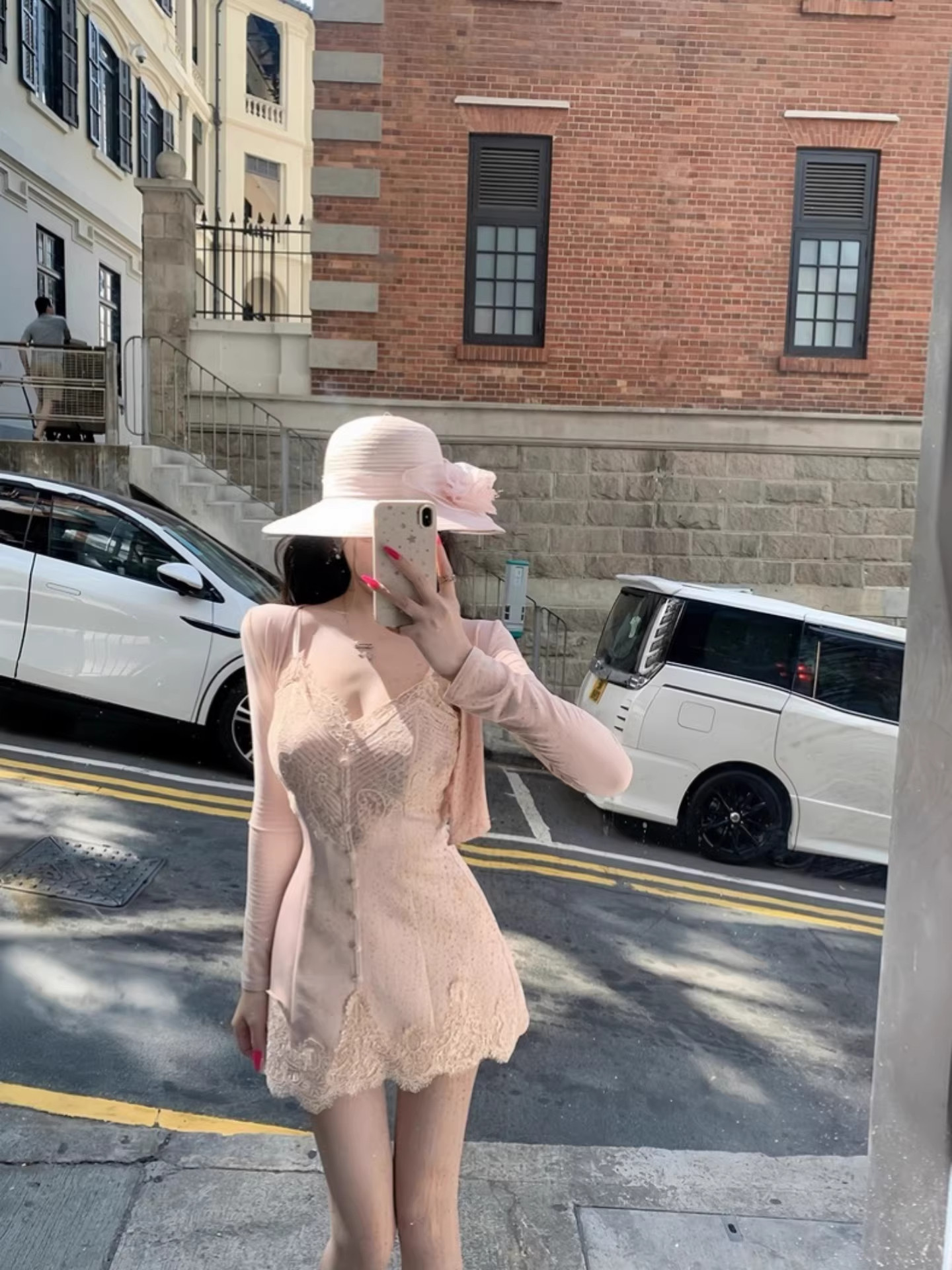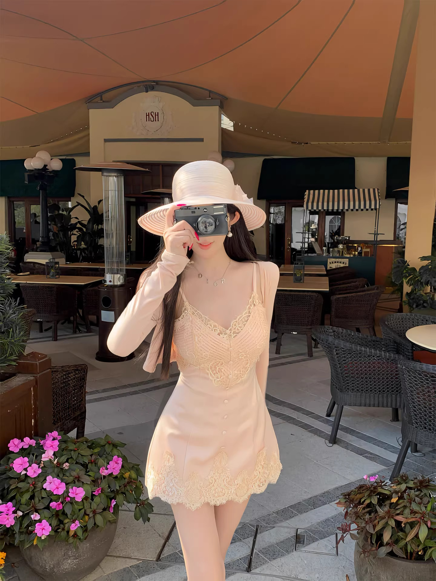French Pink Lace V-Neck Suspender Dress for Women in Early Spring, Sexy and Pure, Waist-Cinching, Beautiful Princess Short Skirt