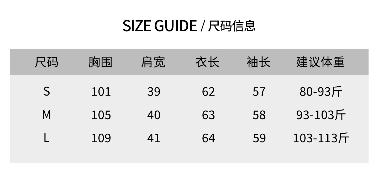 China (cm) 165 / 88-90 170 / 96-98 175 / 108-110 180 / 118-122 185 / 126-130