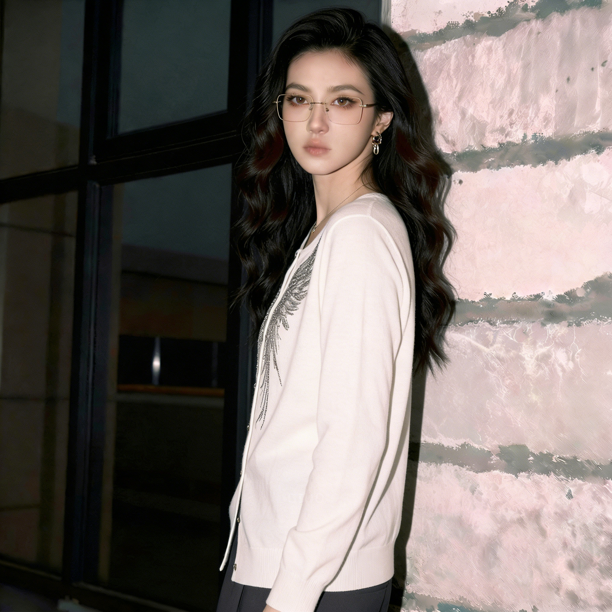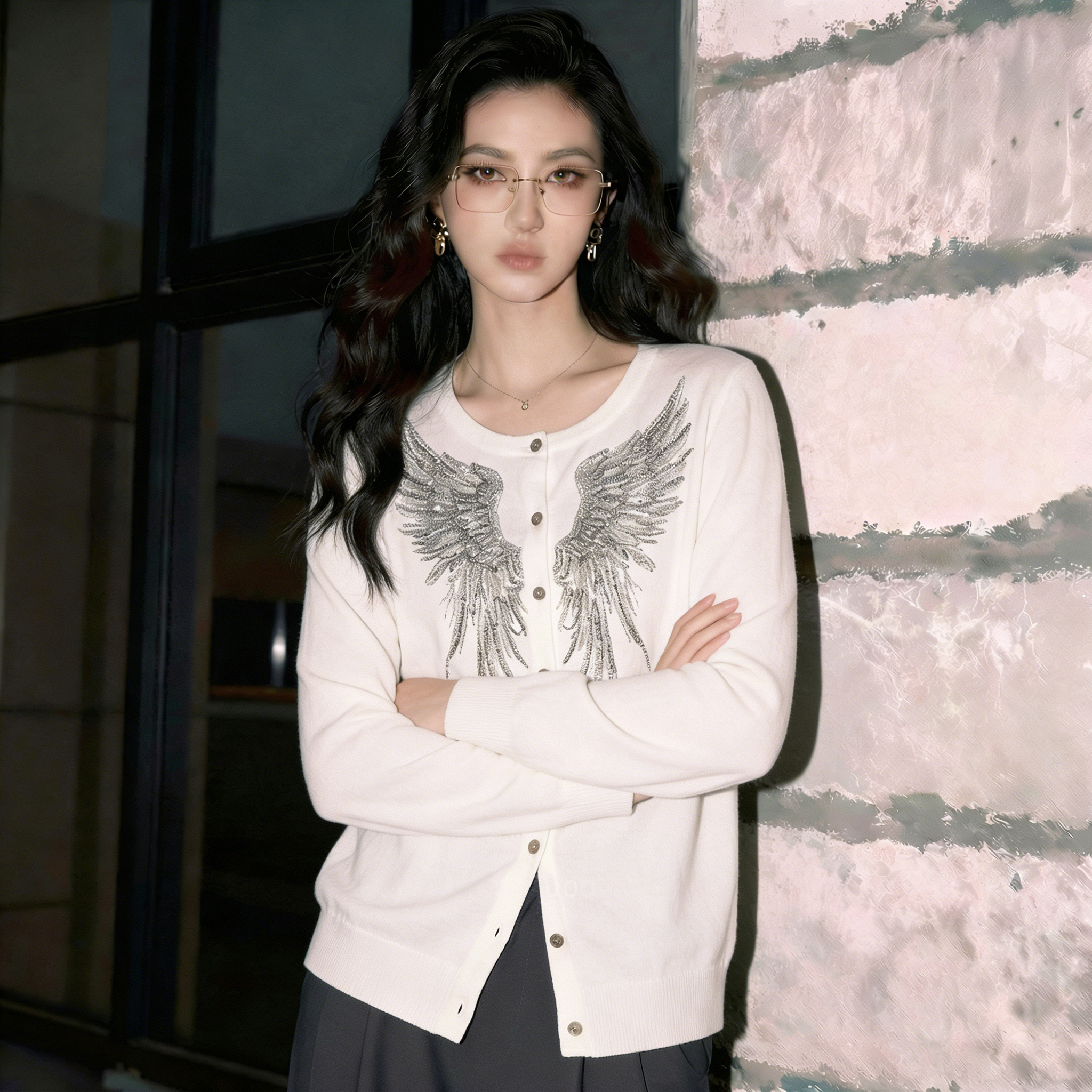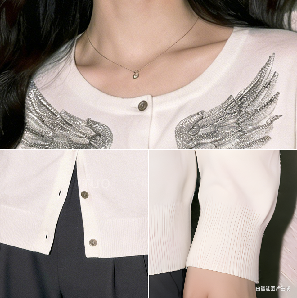 (in Stock) 2026 Spring New Fashion Rhinestone Wing Knit Cardigan Women's Long-Sleeve White Top Button-Up Shirt