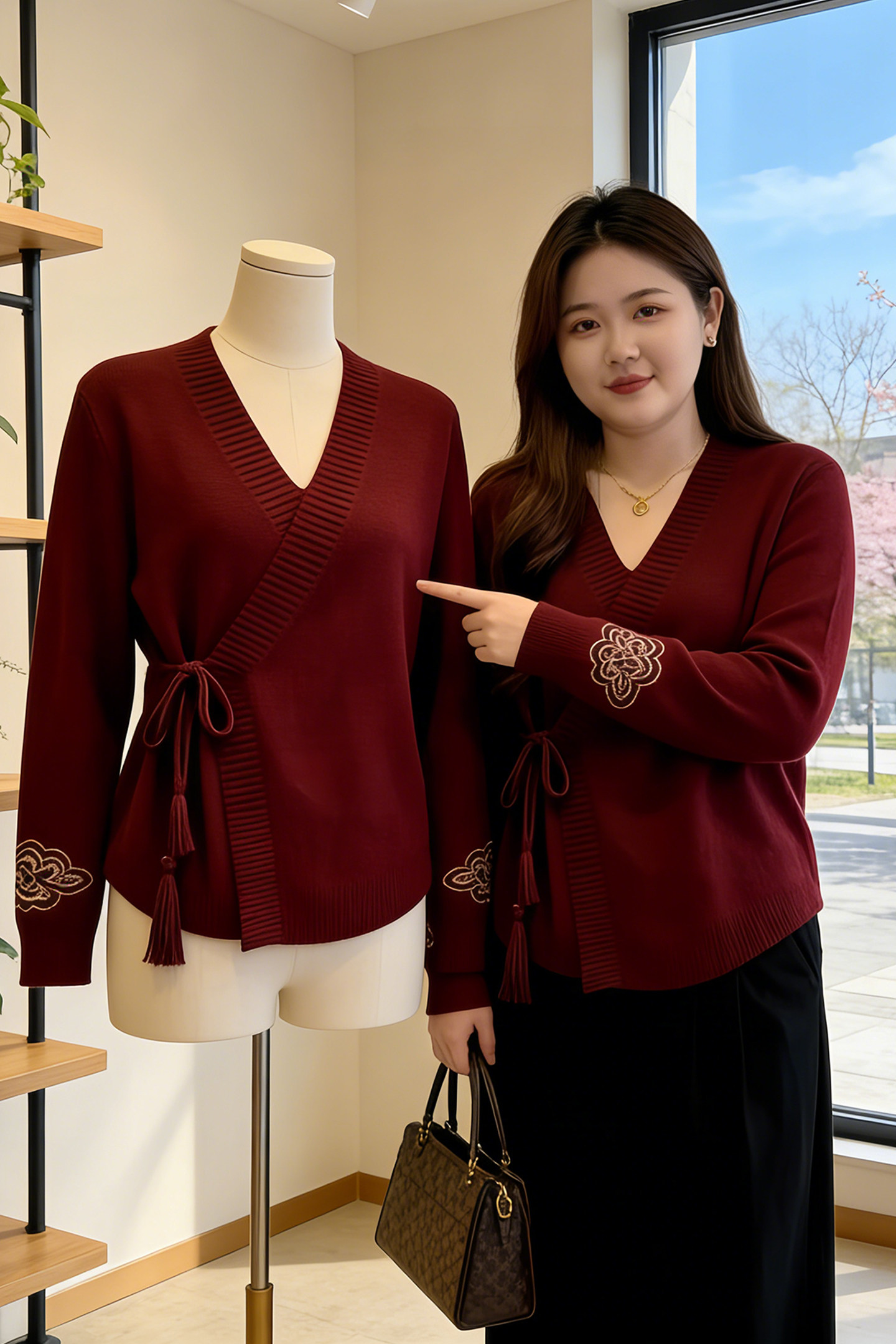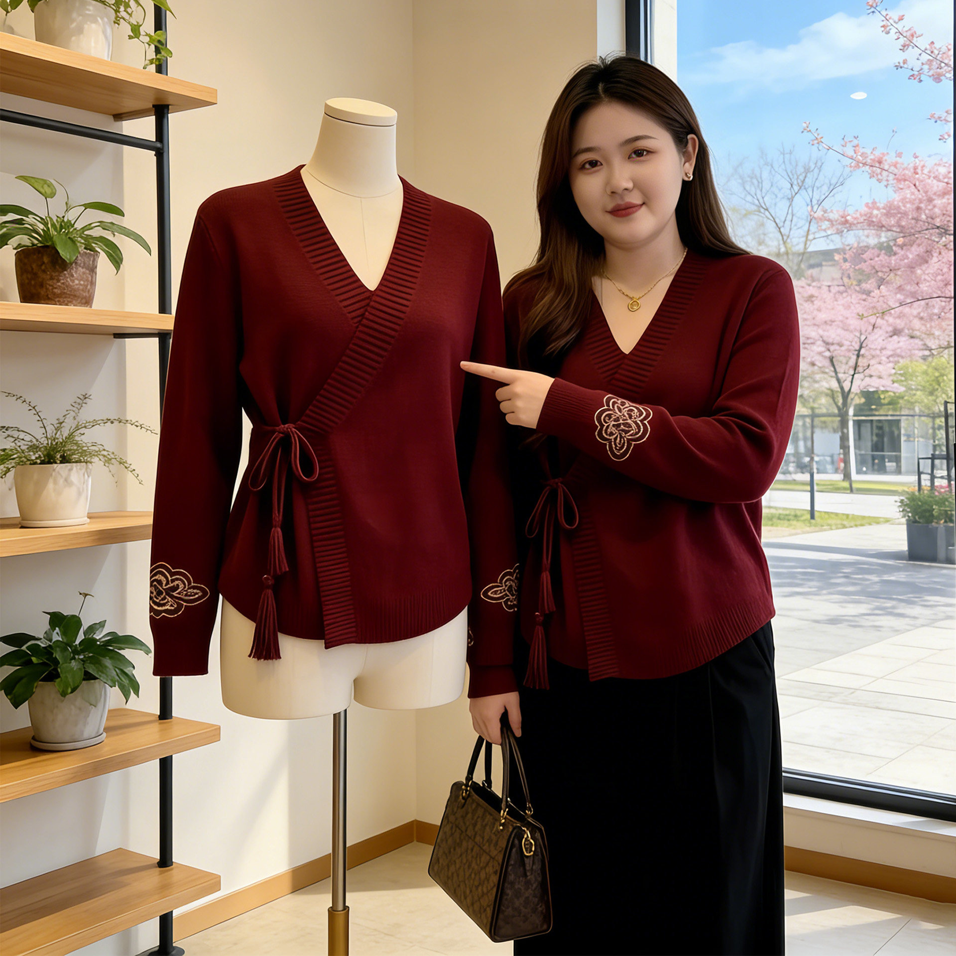 Large size lazy loose huge flesh-covering inner top red slightly fat mm new Chinese style national style retro v-neck sweater