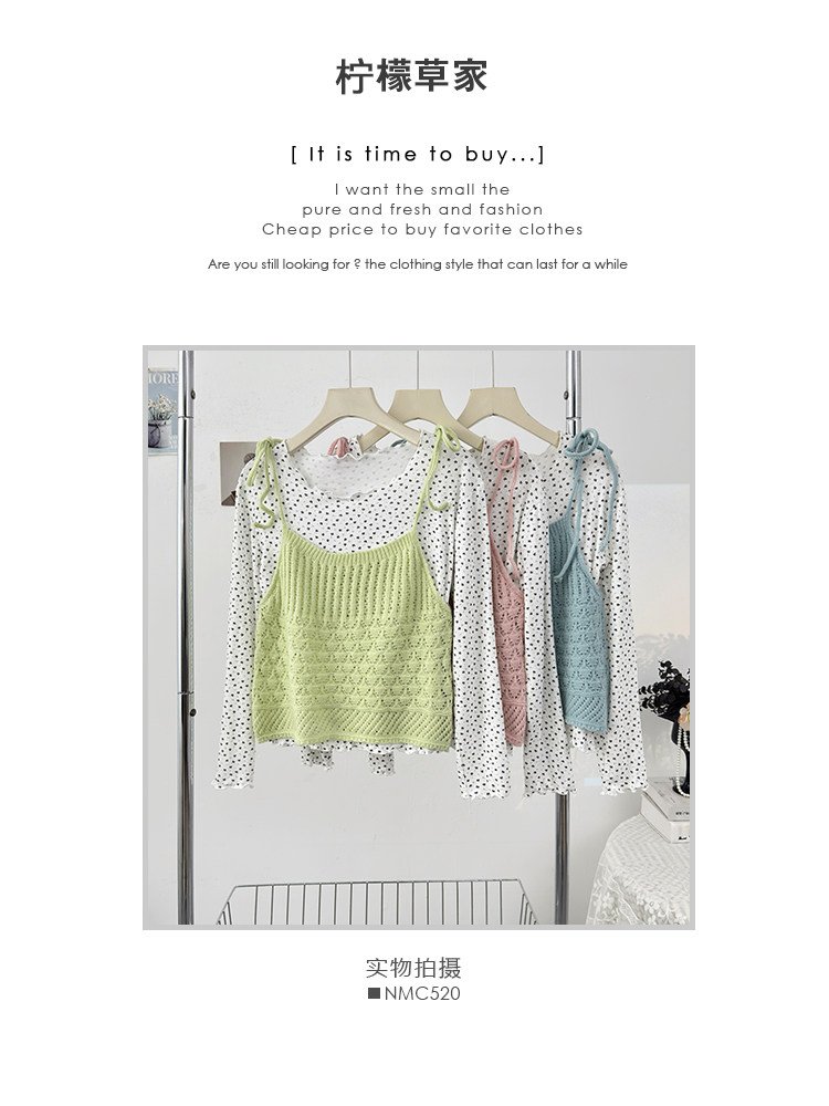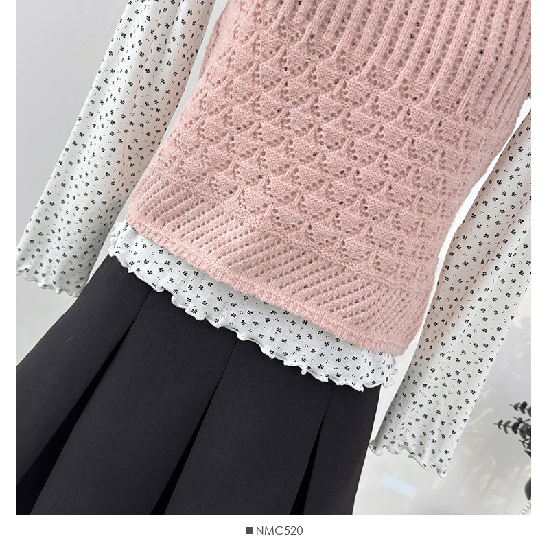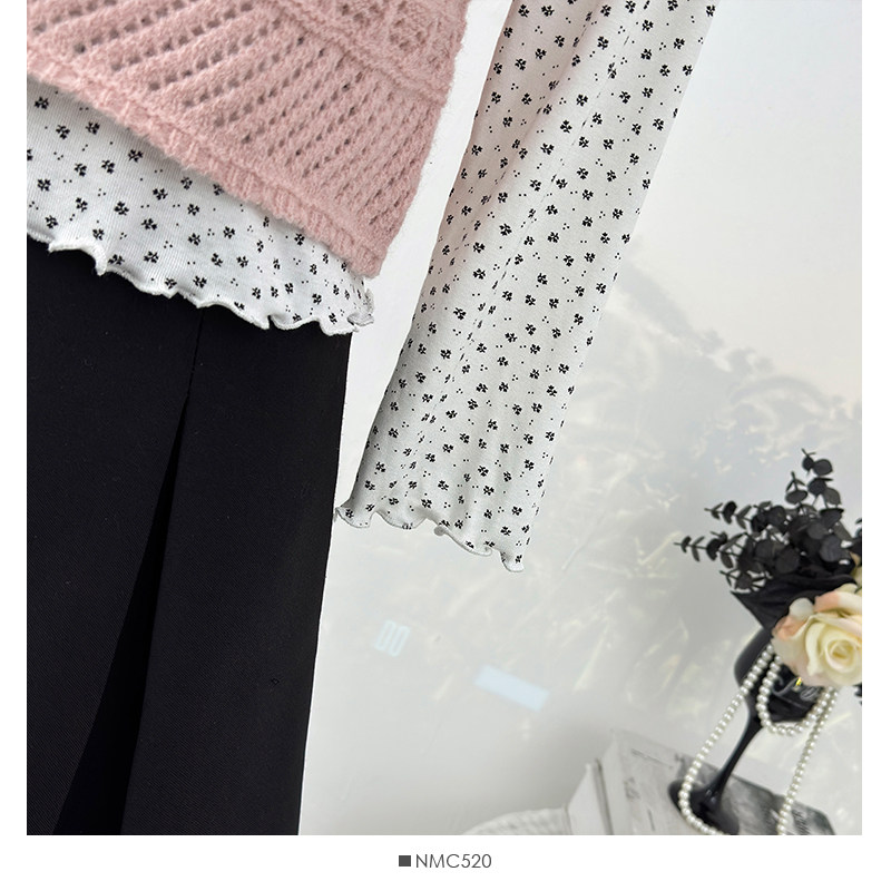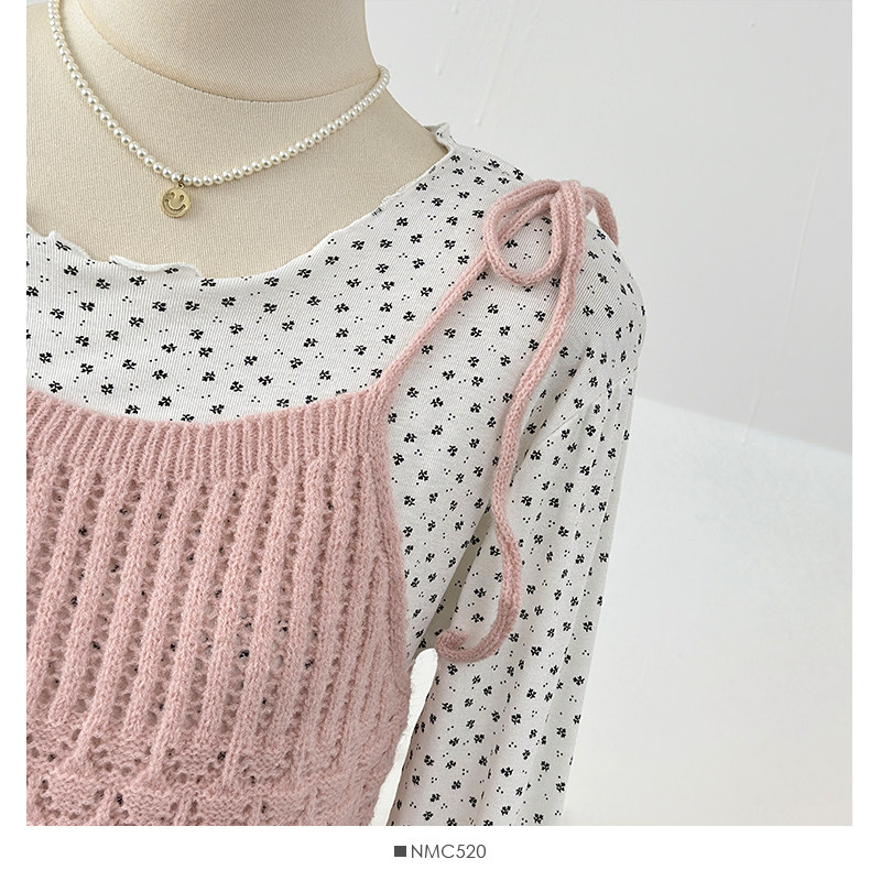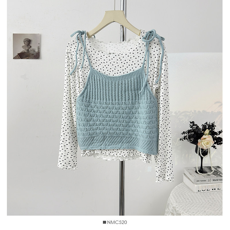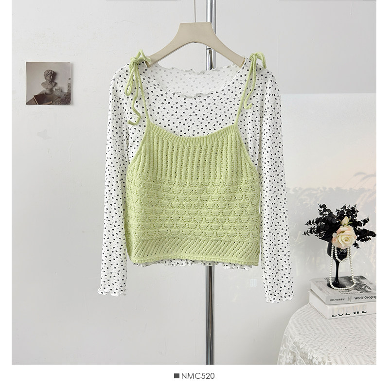 Sweet and fresh floral wood ear long-sleeved T-shirt for women spring 2026 layered knitted camisole two-piece set