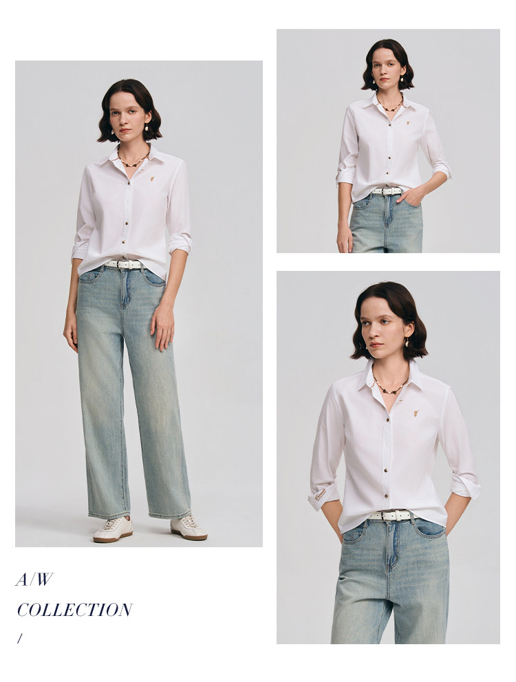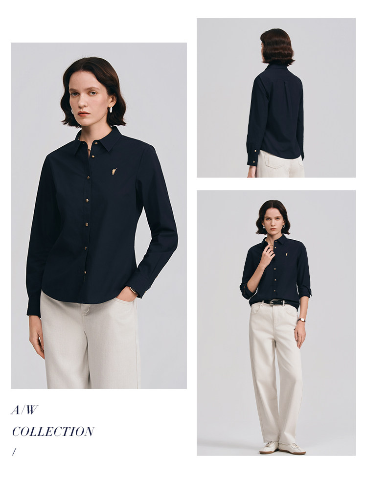 Polowalk Simple Embroidered Pure Cotton Long-Sleeved Women's Shirt Spring & Fall New Business Casual Pure Color Lapel Shirt