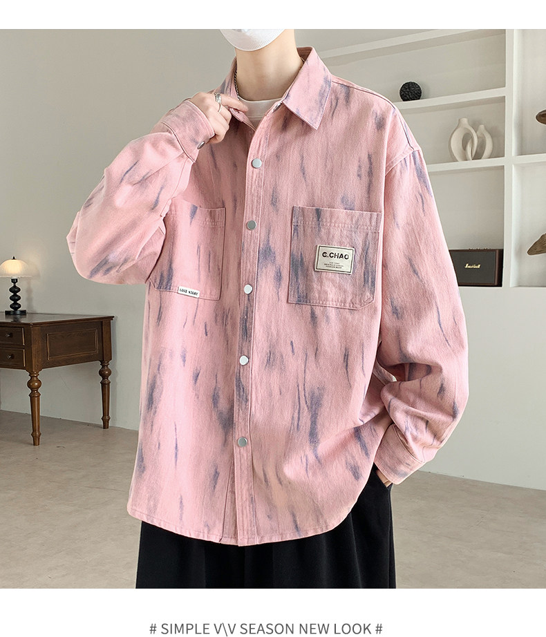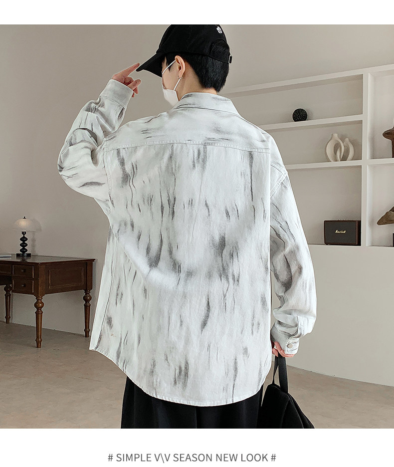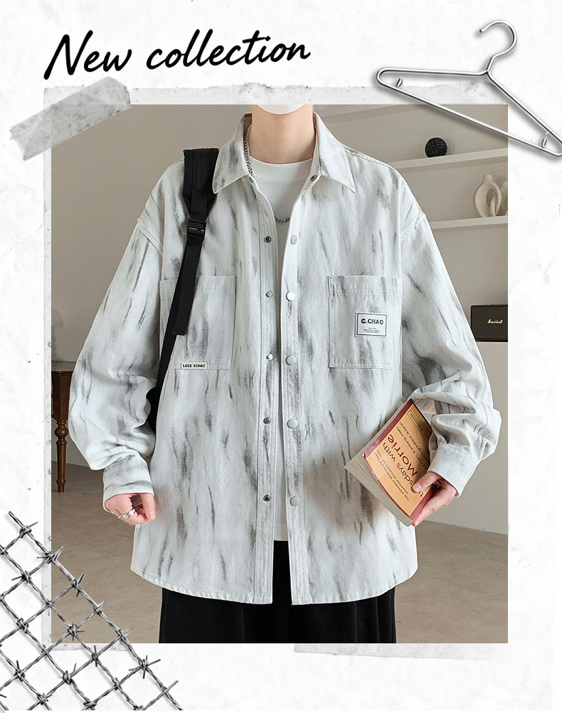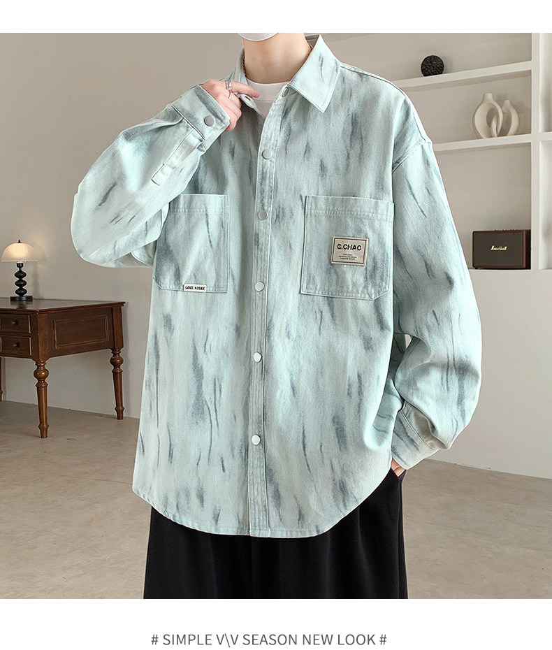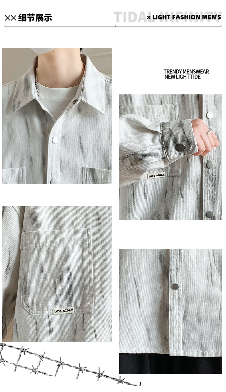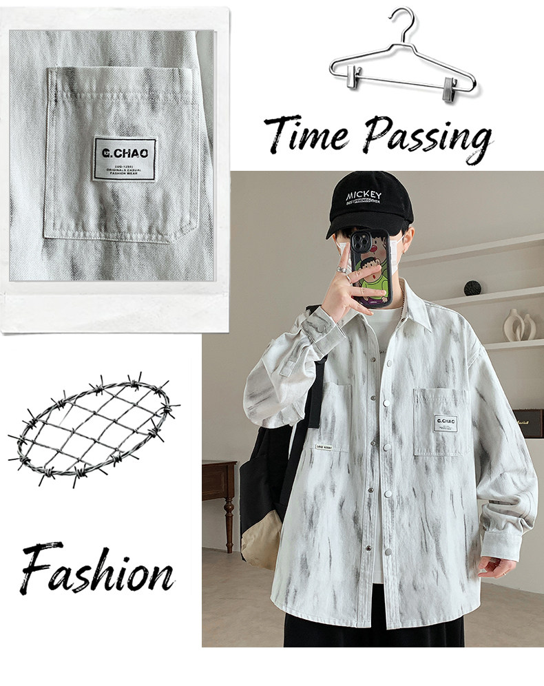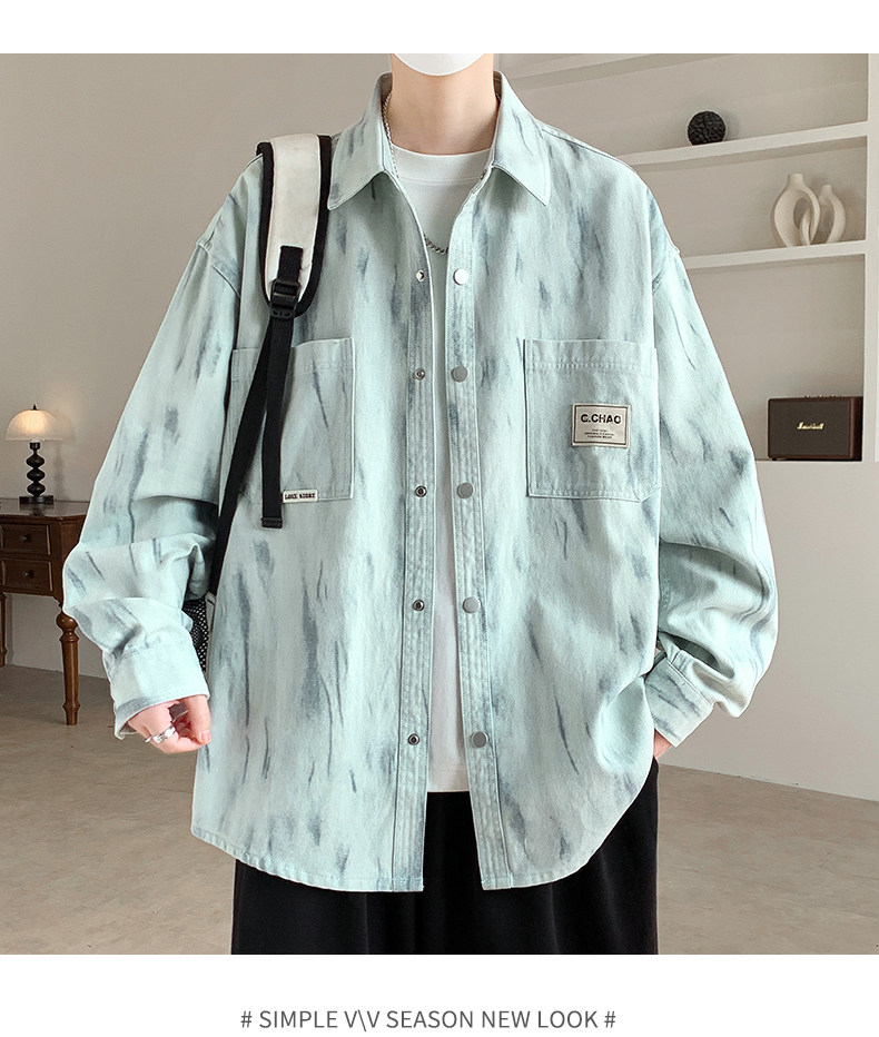 Pure Cotton Long-Sleeved Shirt for Men in Spring and Autumn, Stylish Tie-Dye Printed Workwear Top, Loose Casual Lapel Shirt Jacket