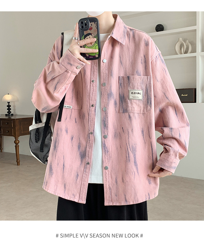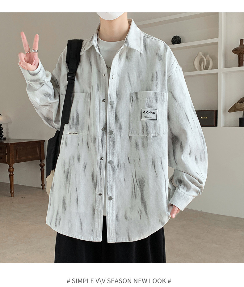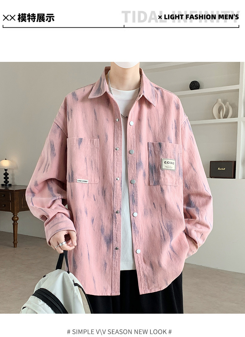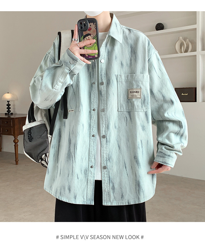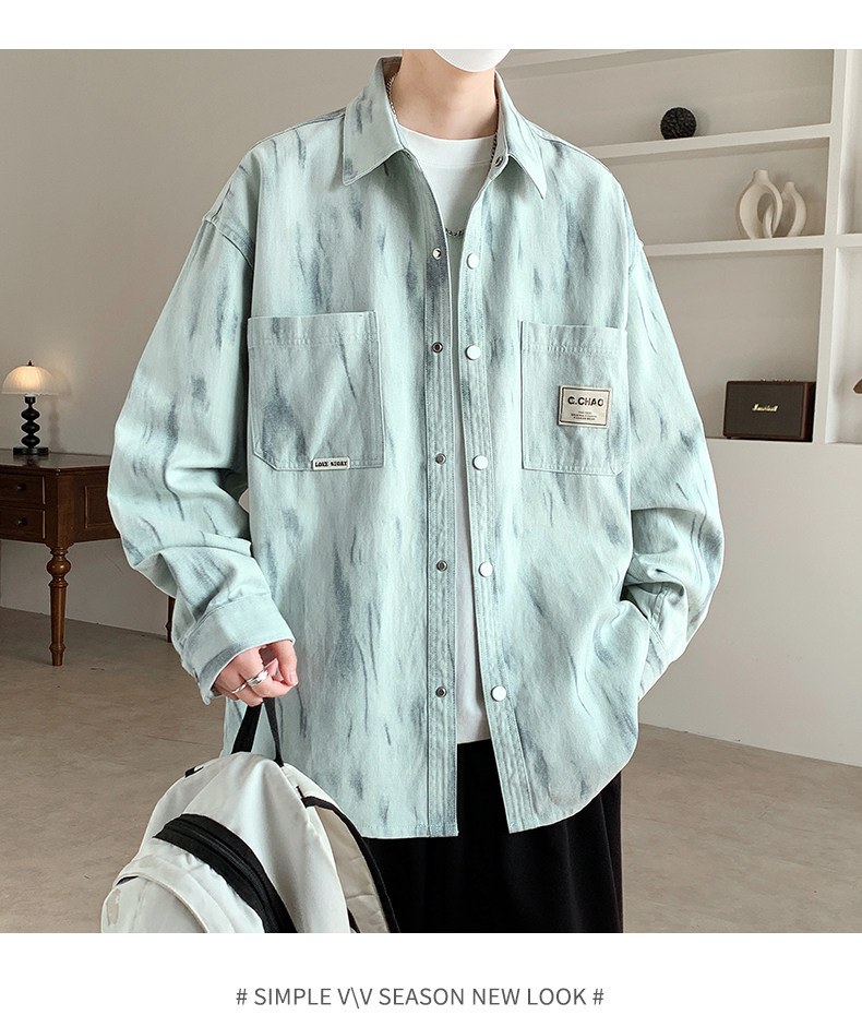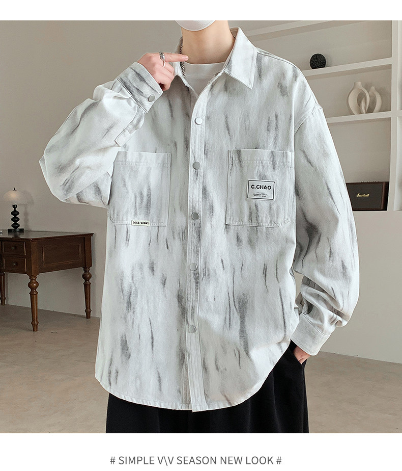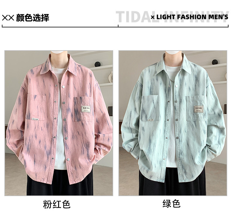 Pure Cotton Long-Sleeved Shirt for Men in Spring and Autumn, Stylish Tie-Dye Printed Workwear Top, Loose Casual Lapel Shirt Jacket