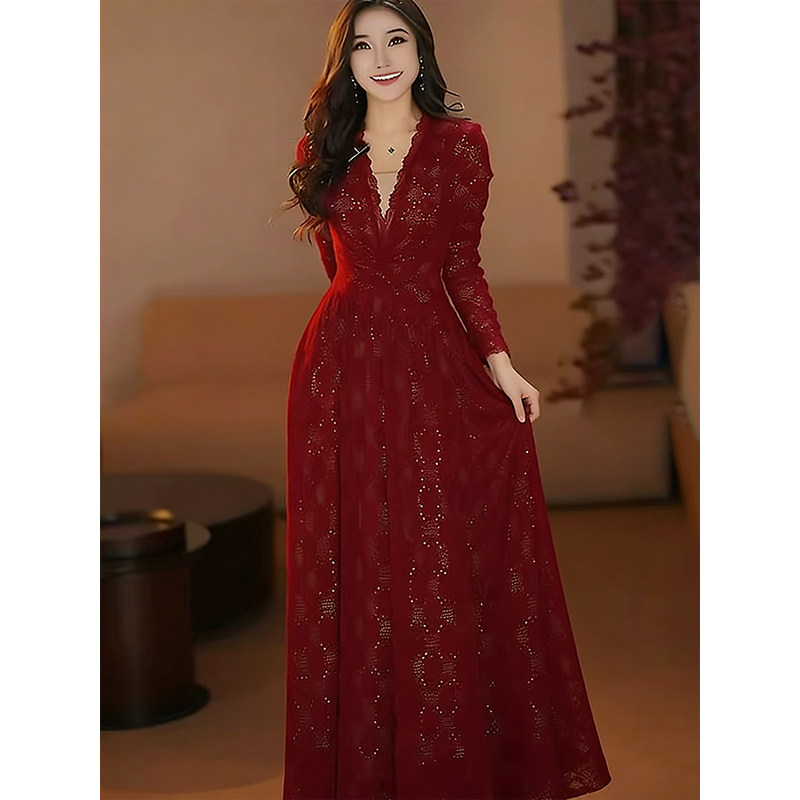 Mijie 2026 Spring Vintage Red Lace Dress for Women V-Neck Waist-Cinching Slimming Long Dress High-End Elegant Dress