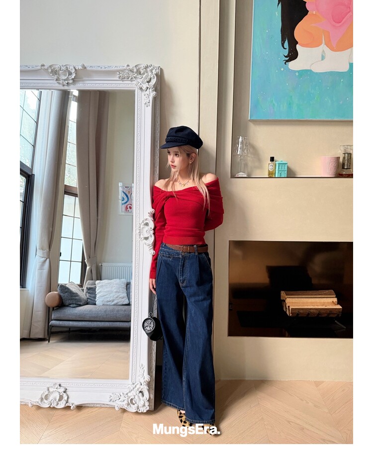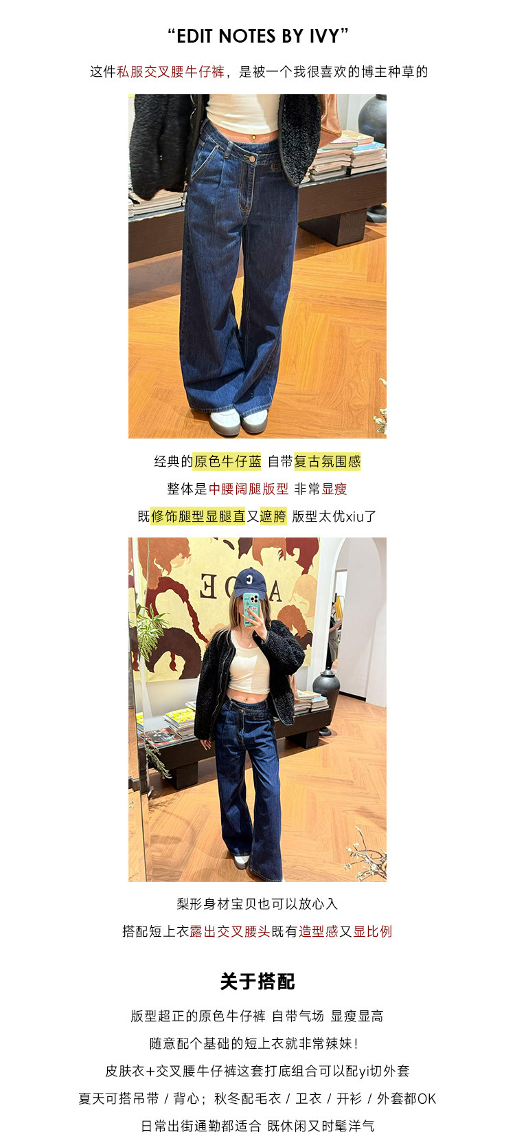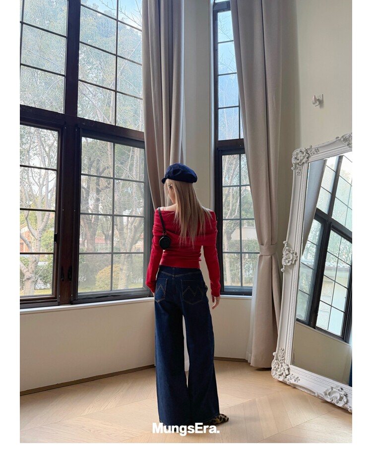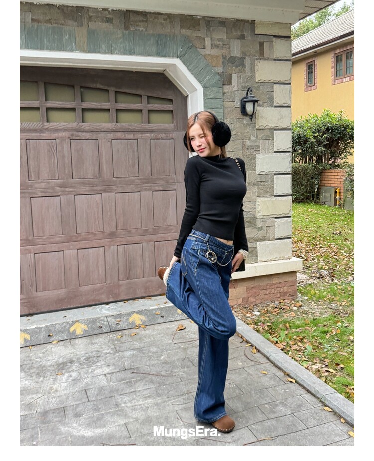 Mungsera "Cross-Waist" Ivy Casual Deep Blue Mid-Low Waist Denim Wide-Leg Pants Versatile Slimming Retro Style