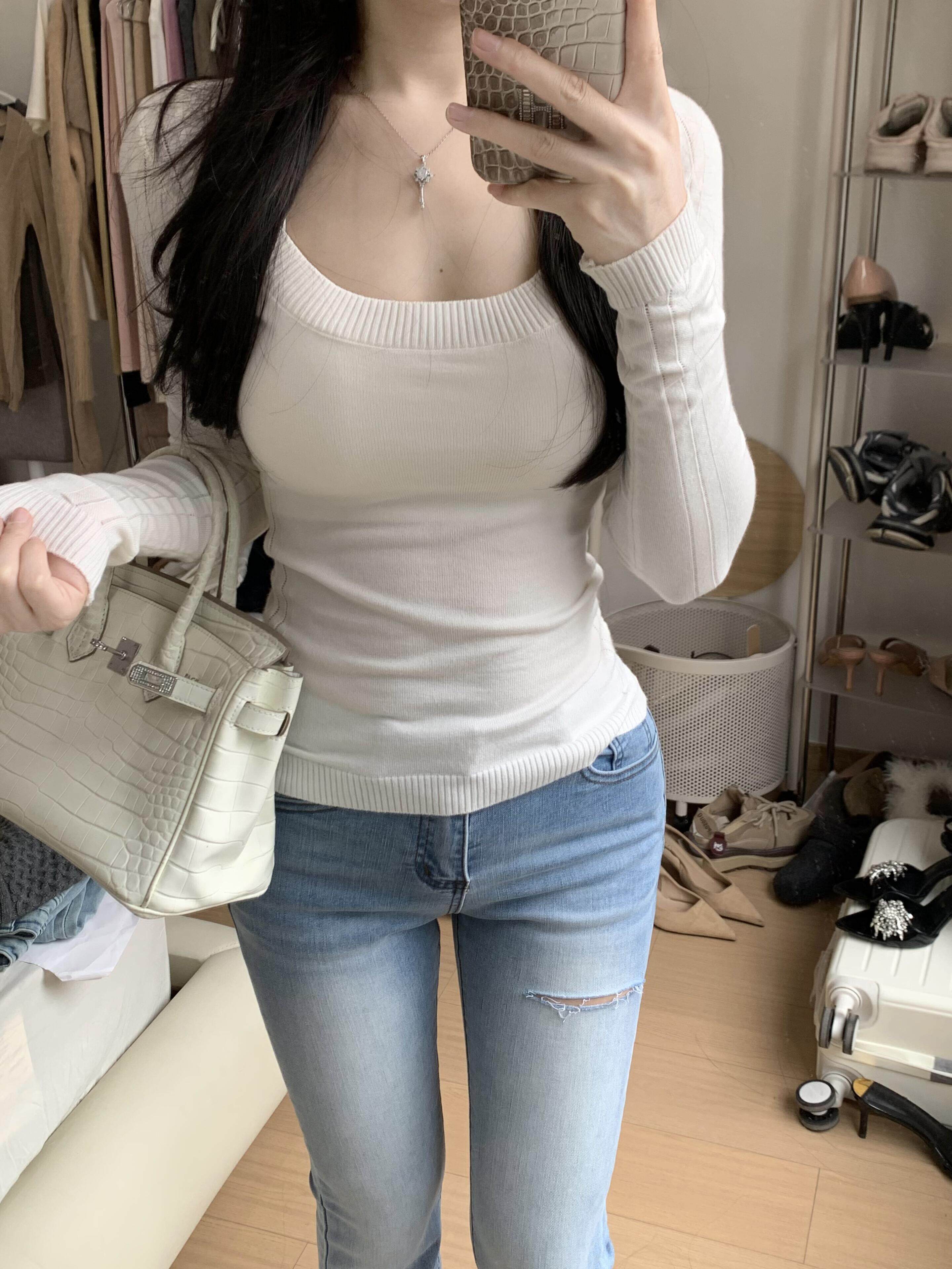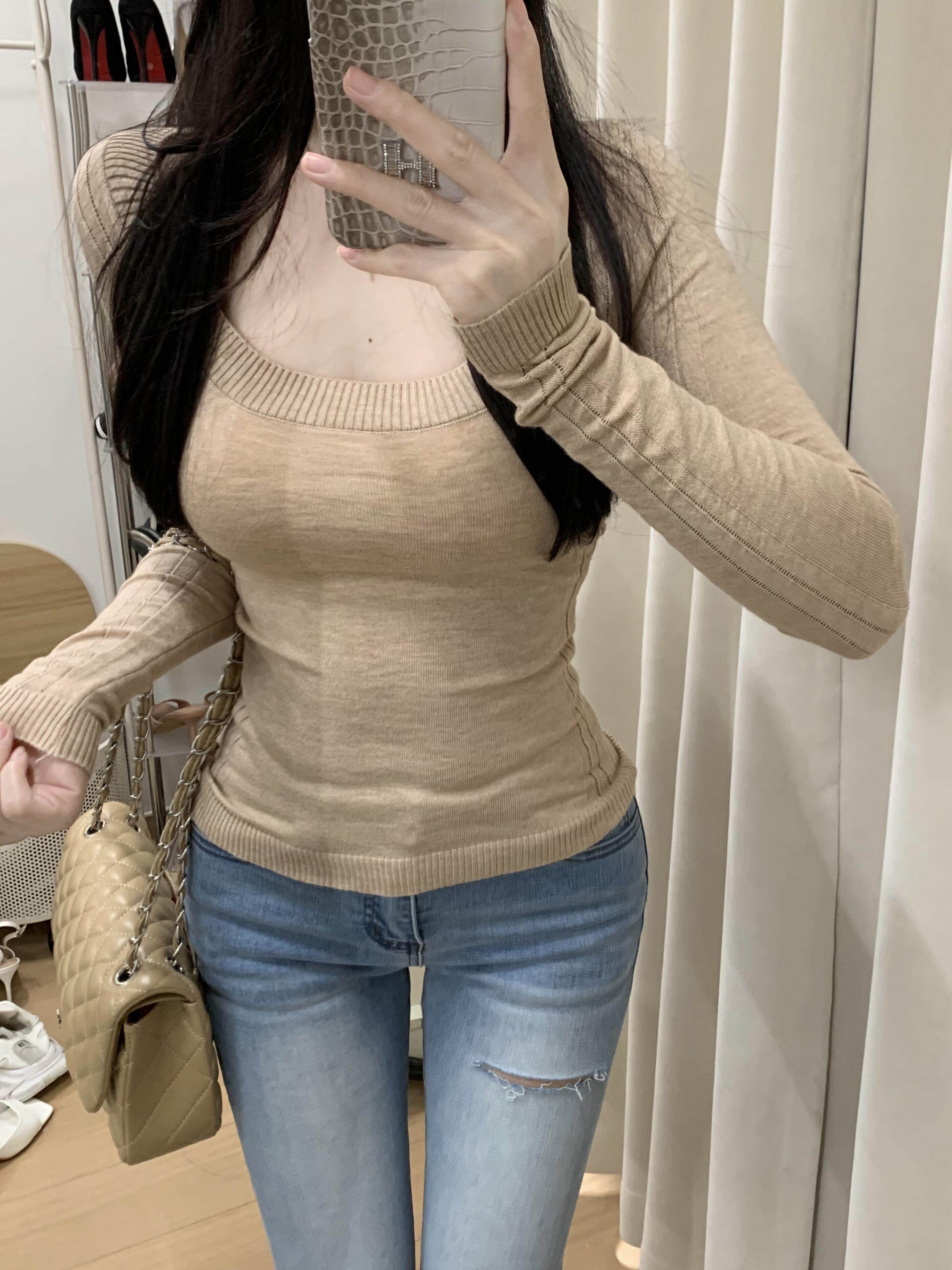 Popw Slim Fit Square Neck Basic Versatile Slimming Solid Color Long Sleeve T-Shirt Casual Top for Women